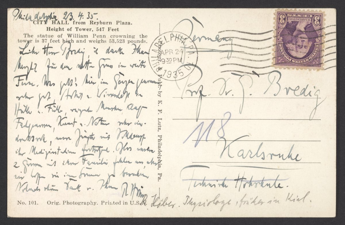 Small JPG1200 x 1836px — 286 KBFull-sized JPG2294 x 3510px — 816 KBOriginal fileTIFF — 2294 x 3510px — 23.1 MBRudolf Höber (1873-1953), a German physician and physiologist, updates Georg Bredig (1868-1944) on his new life in Philadelphia, Pennsylvania. Höber opposed National Socialism and was consequently removed from his positions as a professor and the rector of the Christian-Albrecht University of Kiel in the autumn of 1933. He fled Germany with his family to the United States, where he worked at the Pennsylvania Medical School.