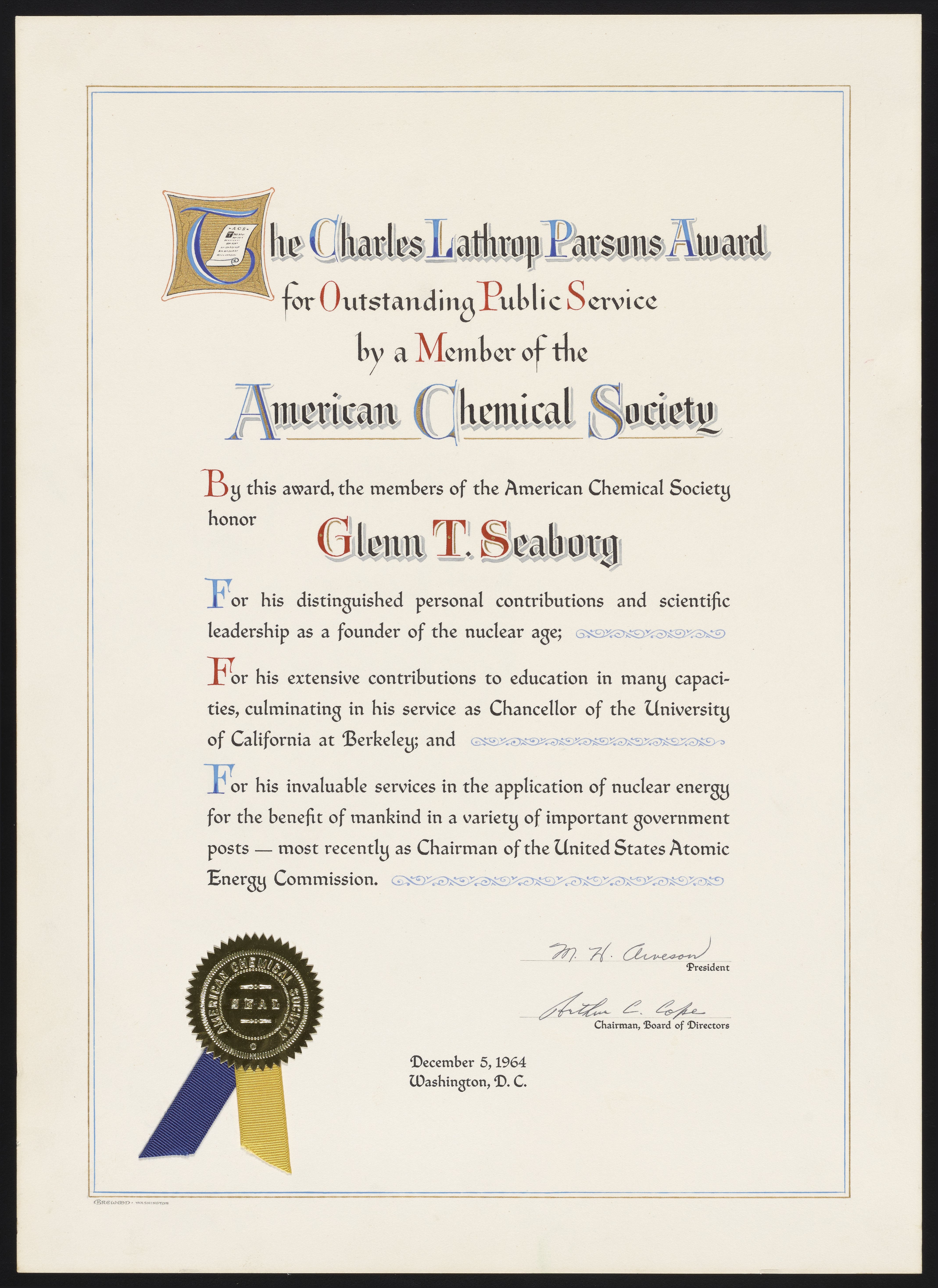 American Chemical Society. “Certificate Presenting Charles Lathrop Parsons Award to Glenn Seaborg,” December 5, 1964. Records of the Lawrence Berkeley National Laboratory - Nuclear Division, Folder 1. Science History Institute. Philadelphia. https://digital.sciencehistory.org/works/9c67wm919.
