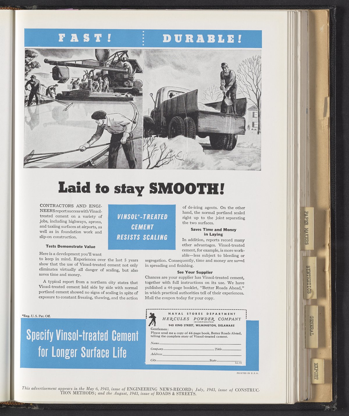 Hercules Incorporated. “Fast! Durable! Laid to Stay Smooth!” 1943 Hercules Advertisements, 1943. Records of Hercules Incorporated, Volume 1943. Science History Institute. Philadelphia. https://digital.sciencehistory.org/works/9c67wn665.