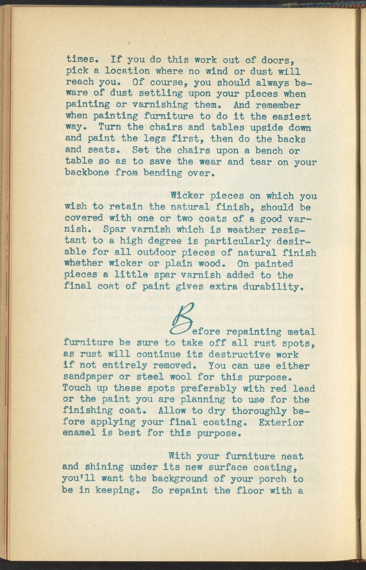 Booklet corresponding to a radio broadcast program created by the National Paint, Varnish, and Lacquer Association. The booklet discusses how to decorate a porch for a home. Provides suggestions for furniture, color schemes, and maintenance of outdoor furniture. Includes instructions for painting outdoor furniture and describes a porch for inspiration. Includes small stylized illustrations throughout and decorated covers.