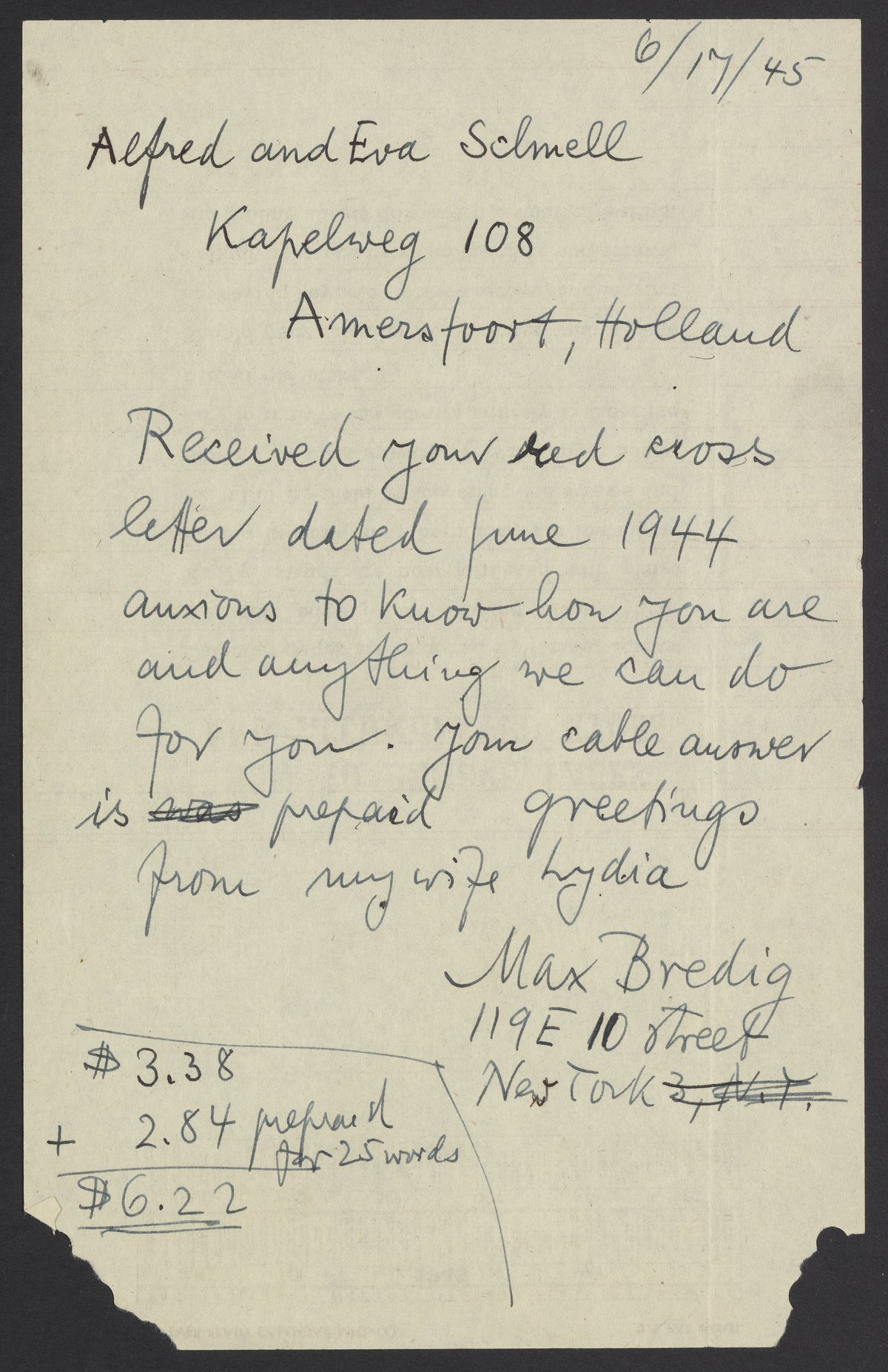 Small JPG1200 x 1854px — 366 KBLarge JPG2880 x 4450px — 2.2 MBFull-sized JPG3244 x 5012px — 2.7 MBOriginal fileTIFF — 3244 x 5012px — 46.6 MBLetter addressed to Alfred Schnell (1900-1944) and Eva Schnell (1913-1944) from Max Albert Bredig ( 1902-1977). Bredig asks how the Schnells are and tells them he has prepaid a cable for their answer.