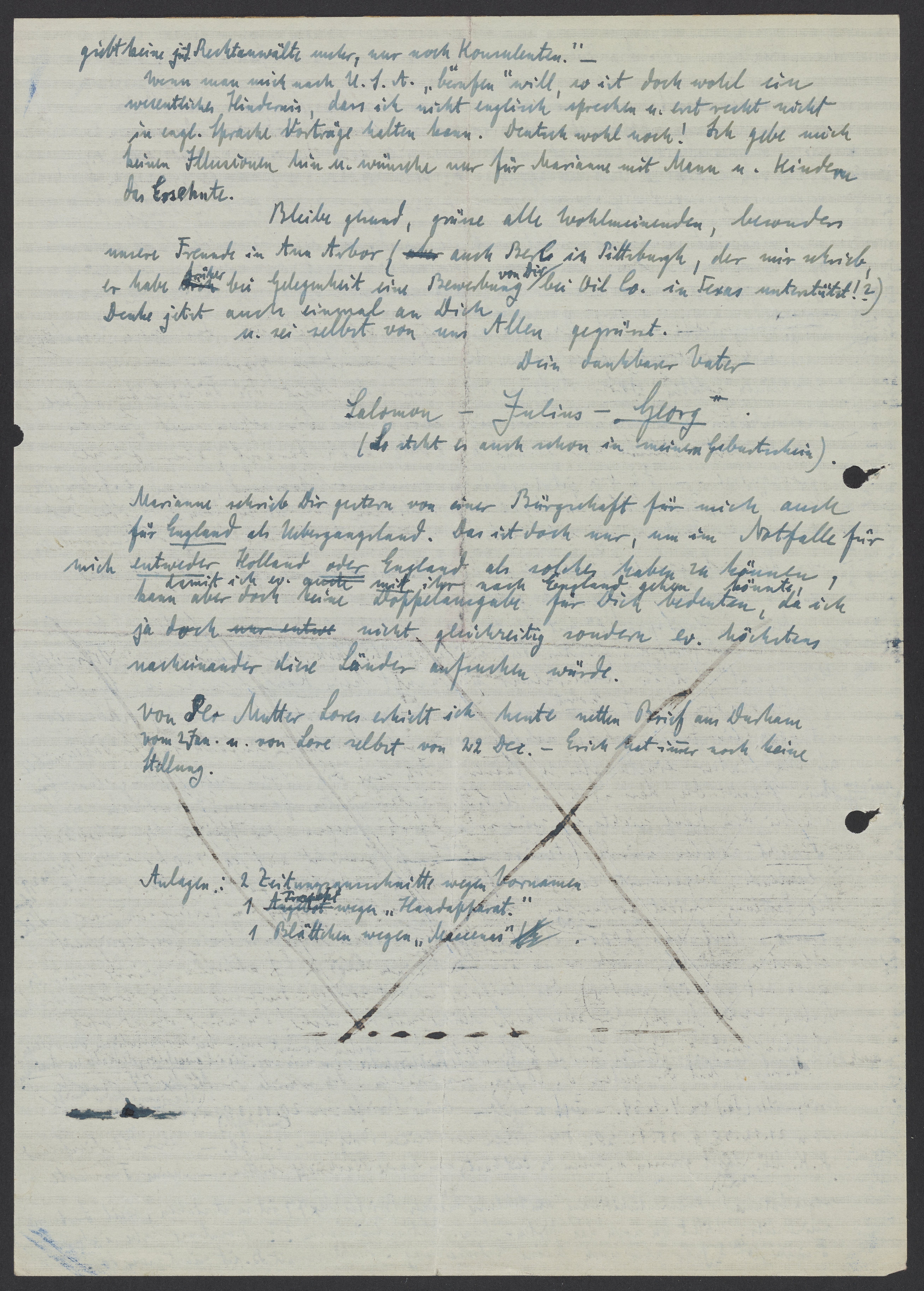 Marianne schrieb Dir gestern von einer Bürgschaft für mich auch für England als Uebergangsland. Das ist doch nur, um im Notfalle für mich entweder Holland oder England als solches haben zu können, damit ich ev. auch mit ihr nach England gehen könnte, kann aber doch keine Doppelangabe für Dich bedeuten, da ich ja doch nicht gleichzeitig, sondern ev. höchstens nacheinander diese Länder aufsuchen würde.