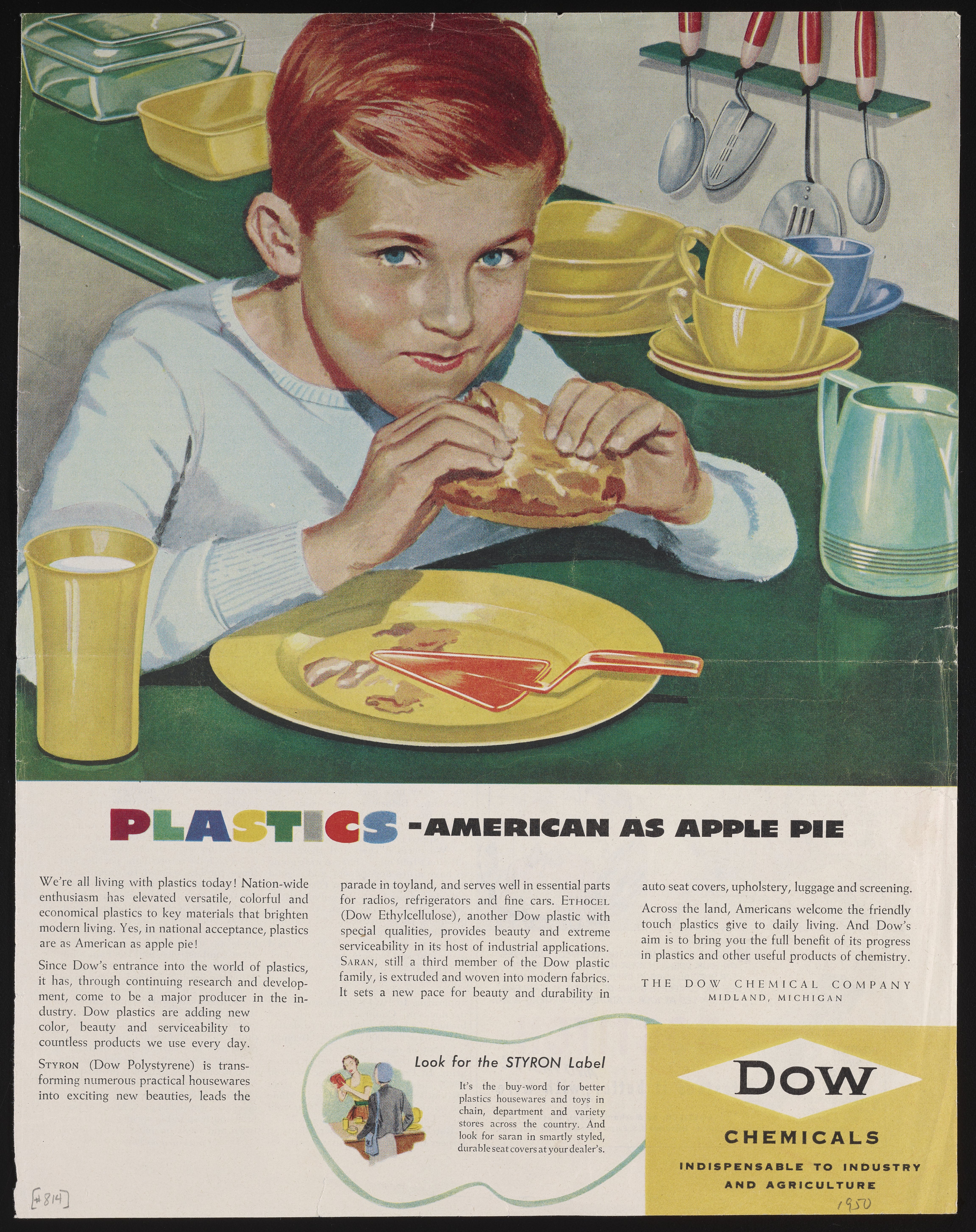 Dow Chemical Company. “Plastics: American as Apple Pie,” March 11, 1950. Advertisements from the Dow Chemical Historical Collection, Box 9. Science History Institute. Philadelphia. https://digital.sciencehistory.org/works/9i35s67.