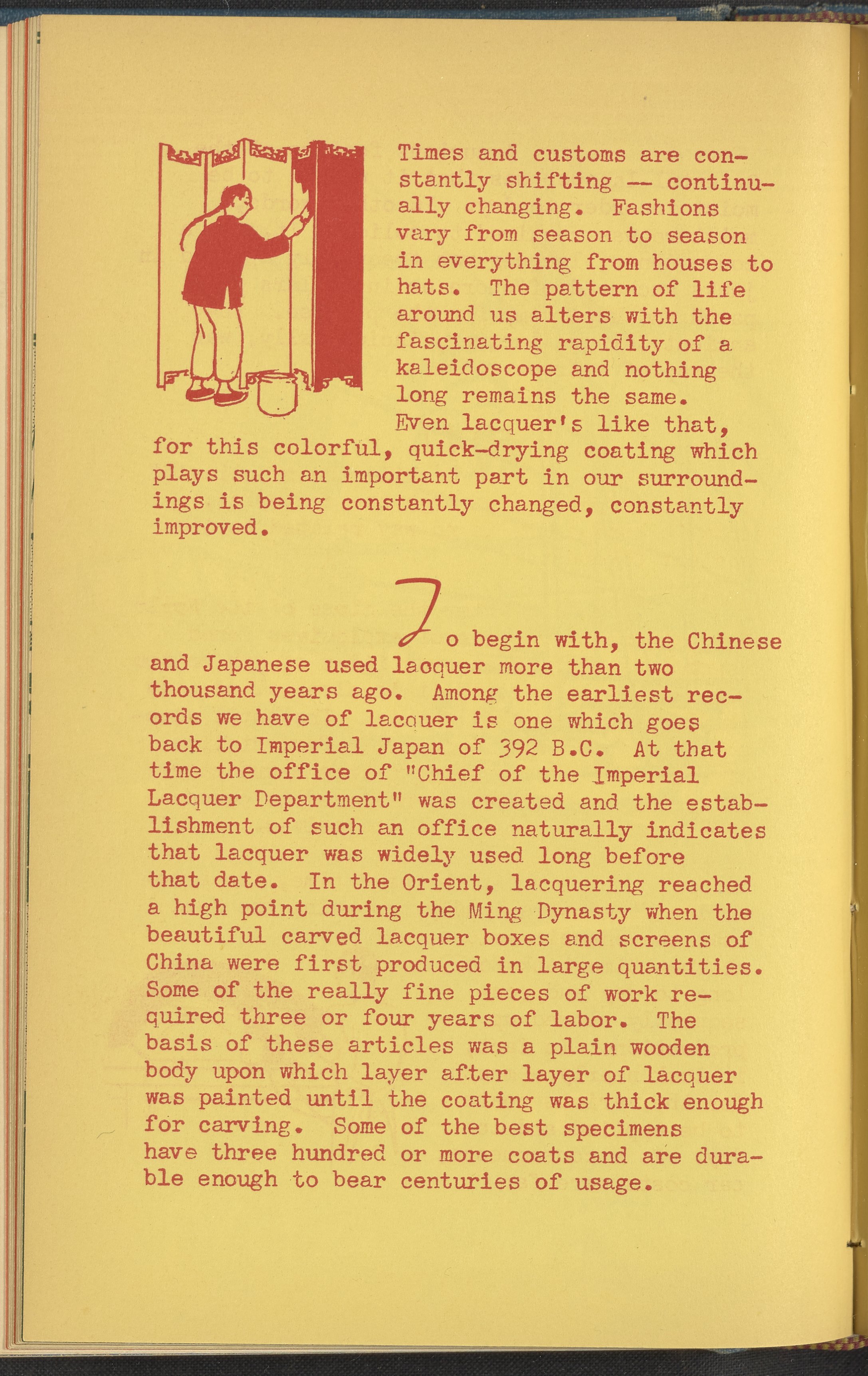 Booklet corresponding to a radio broadcast program created by the National Paint, Varnish, and Lacquer Association. The booklet discusses the origins of lacquer in East Asian countries such as China and Japan. Then, describes how the demand for lacquer grew tremendously in post-war America. Finally, lists many common uses of lacquer and tips for applying it. Includes small stylized illustrations throughout and decorated covers, which include some racially-stereotyped imagery of East Asian people.