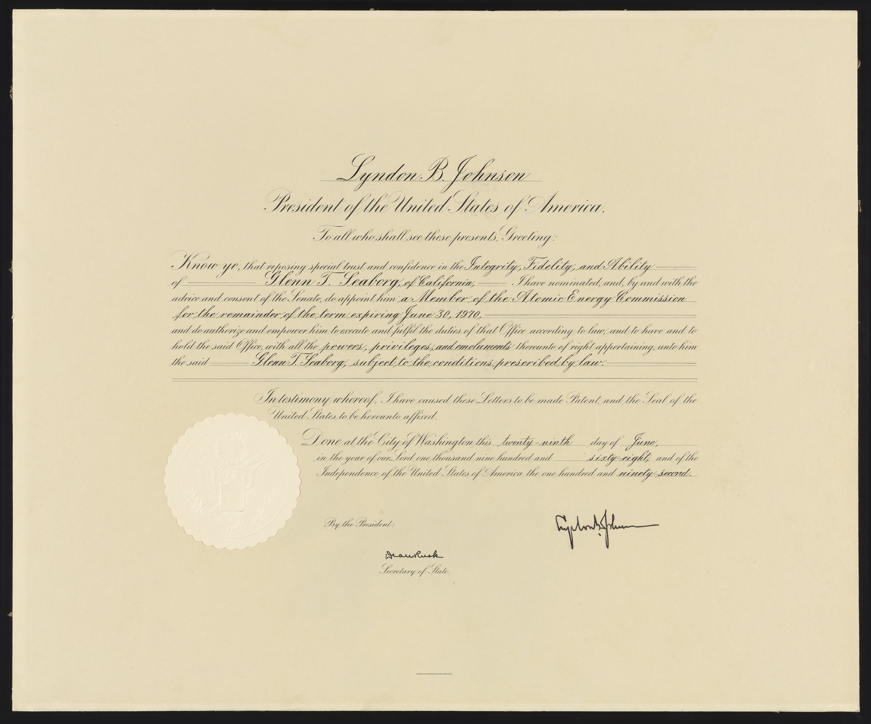 United States. Bureau of Engraving and Printing. “Certificate Appointing Glenn Seaborg as a Member of the Atomic Energy Commission,” June 29, 1968. Records of the Lawrence Berkeley National Laboratory - Nuclear Division, Folder 1. Science History Institute. Philadelphia. https://digital.sciencehistory.org/works/9k41zd51t.