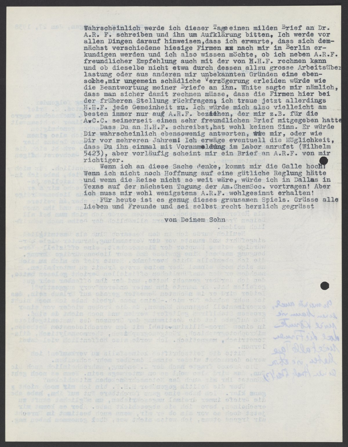 Wenn ich an diese Sache denke , kommt mir die Galle hoch! Wenn ich nicht noch Hoffnung auf eine gütliche Reglung hätte und wenn die Reise nicht so weit wäre, würde ich in Dallas in Texas auf der nächsten Tagung der Am. Chem. Soc. vortragen! Aber ich muss mir wohl wenigstens A.R.F. wohlgesinnt erhalten!