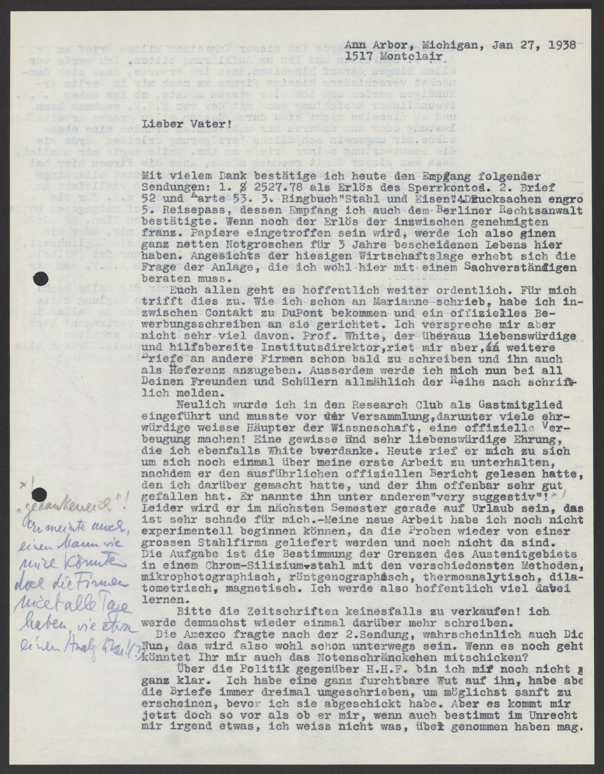 Mit vielen Dank bestätige ich heute den Empfang folgender Sendungen: 1. $2527.78 als Erlös des Sperrkontos 2. Brief 52 und Karte 53. 3. Ringbuch "Stahl und Eisen." 4. Drucksachen engro 5. Reisepass. dessen Empfang ich auch dem Berliner Rechtsanwalt bestätigte. Wenn noch der Erlös der inzwischen genehmigten franz. Papiere eingetroffen sein wird, werde ich also einen ganz netten Notgroschen für 3 Jahre bescheidenen Lebens hier haben. Angesichts der hiesigen Wirtschaftslage erhebt sich die Frage der Anlage, die ich wohl hier mit einem Sachverständigen beraten muss.