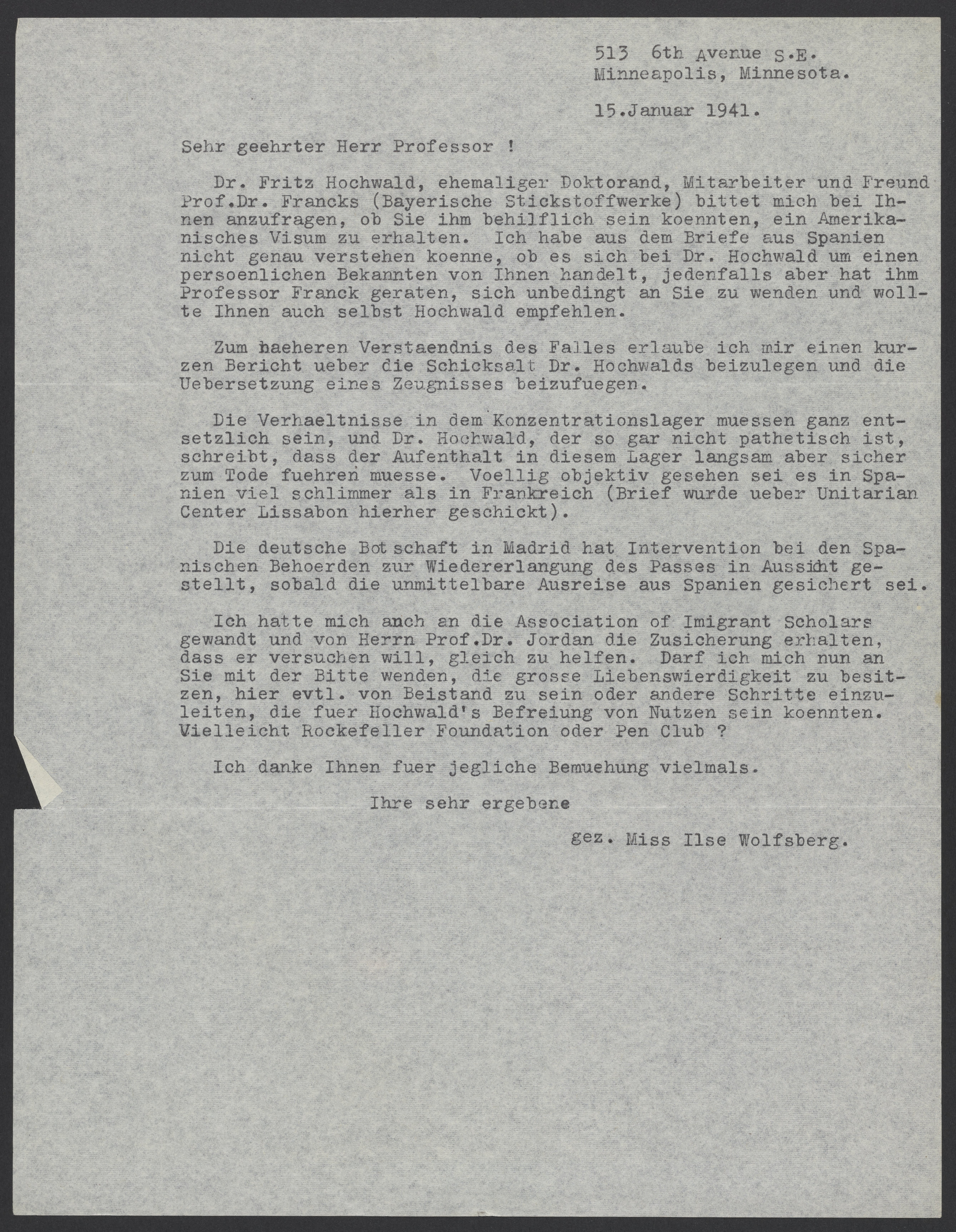 Dr. Fritz Hochwalds, ehemaliger Doktorand, Mitarbeiter und Freund Prof. Dr. Francks (Bayerischer Stickstoffwerke) bittet mir bei Ihnen anzufragen, ob Sie ihm behilflich sein könnten, ein Amerikanisches Visum zu erhalten. Ich habe aus dem Briefe aus Spanien nicht genau verstehen können, ob es sich bei Dr. Hochwald um einen persönlichen Bekannten von Ihnen handelt, jedenfalls aber hat ihm Professor Franck geraten, sich unbedingt an Sie zu wenden und wollte Ihnen auch selbst Hochwald empfehlen. Zum näheren Verständnis des Falles erlaube ich mir einen kurzen Bericht über die Schicksale Dr. Hochwalds beizulegen und die Übersetzung eines Zeugnisses beizufügen.