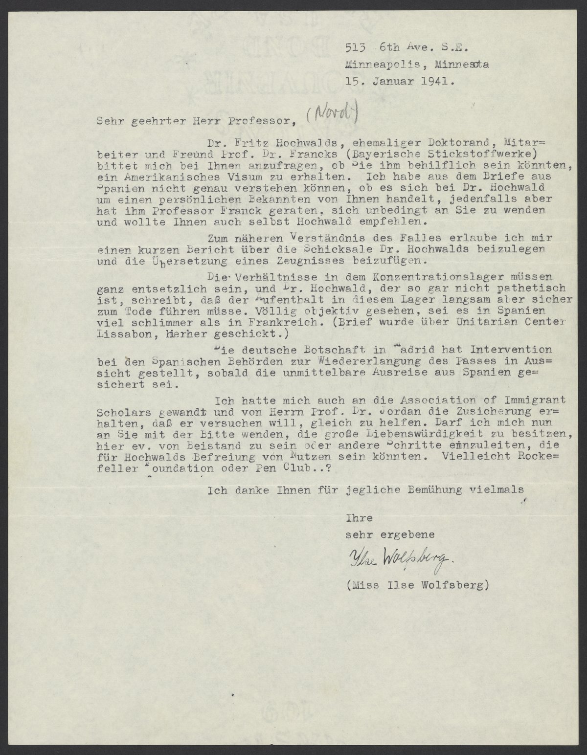 Small JPG1200 x 1544px — 296 KBLarge JPG2880 x 3706px — 1.5 MBFull-sized JPG5333 x 6863px — 4.6 MBOriginal fileTIFF — 5333 x 6863px — 105 MBIlse Wolfsberg asks Friedrich Franz Nord (1889–1973) if he would help her fiancé, Fritz Hochwald (1897-1968), obtain an American visa. At the time, Hochwald was held captive at a concentration camp in Madrid, Spain.