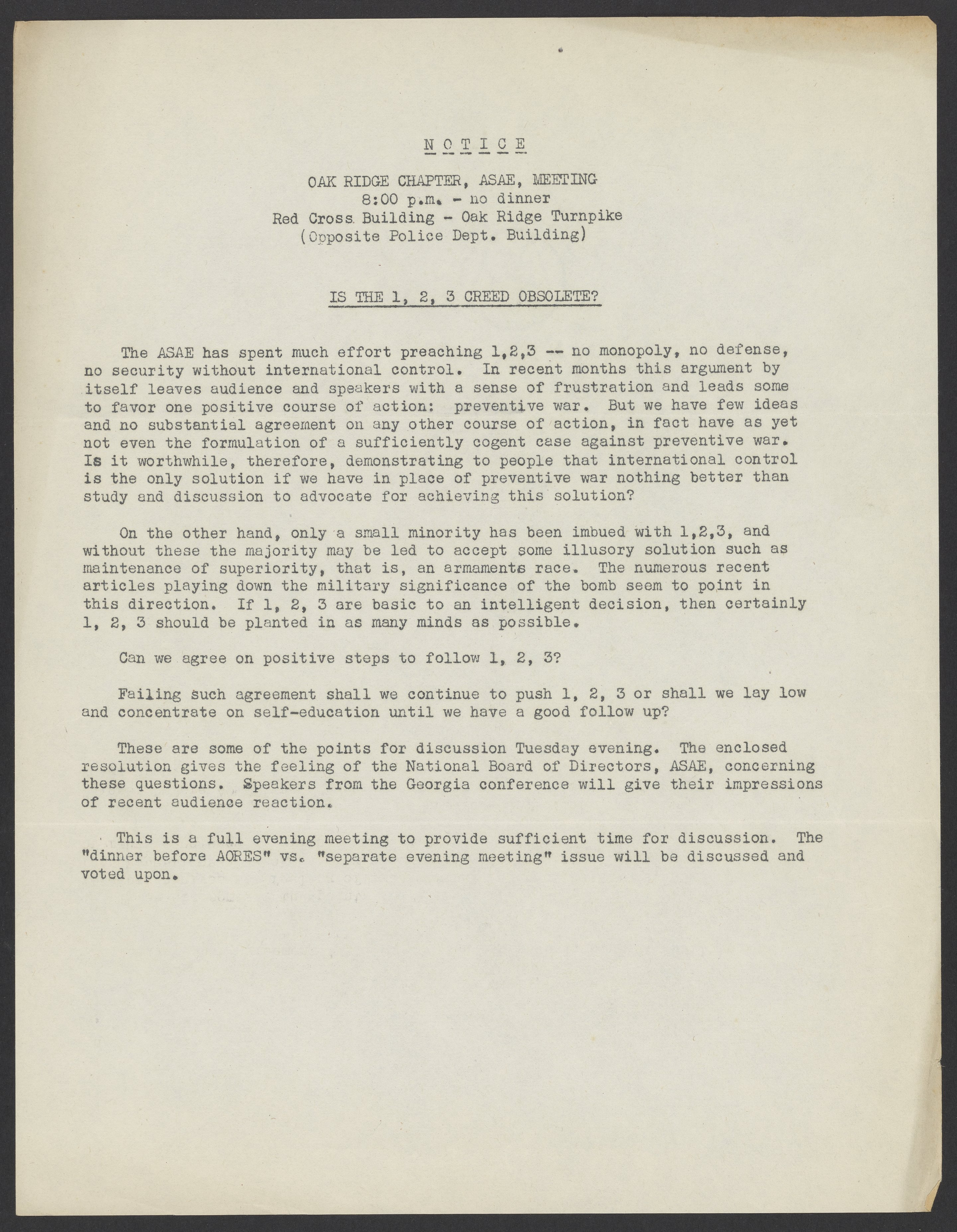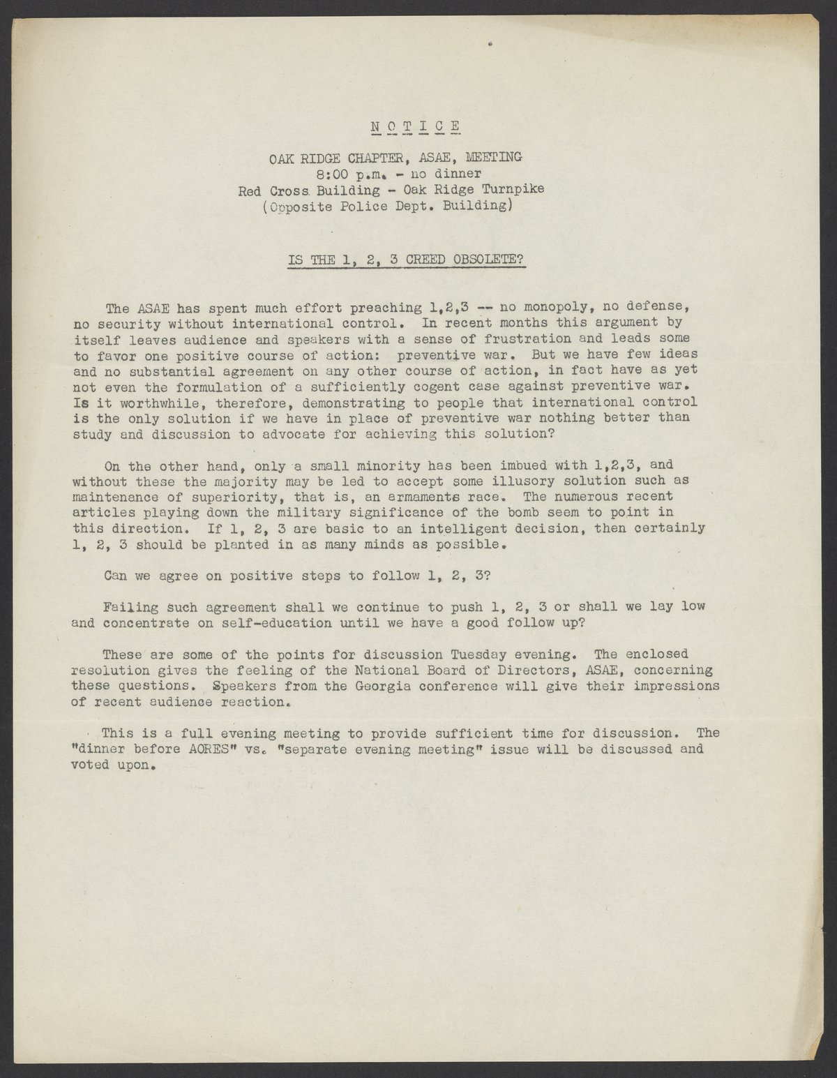 Meeting notice for the Oak Ridge chapter of the Association of Scientists for Atomic Education (ASAE). The meeting is set to discuss the "1, 2, 3 Creed": No monopoly, no defense, no security without international control.