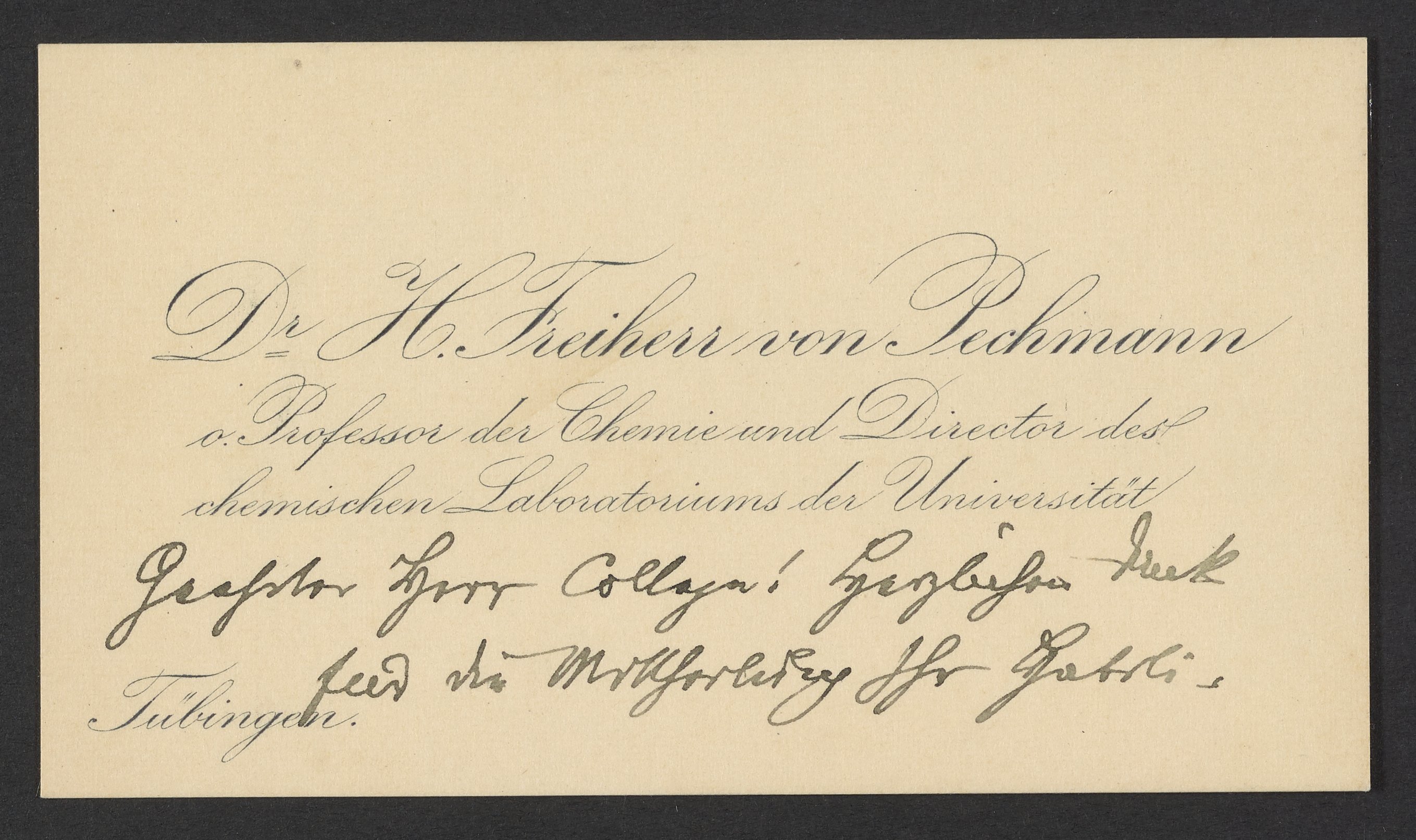 Pechmann, Hans von. “ Freiherr Von Pechmann's Personal Calling Card,” February 18, 1901. Papers of Georg and Max Bredig, Box 3, Folder 18. Science History Institute. Philadelphia. https://digital.sciencehistory.org/works/9n84a4c.