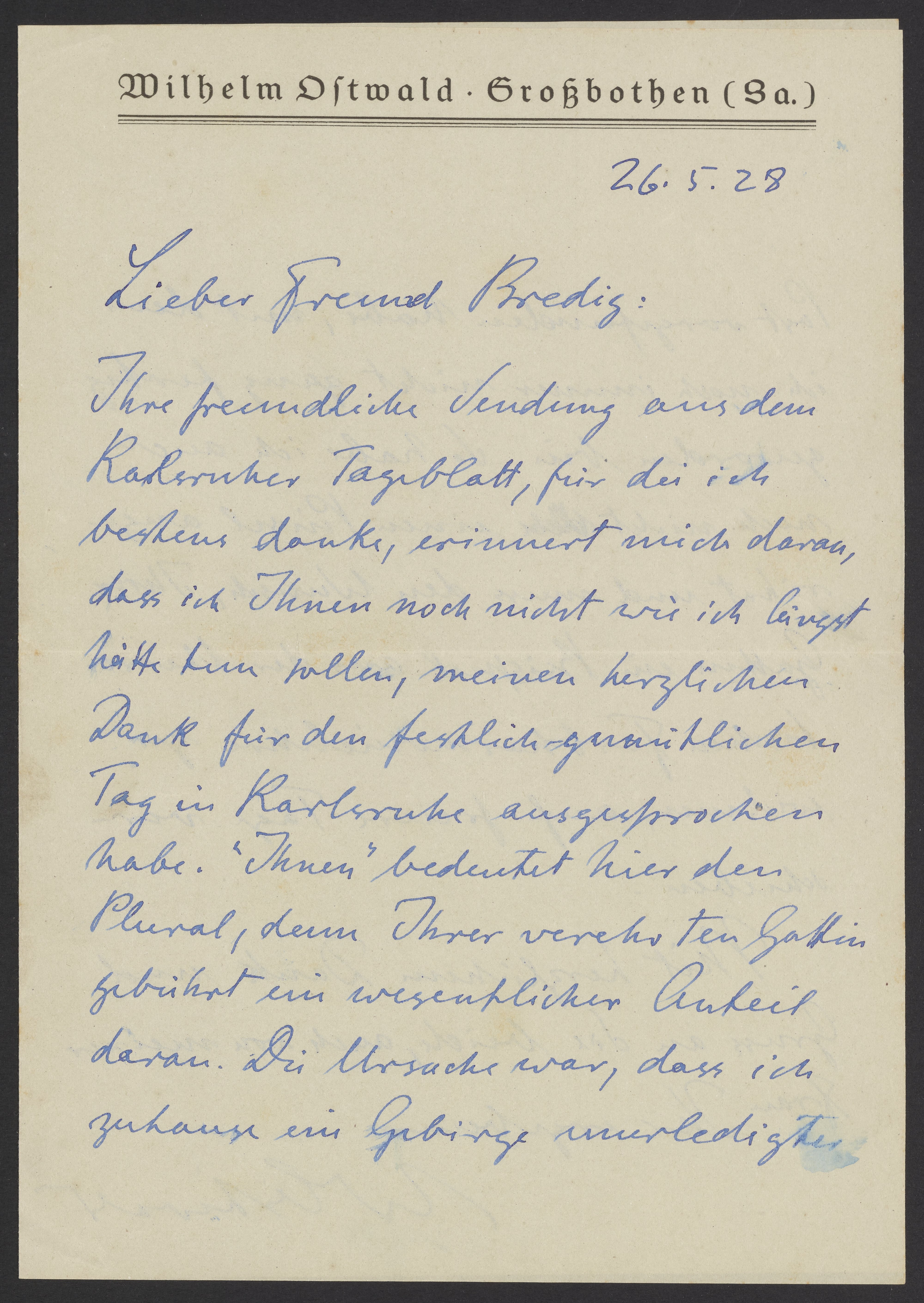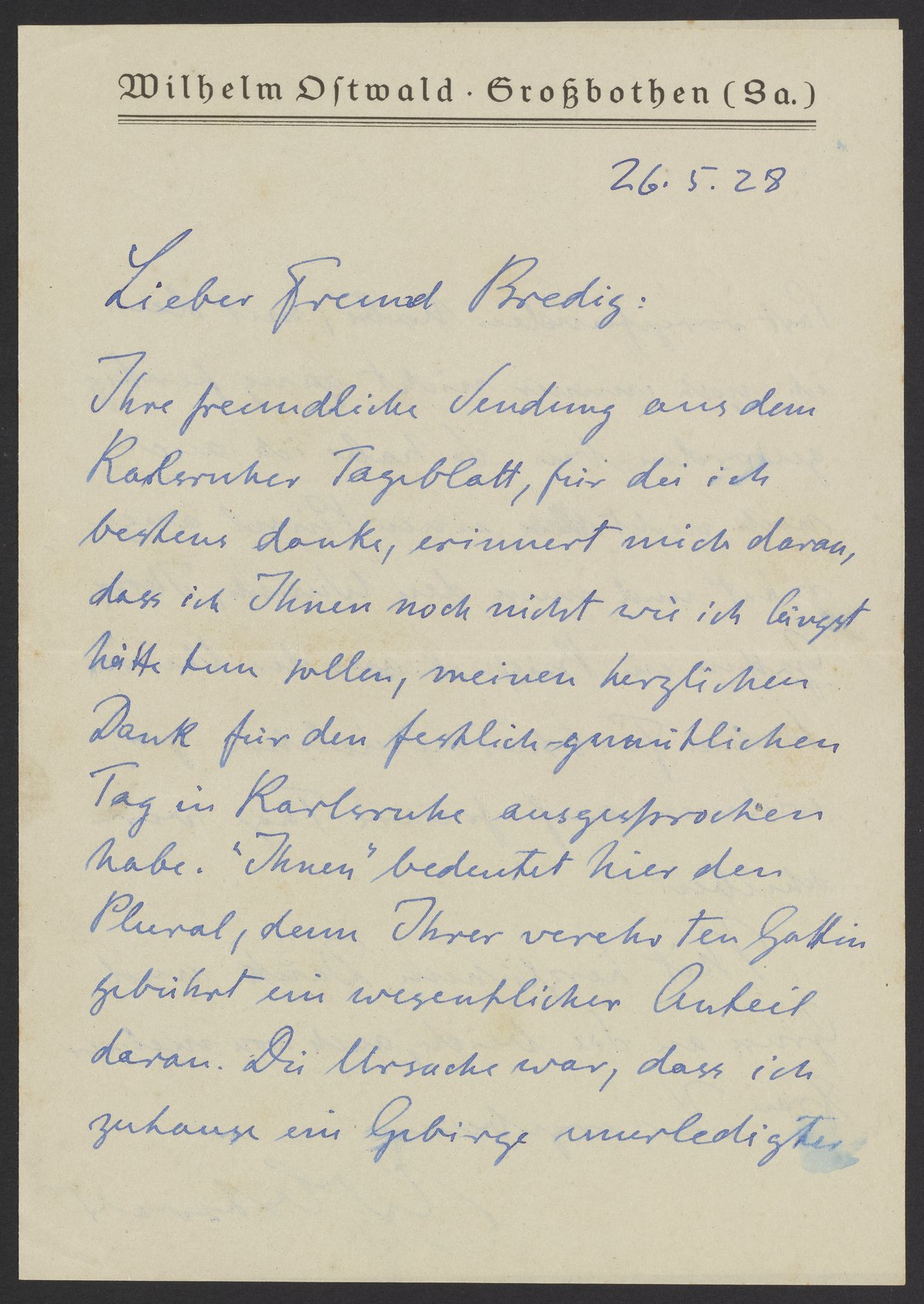 Letter from Wilhelm Ostwald to Georg Bredig, May 1928
