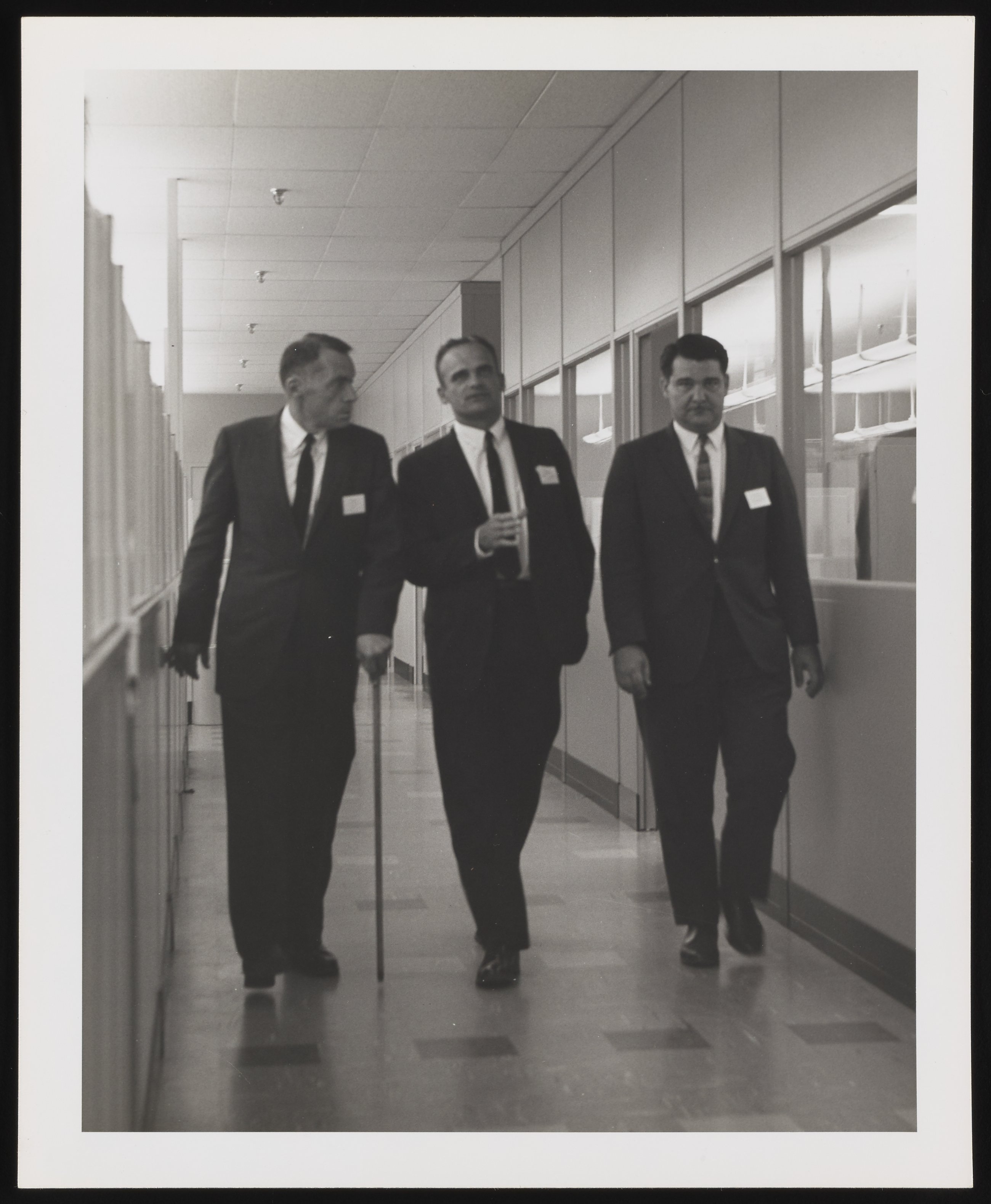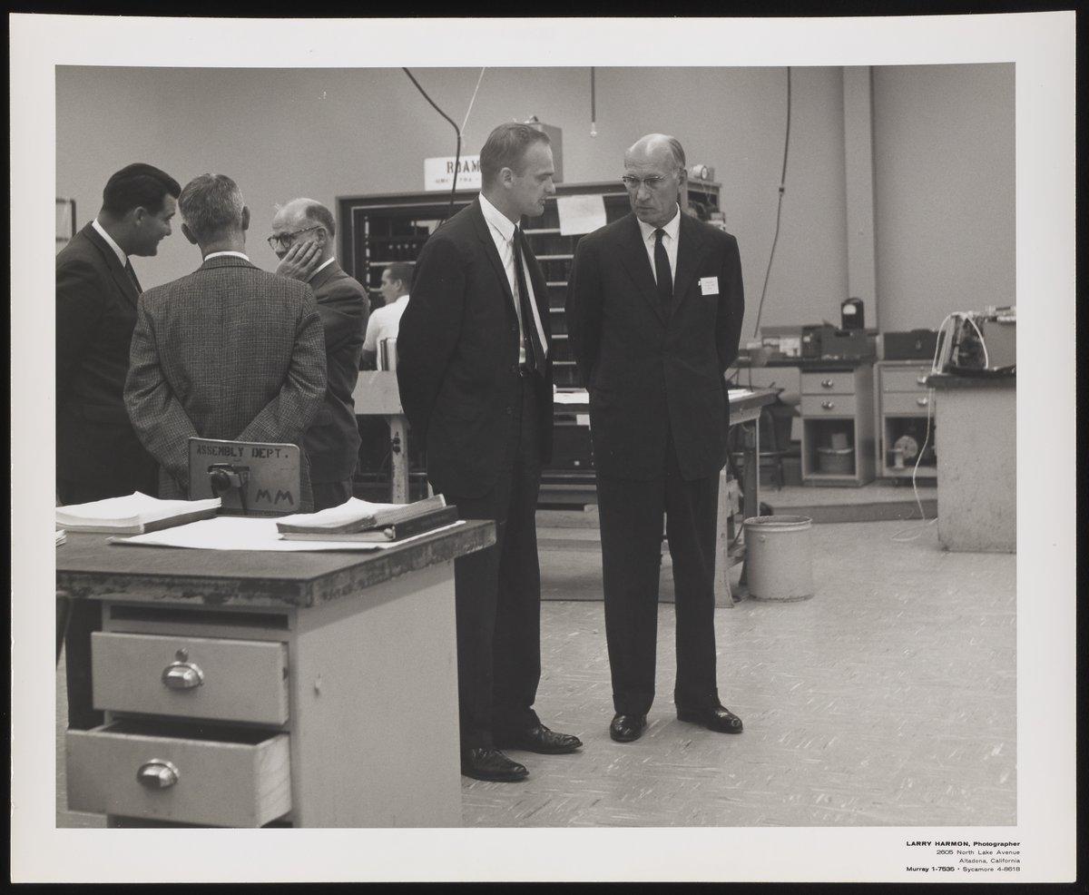 Small JPG1200 x 1458px — 153 KBFull-sized JPG2600 x 3158px — 596 KBOriginal fileTIFF — 2600 x 3158px — 23.6 MBArnold Beckman and unidentified men tour a facility, including a room that is apparently part of the Assembly Department.
