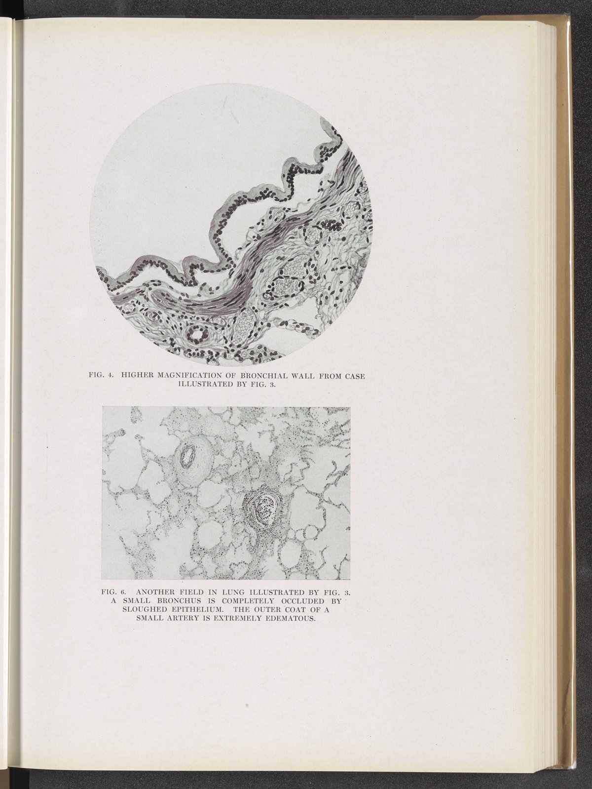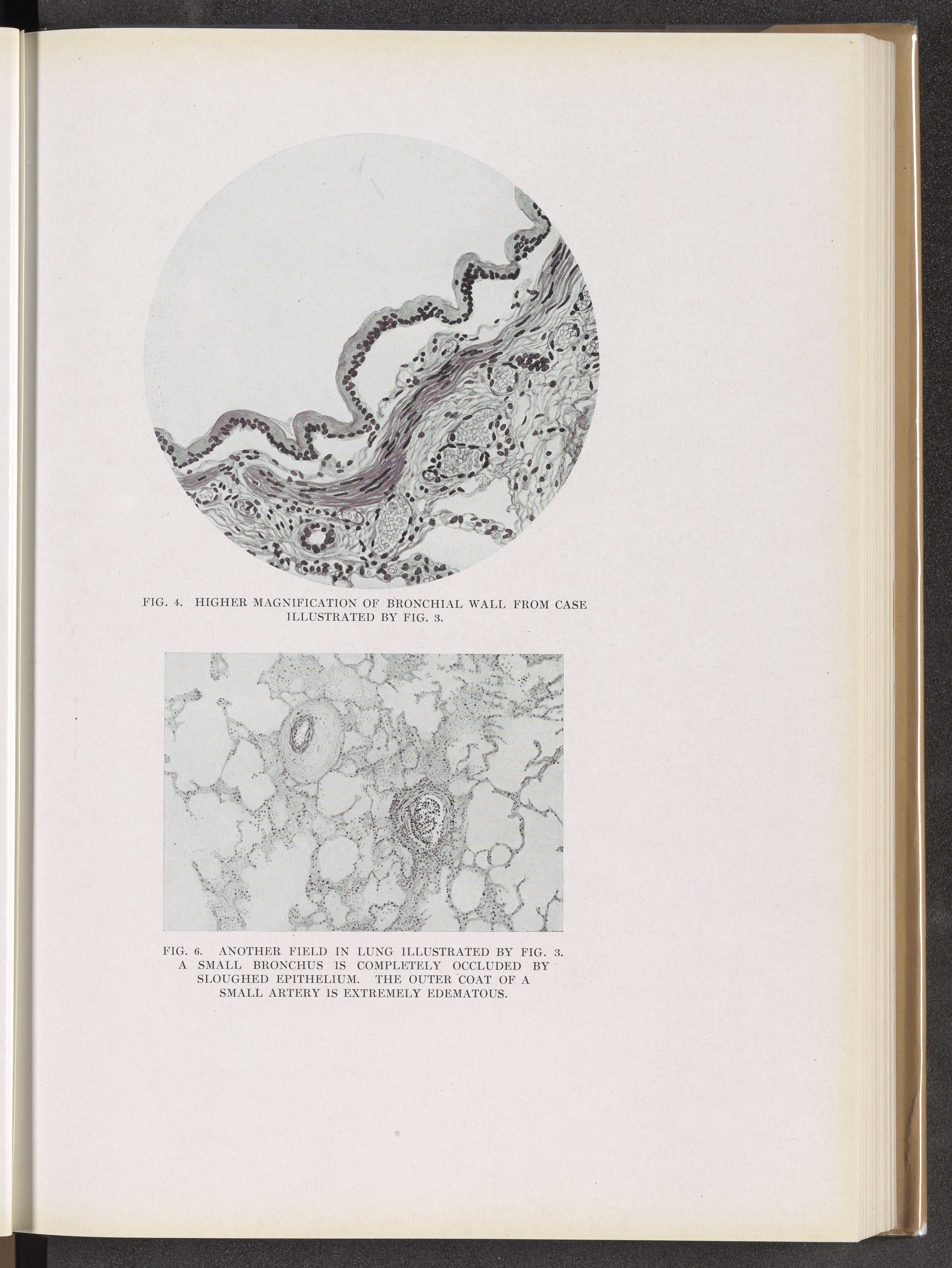 Fig. 4: Higher magnification of bronchial wall from case illustrated by Fig. 3. Fig. 6: Another field in lung illustrated by Fig. 3.