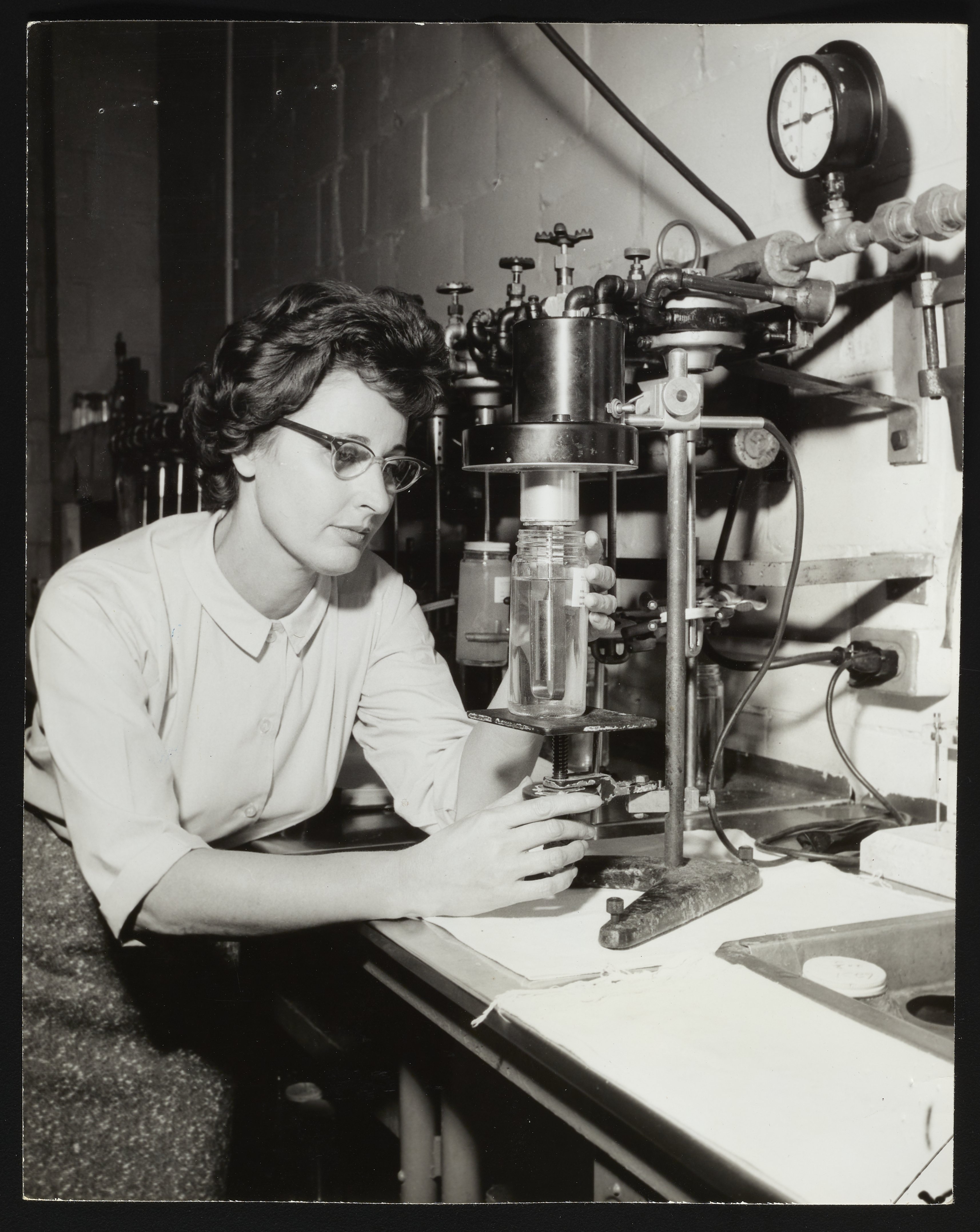 Hercules Incorporated. “Mildred Wells Using Brookfield Viscometer at Hercules Hopewell Plant,” November 1961. Photographs from the Records & Ephemera of Hercules Incorporated, Box 1, Folder 38. Science History Institute. Philadelphia. https://digital.sciencehistory.org/works/9s161692z.