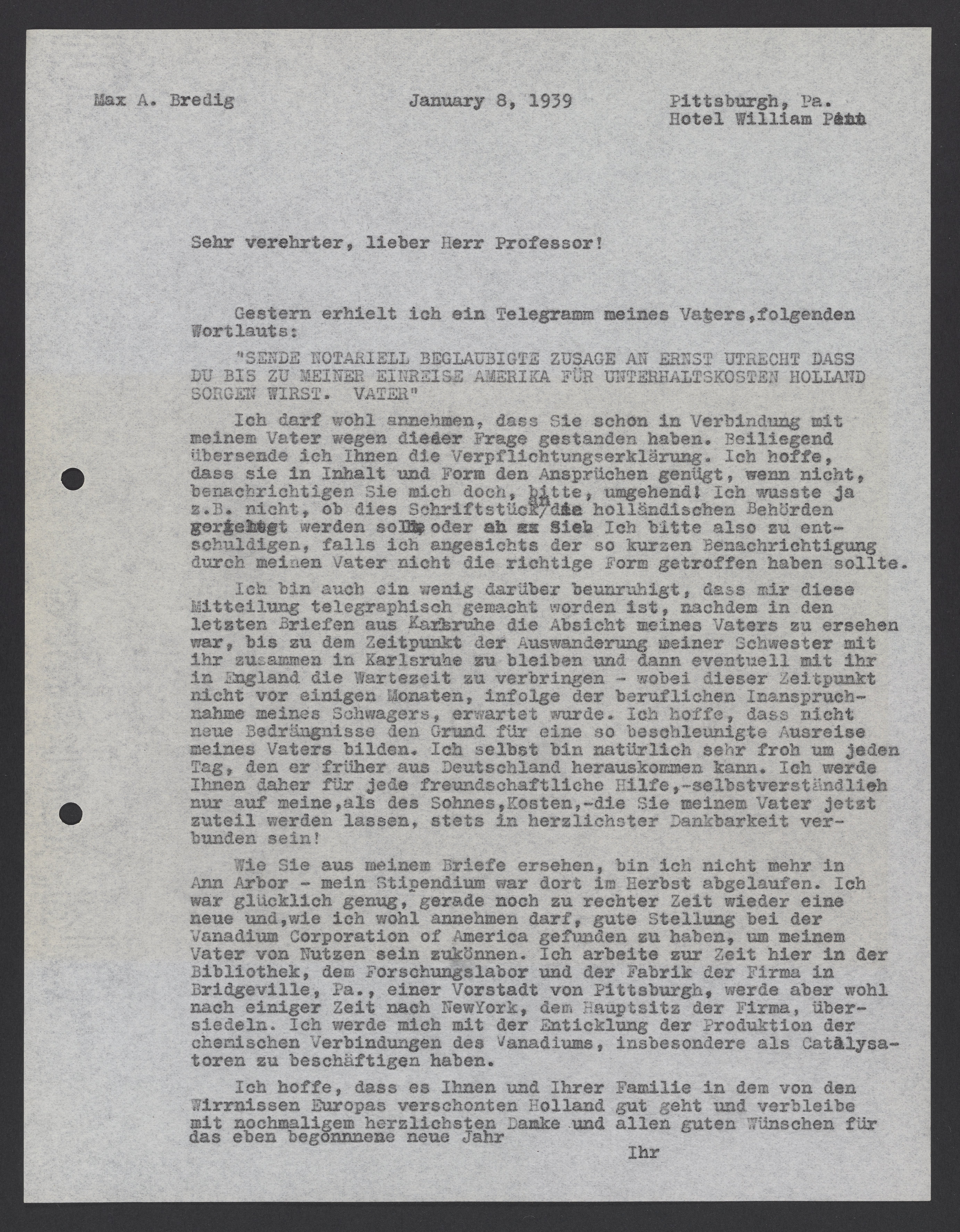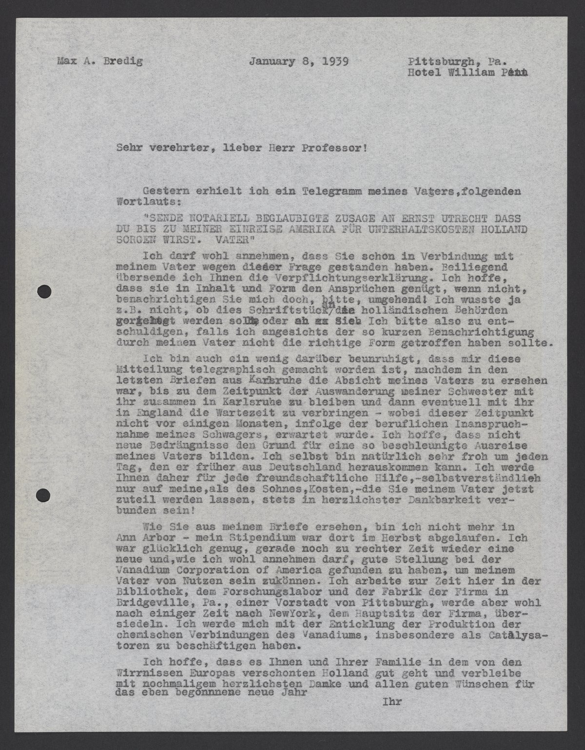 Letter from Max Bredig to Ernst Cohen, January, 1939