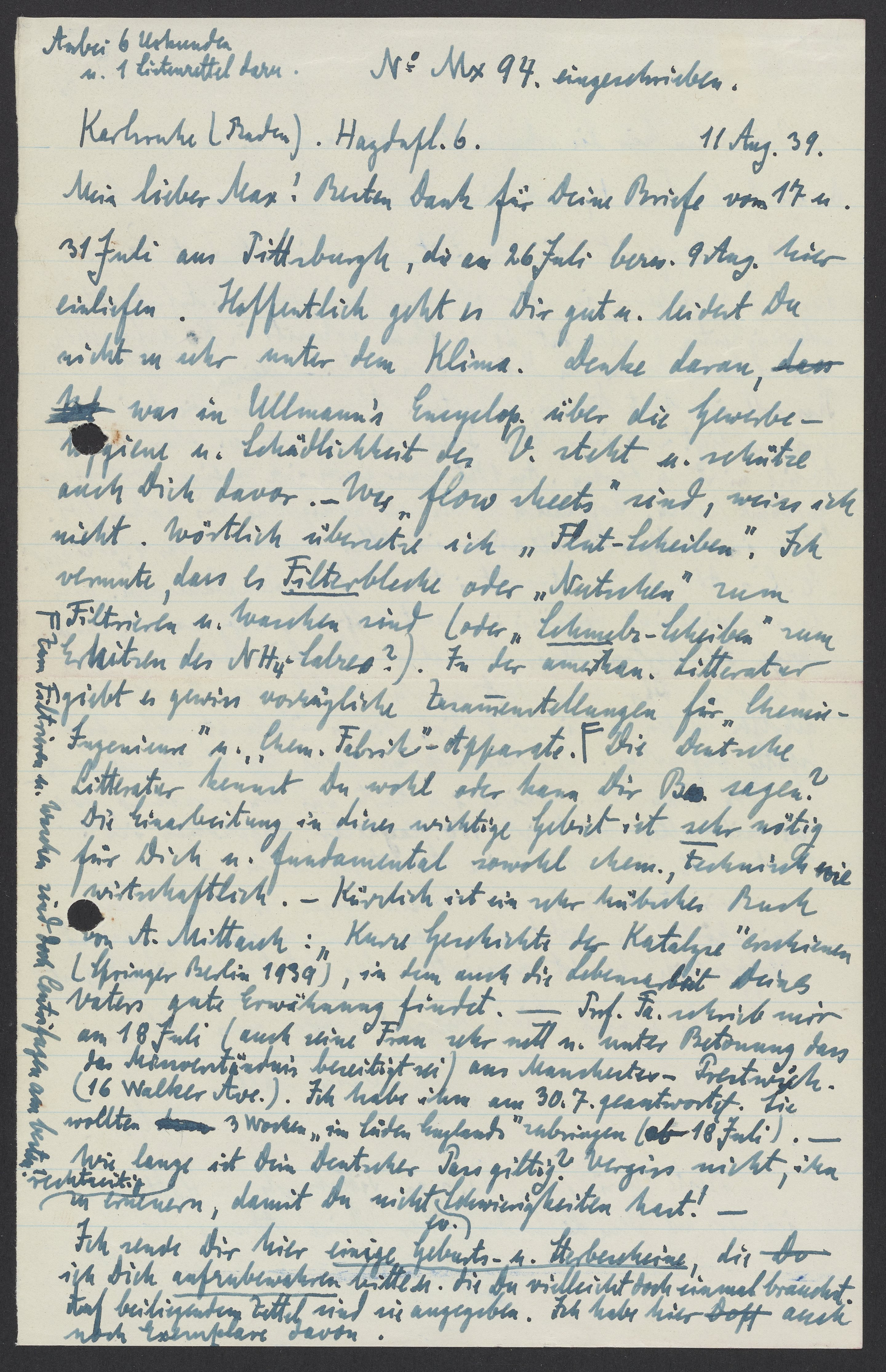 Mein lieber Max! Besten Dank für Deine Briefe vom 17. u. 31. Juli aus Pittsburgh, die am 26. Juli bzw. 9. Aug. hier einliefen. Hoffentlich geht es Dir gut u. leidest Du nicht zu sehr unter dem Klima. Denke daran, was in Ullmann’s Encyclop. ueber die Gewerbehygiene u. Schädlichkeit des. V. steht u. schütze auch Dich davor. – Was „flow sheets sind“ weiss ich nicht. Wörtlich übersetze ich „Flut-Scheiben.“ Ich vermute, dass es Filterbleche oder „Nutschen“ zu Filtrieren u. Waschen sind (oder „Schmelz-Scheiben“ zum Erhitzen des NH4-Salzes?) In der amerikan. Litteratur gient es gewiss vorzügliche Zusammenstellungen für „Chemie u. Ingenieure“ u. „Chem. Fabrik“- Apparate.* Die Deutsche Litteratur kennst Du wohl oder kann Dir B. sagen? Die Einarbeitung in dieses wichtiges Gebiet ist sehr nötig für Dich u. fundamental sowohl chem., technisch wie wirtschaftlich. – Kürzlich ist ein sehr hübsches Buch von A. Mittasch: „Kurze Geschichte der Katalyse“ erschienen. (Springer Berlin 1939), in dem die Lebensarbeit Deines Vaters gute Erwähnung findet. Prof. Fa. schrieb mir am 18. Kuli (auch seine Frau sehr nett u. unter Betonung dass die Missverständnis beseitigt sei) aus Manchester-Prestwich (16 Walker Ave.) Ich habe ihn am 30. 7. Geantwortet. Sie wollten 3 Wochen „im Süden Englands“ zubringen (ab 18 Juli). – Wie lange ist Dein Deutscher Pass gültig? Vergiss nicht, ihn rechtzeitig zu erneuern, damit Du nicht ev. Schwierigkeiten hast!
