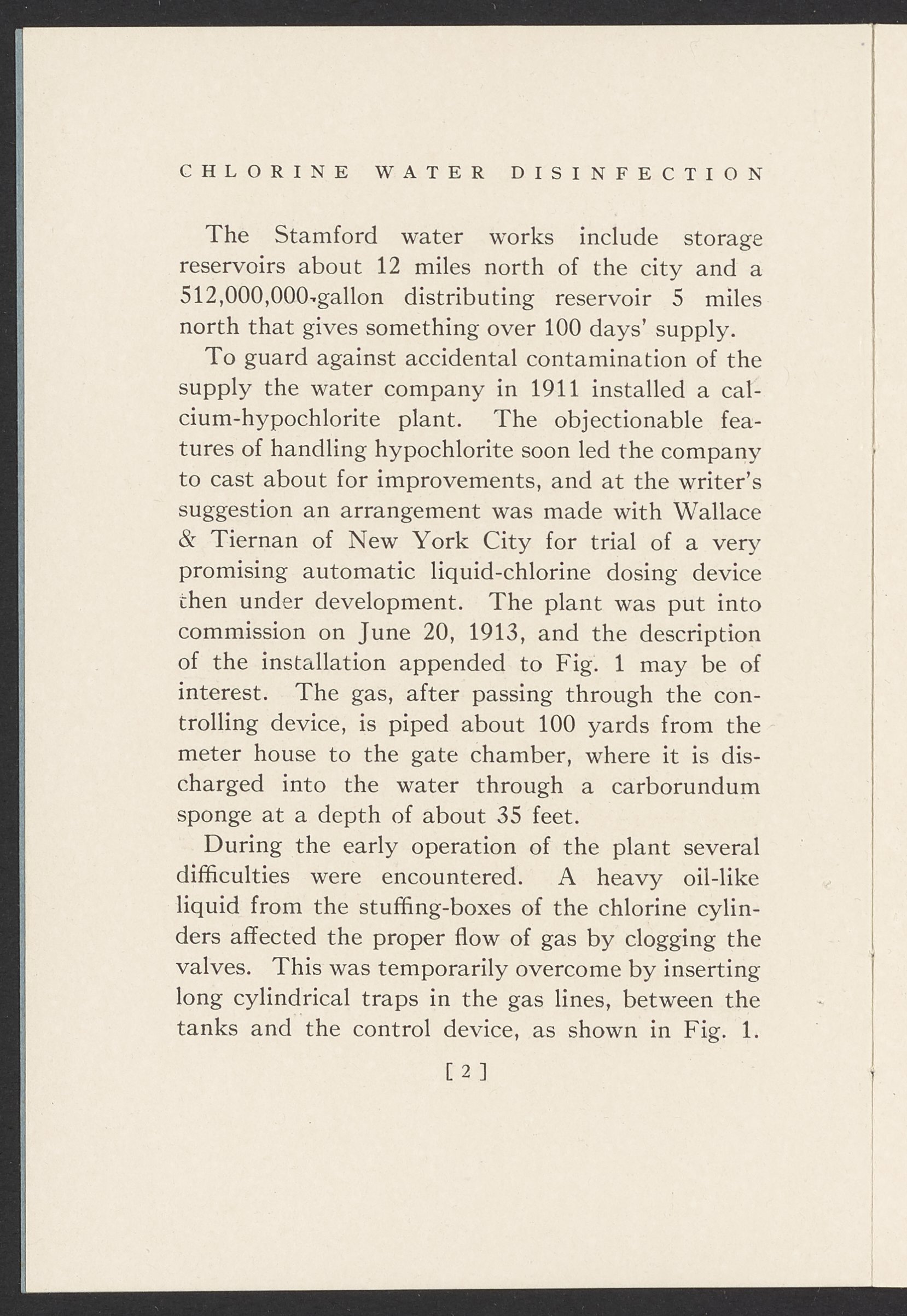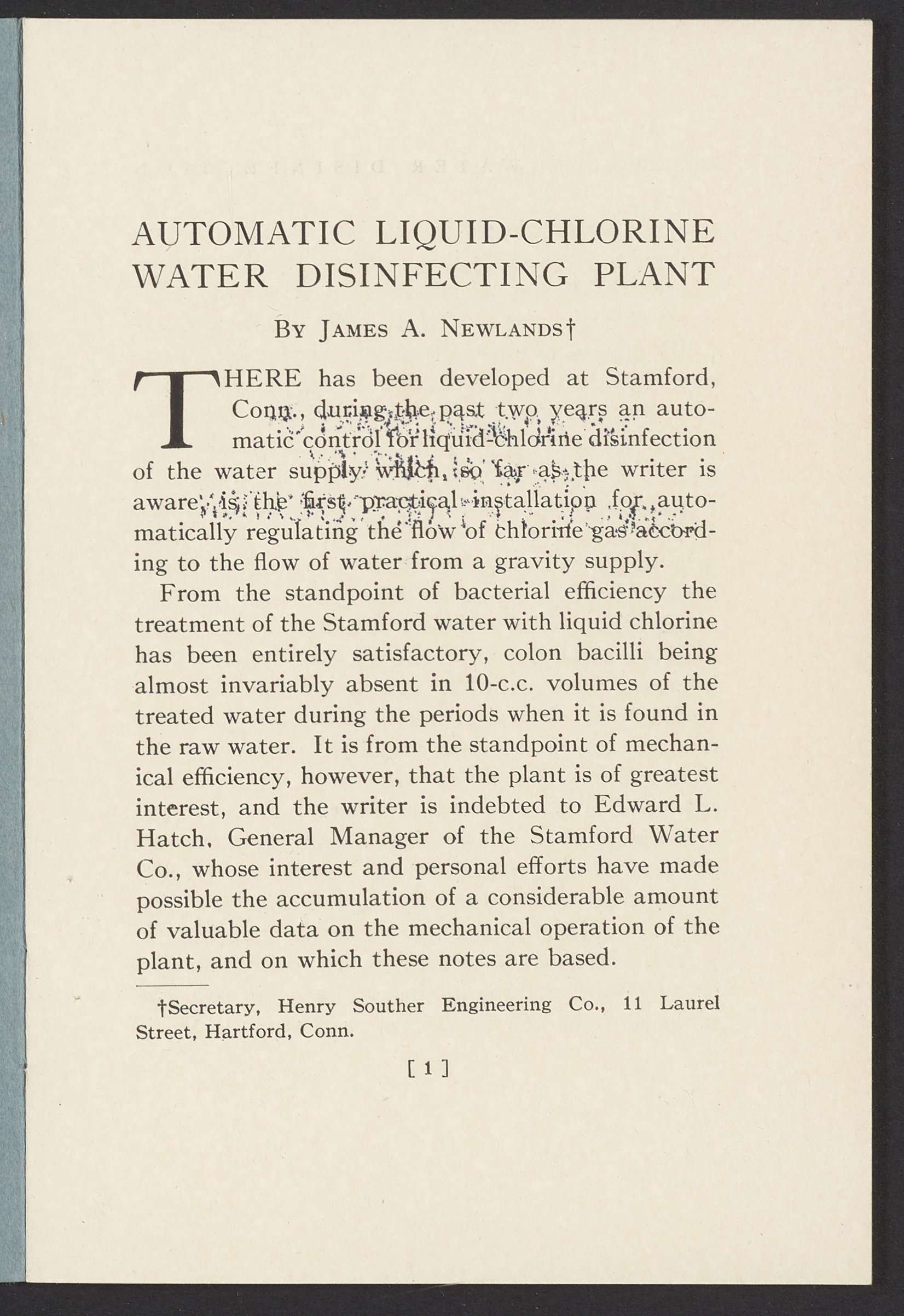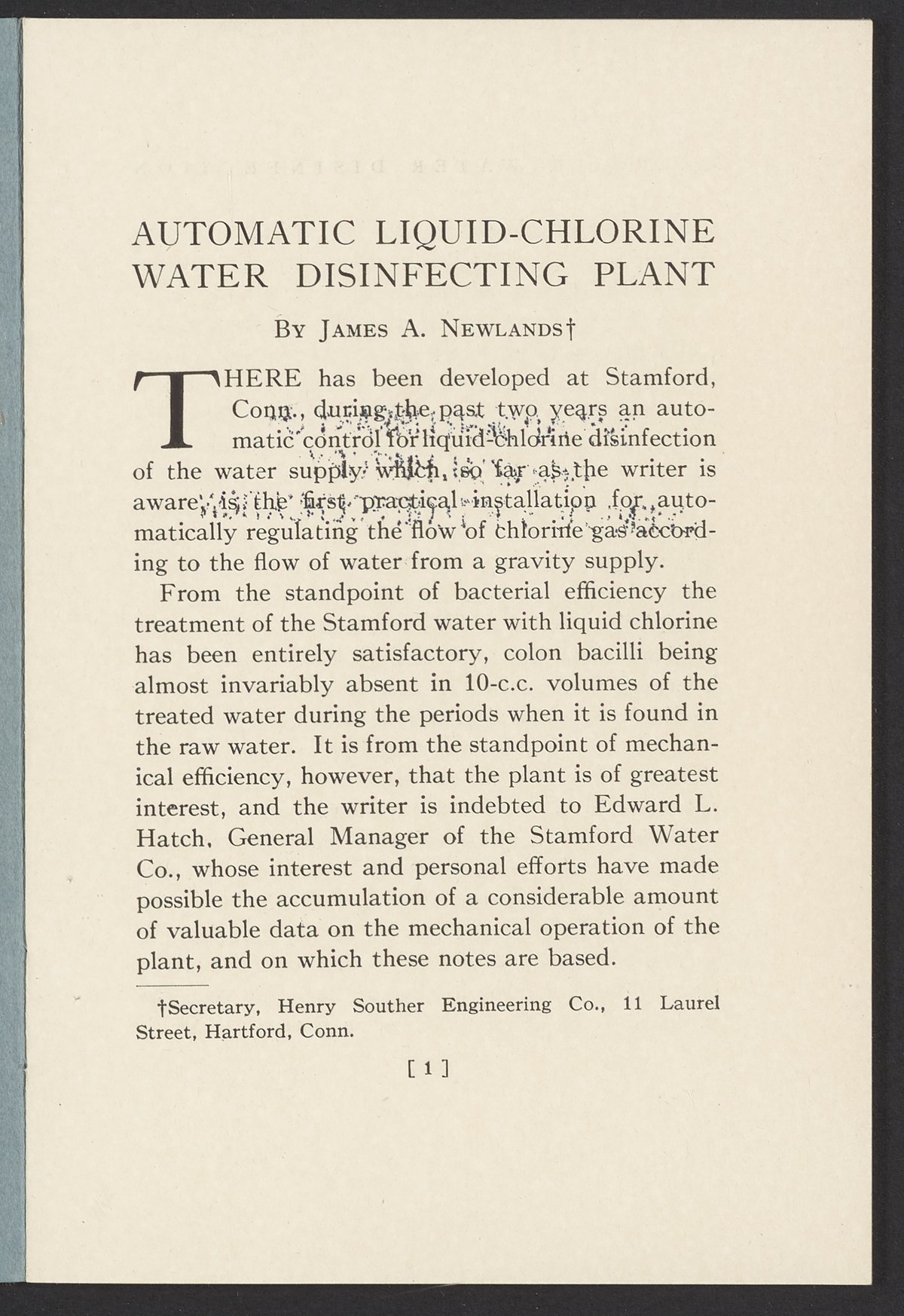 Small JPG1200 x 1746px — 381 KBFull-sized JPG1652 x 2404px — 674 KBOriginal fileTIFF — 1652 x 2404px — 11.4 MBPamphlet summarizing data accumulated by the Stamford Water Works reflecting the bacterial and mechanical efficiency of an automatic control for liquid-chlorine disinfection of water. Includes data tables and two black and white prints. Work is digitized in its entirety.