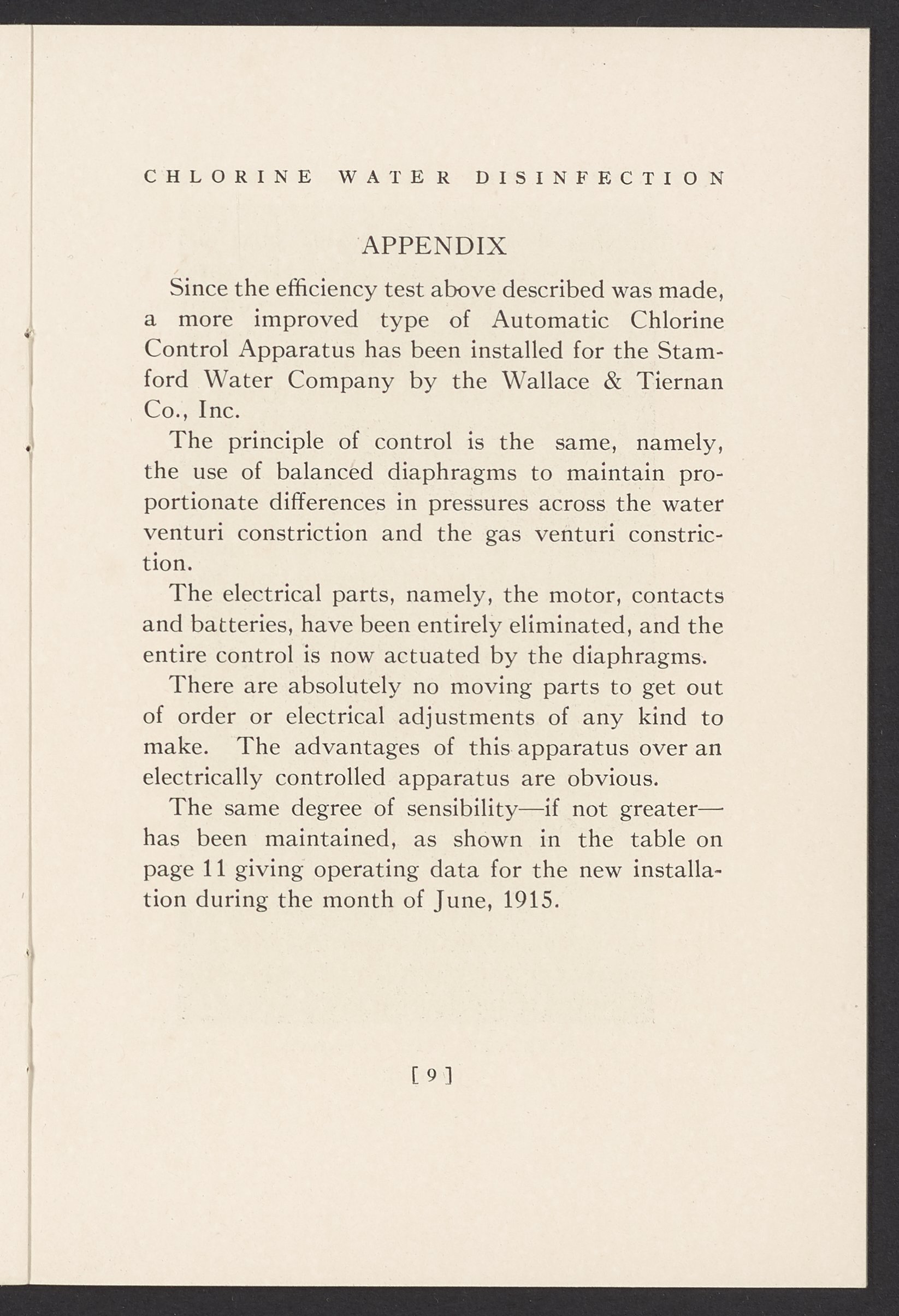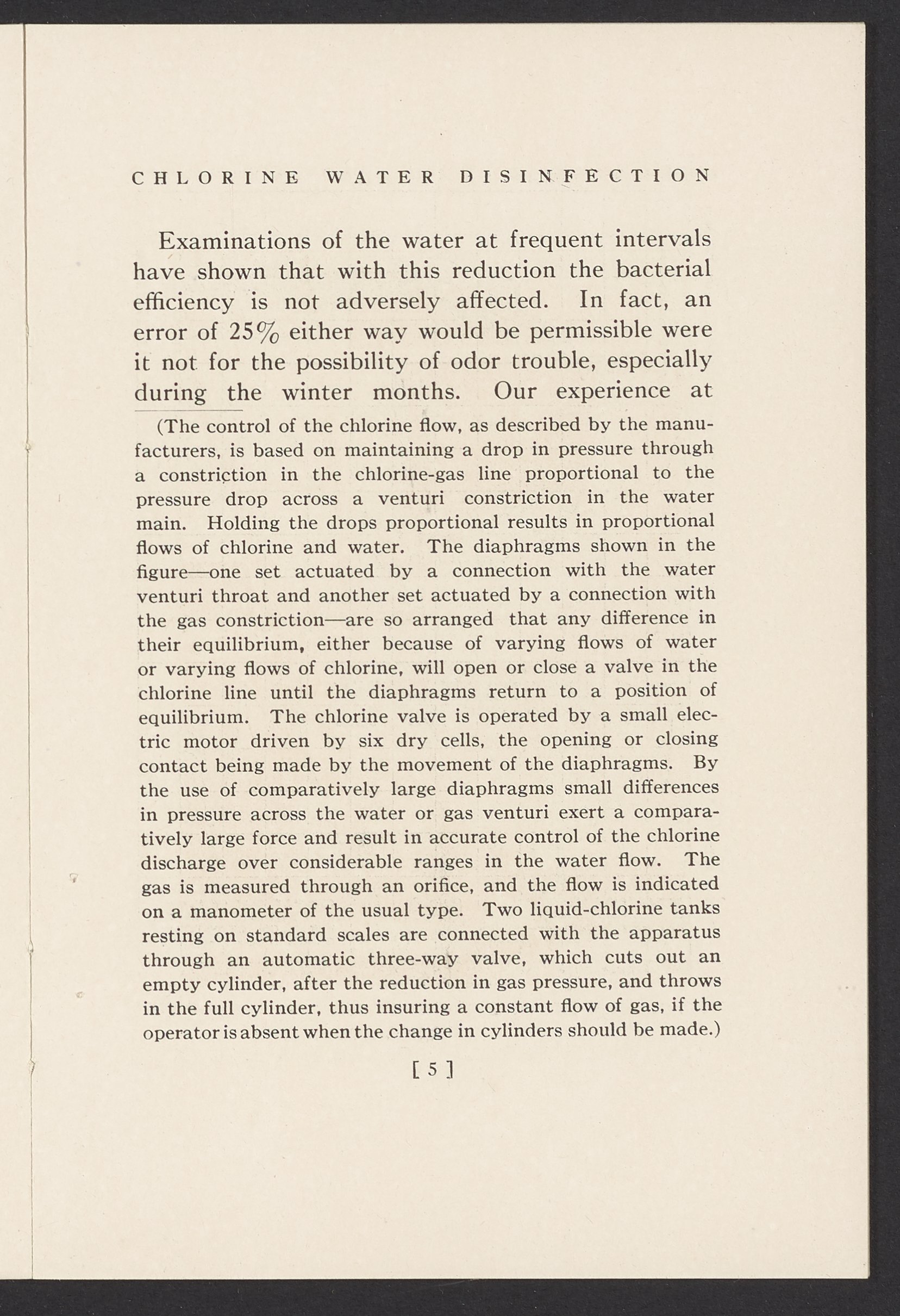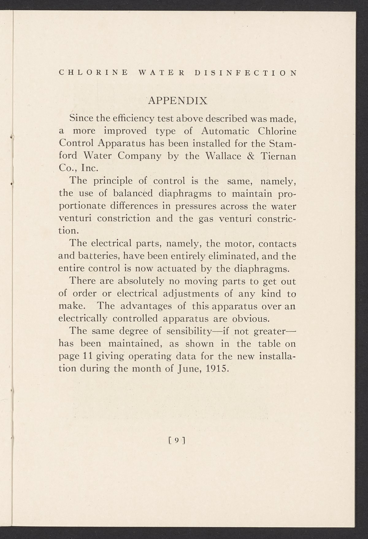 Small JPG1200 x 1746px — 381 KBFull-sized JPG1652 x 2404px — 674 KBOriginal fileTIFF — 1652 x 2404px — 11.4 MBPamphlet summarizing data accumulated by the Stamford Water Works reflecting the bacterial and mechanical efficiency of an automatic control for liquid-chlorine disinfection of water. Includes data tables and two black and white prints. Work is digitized in its entirety.