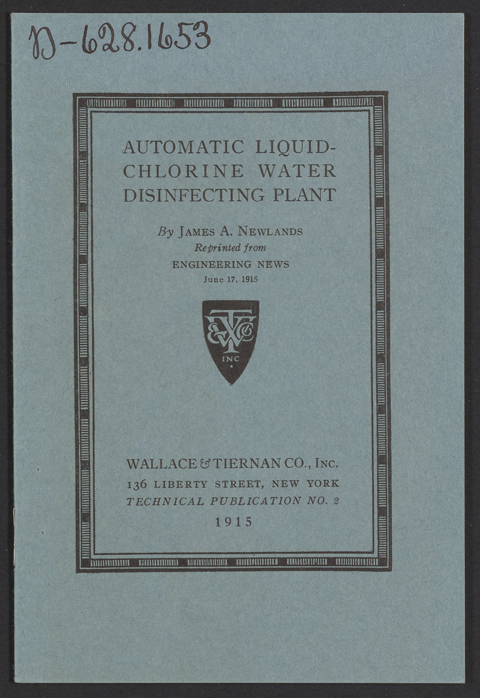 Newlands, James Andrew. “Automatic Liquid-Chlorine Water Disinfecting Plant.” New York, New York: Wallace & Tiernan Company, 1915. QD281.C5 .N48 1915. Science History Institute. Philadelphia. https://digital.sciencehistory.org/works/9ur37r8.