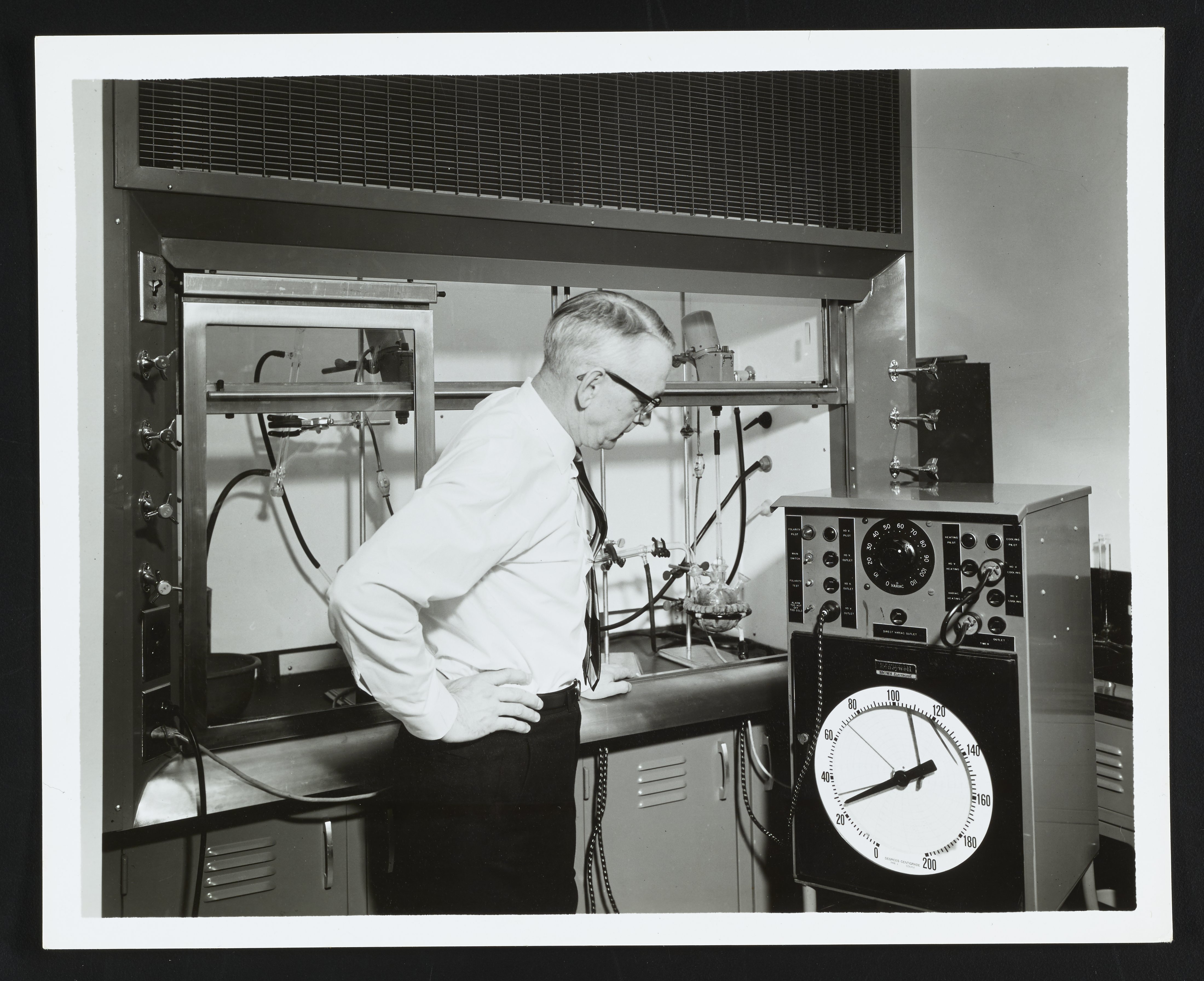 Research Director George Garcelon inspects a portable temperature monitoring and control device at the Crompton & Knowles Research Center in Gibraltar, Pennsylvania. The device was used to regulate chemical reactions as they took place under ventilation hoods in the Center's laboratories.