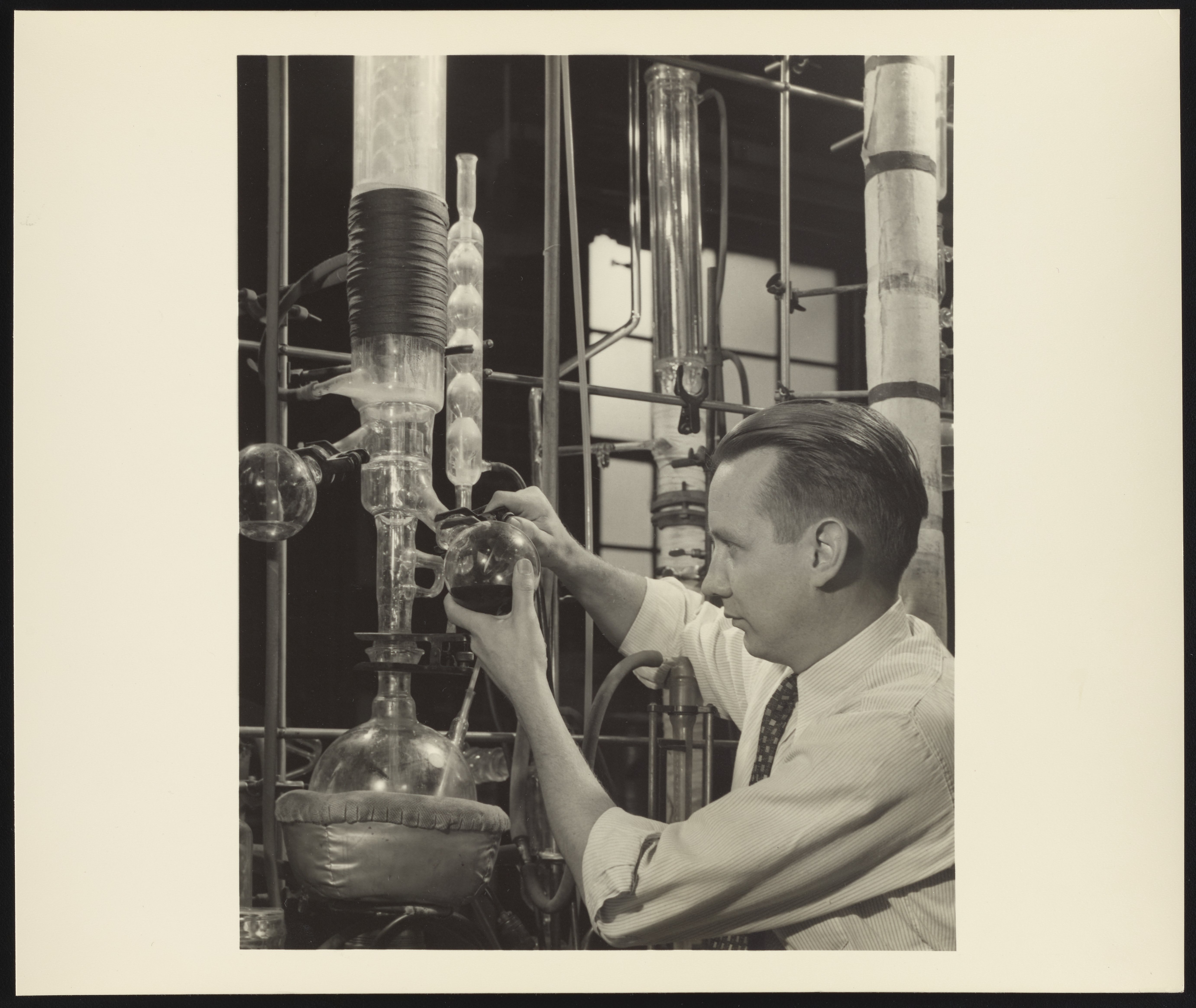 General view of chemist Roger Monroe working with a still in the Dow Chemical Company's Bush Aromatics Research Department.