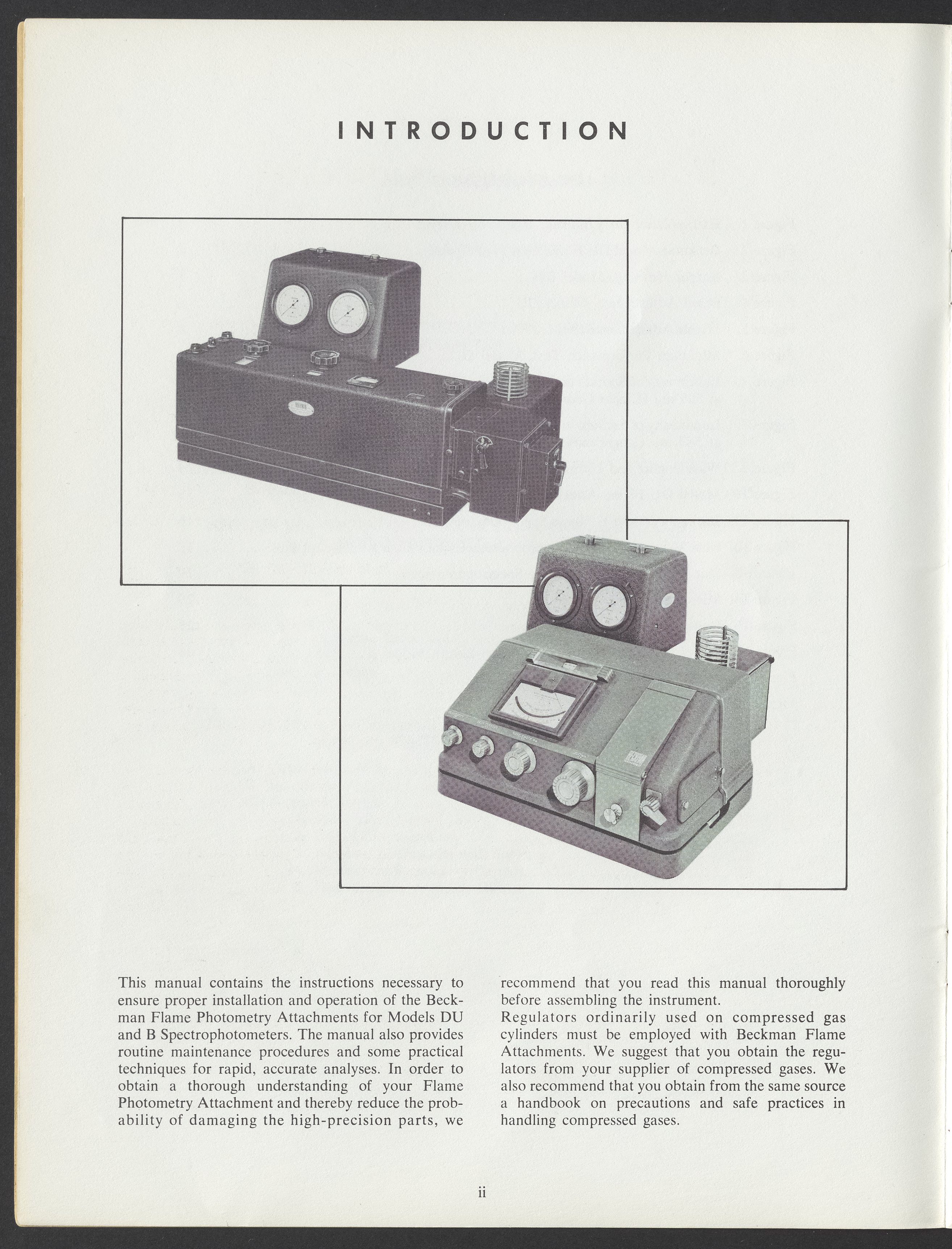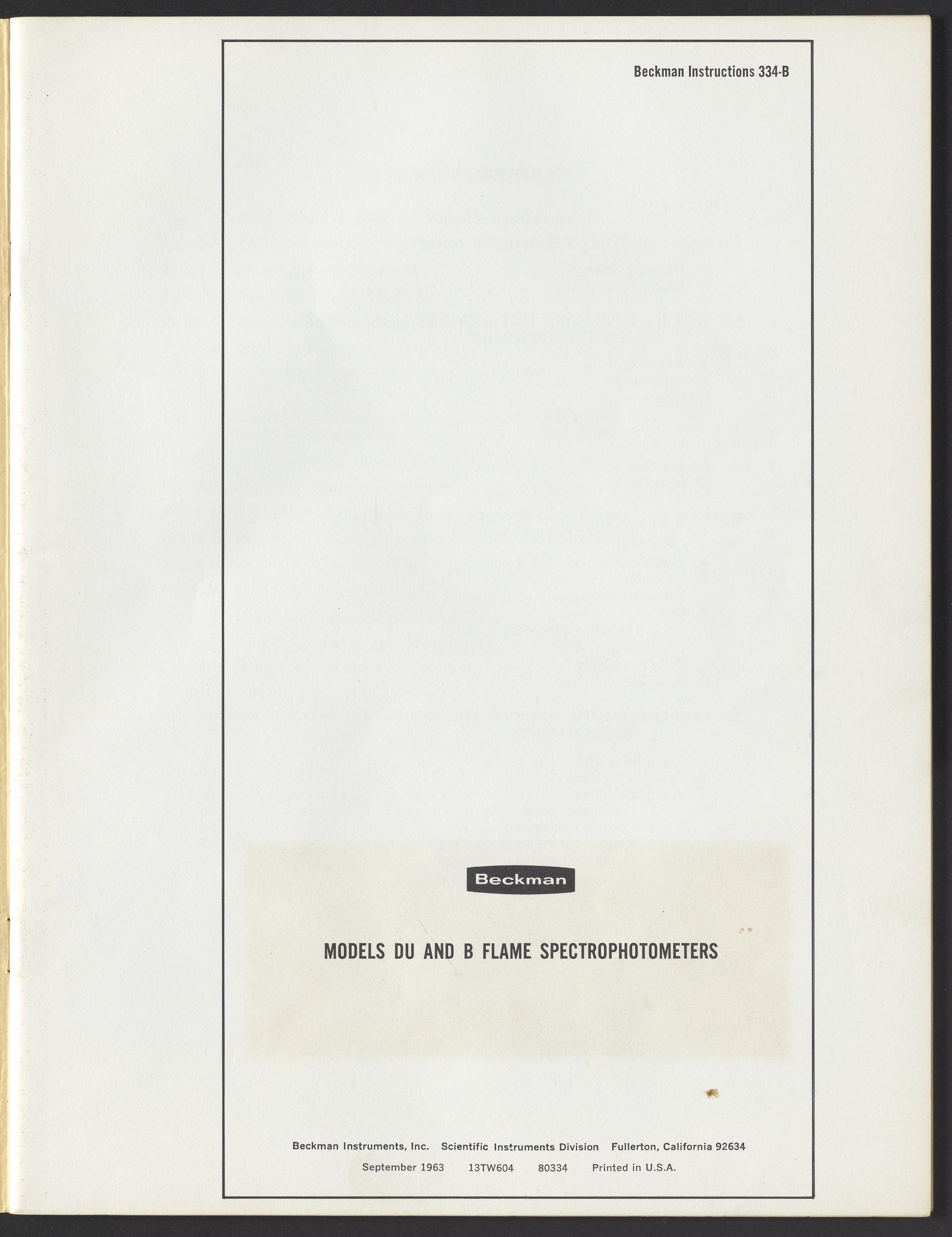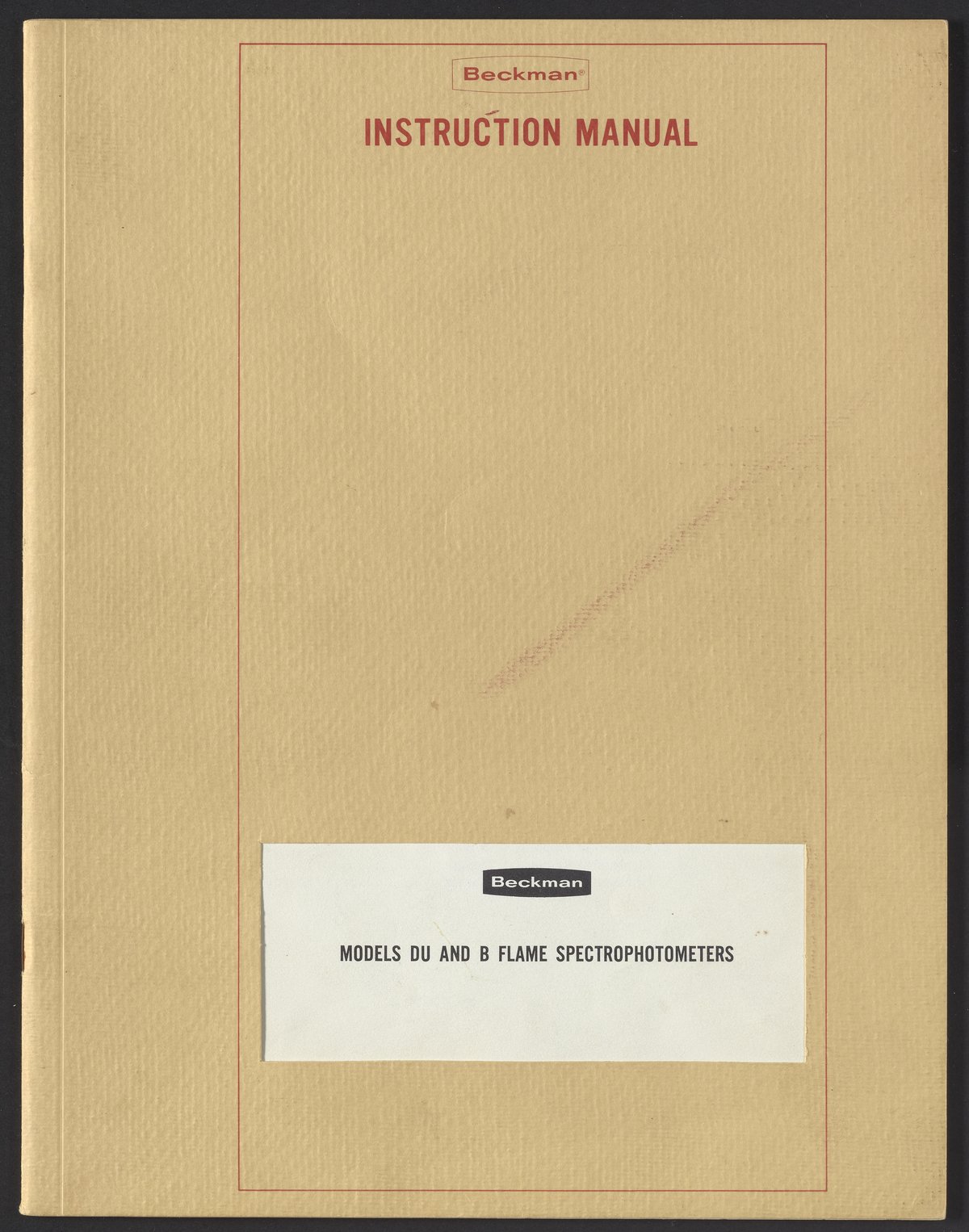 Beckman Instruments, Inc. “Instruction Manual, Beckman Models DU and B Flame Spectrophotometers,” September 1963. Beckman Historical Collection, Box 104, Folder 215. Science History Institute. Philadelphia. https://digital.sciencehistory.org/works/9w0323862.