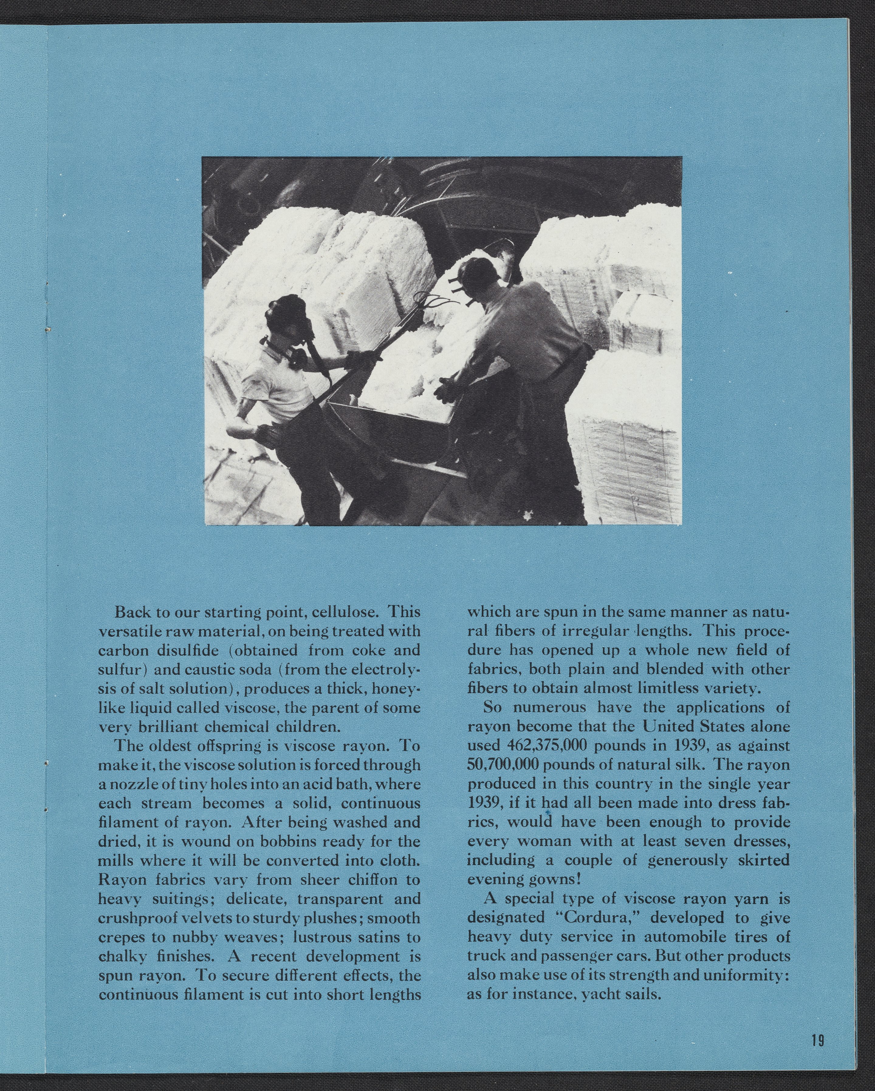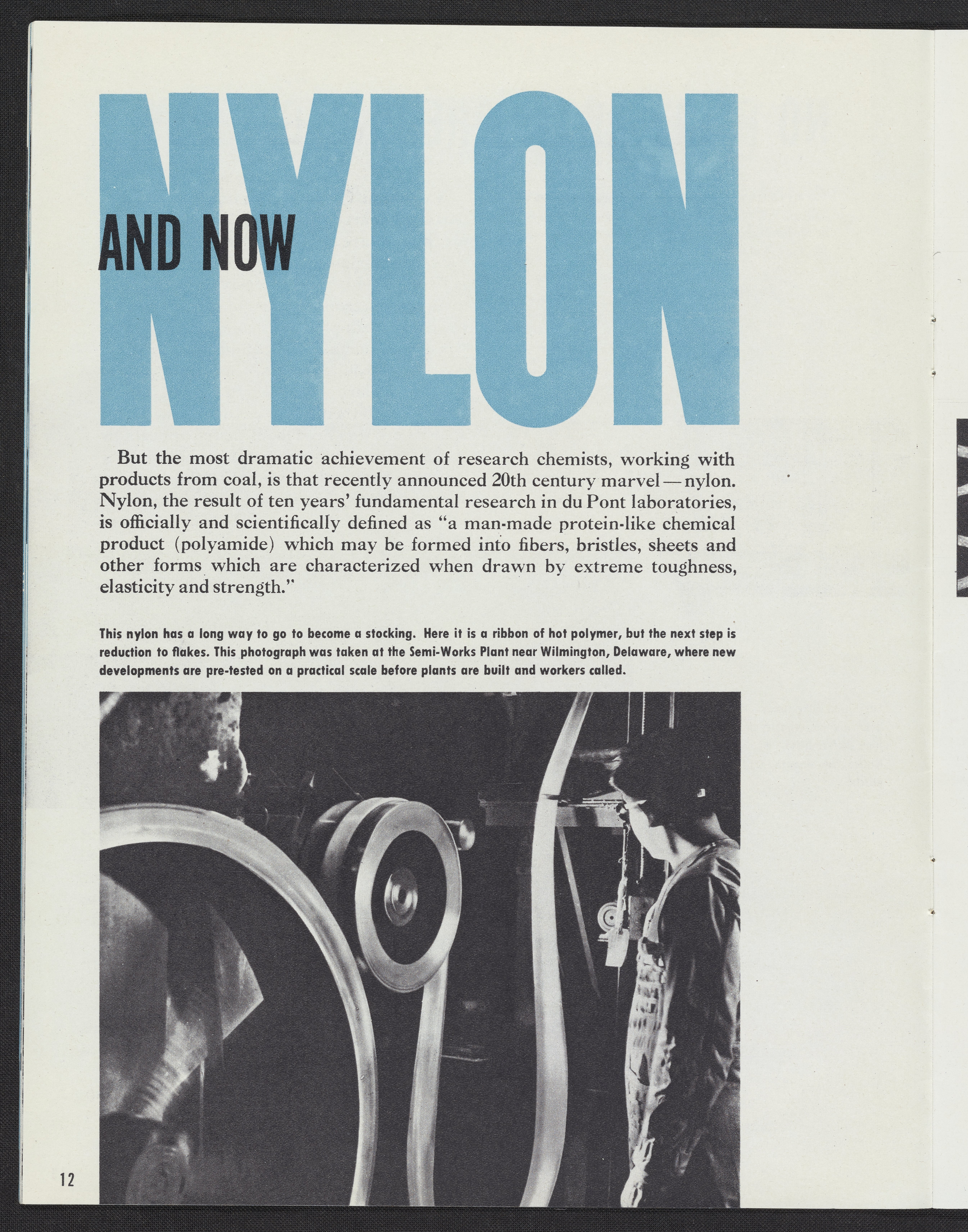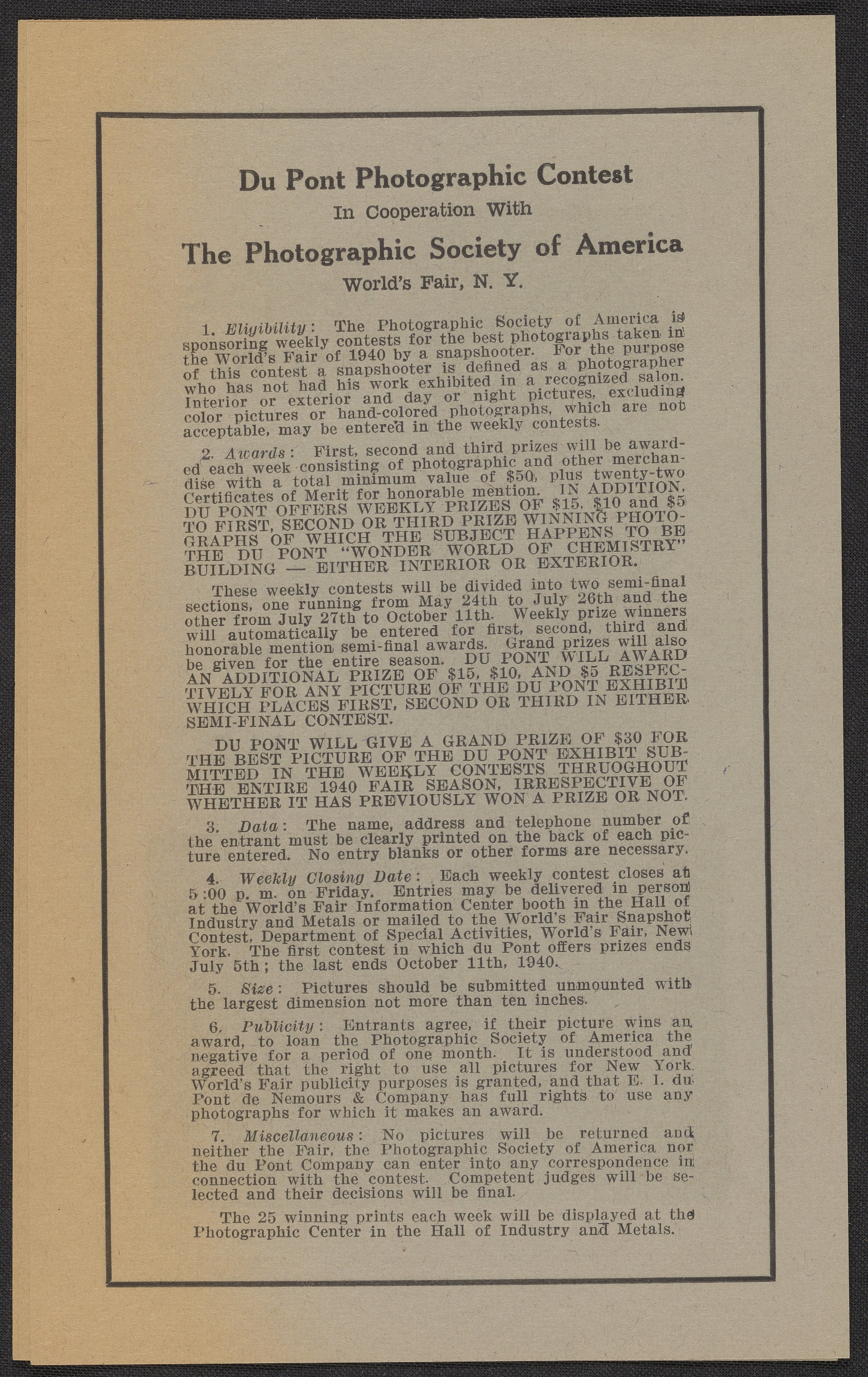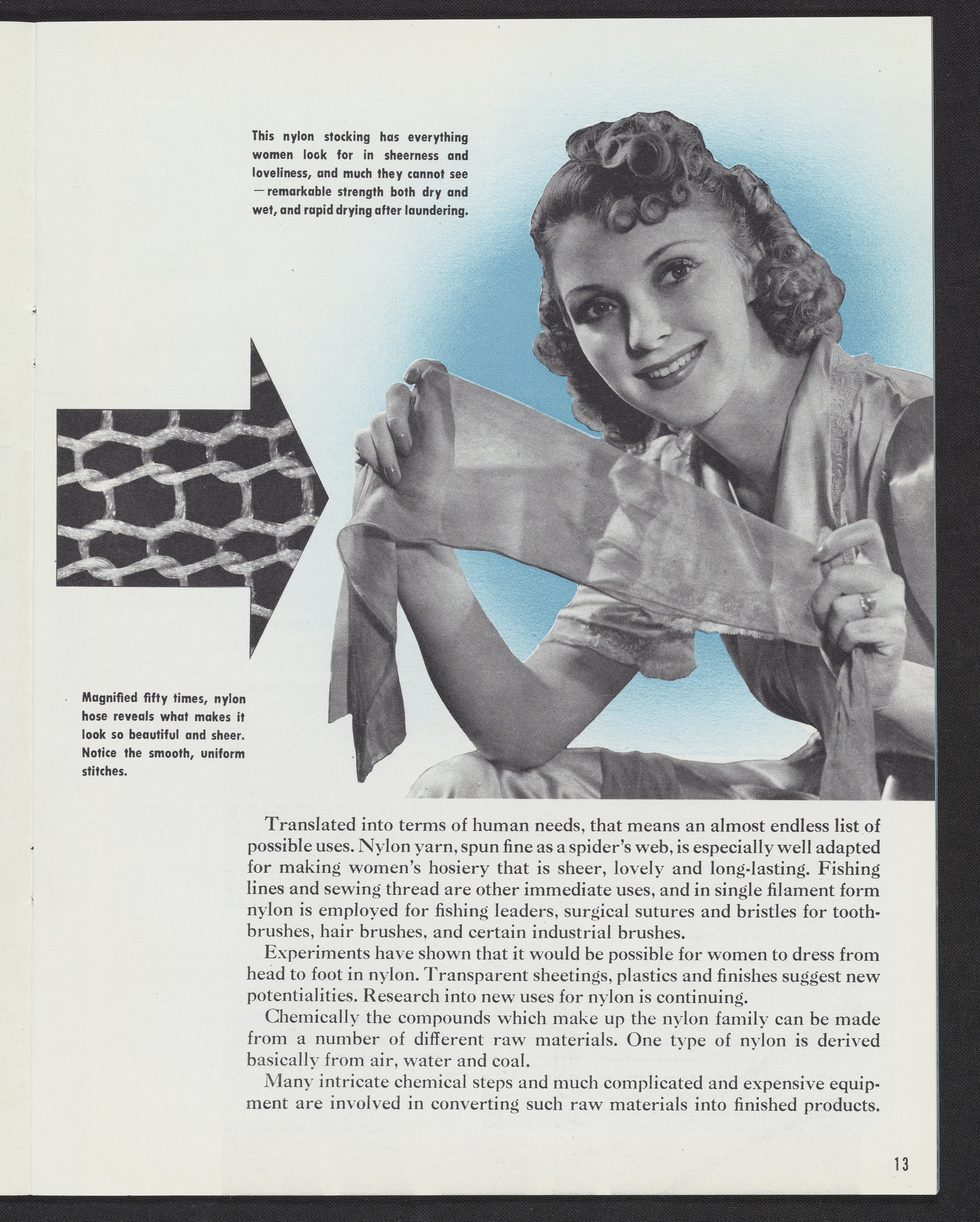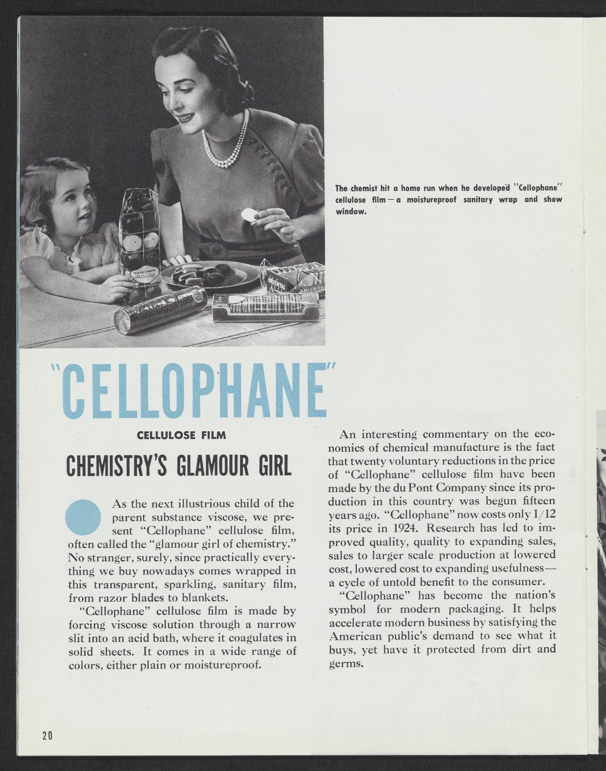 Small JPG1200 x 1548px — 424 KBLarge JPG2880 x 3715px — 3.6 MBFull-sized JPG5217 x 6730px — 10.7 MBOriginal fileTIFF — 5217 x 6730px — 101 MBPromotional booklet advertising various products manufactured and sold by the E. I. Du Pont De Nemours & Company. Includes neoprene; dyes; fragrances; safety glass; seed disinfectants, fertilizers and sprays; "Cellophane;" explosives; "Lucite;" nylon; auto finishes; coated fabrics like "Fabrikoid;" viscose; "Acele;" "Plastacele;" "Cel-O-Glass;" non-flammable photographic film; electroplating; bleaching agents; and dry-cleaning fluids. Also includes how salt, chlorine, coal, sand and oil aid in chemical processes. Last pages include a history of Du Pont. Included with booklet is an informational pamphlet about the Du Pont photographic contest in cooperation with the Photographic Society of America for the best photograph taken during the 1940 World's Fair suggesting this promotional booklet could have been distributed at the 1939-1940 World's Fair in New York City, where Du Pont debuted nylon stockings.