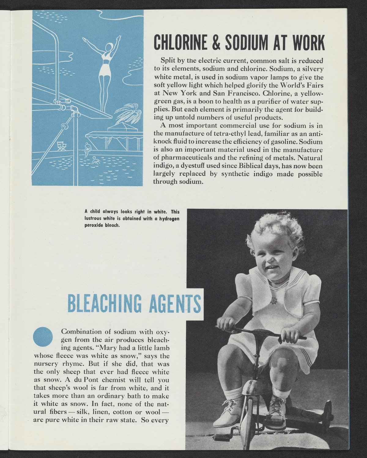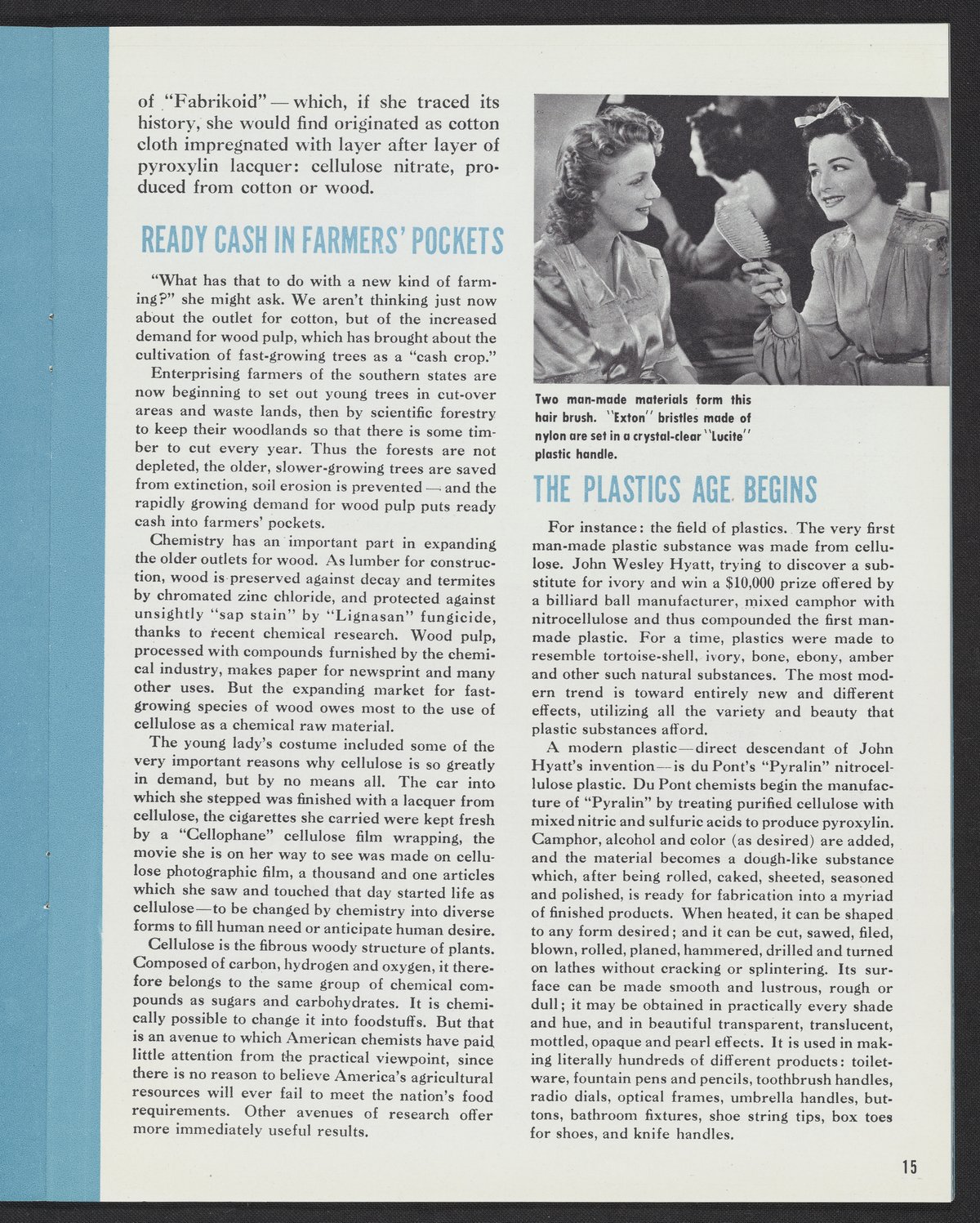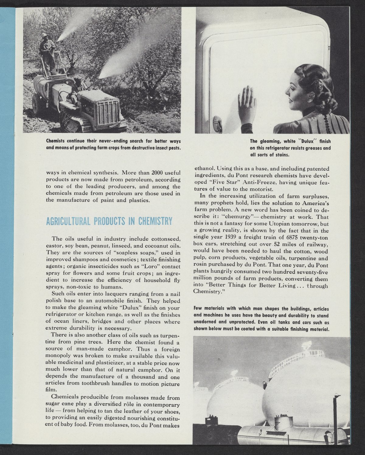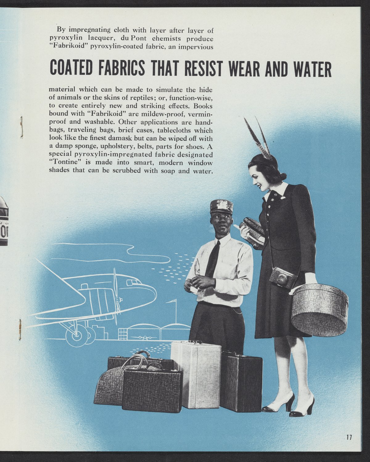 Small JPG1200 x 1548px — 424 KBLarge JPG2880 x 3715px — 3.6 MBFull-sized JPG5217 x 6730px — 10.7 MBOriginal fileTIFF — 5217 x 6730px — 101 MBPromotional booklet advertising various products manufactured and sold by the E. I. Du Pont De Nemours & Company. Includes neoprene; dyes; fragrances; safety glass; seed disinfectants, fertilizers and sprays; "Cellophane;" explosives; "Lucite;" nylon; auto finishes; coated fabrics like "Fabrikoid;" viscose; "Acele;" "Plastacele;" "Cel-O-Glass;" non-flammable photographic film; electroplating; bleaching agents; and dry-cleaning fluids. Also includes how salt, chlorine, coal, sand and oil aid in chemical processes. Last pages include a history of Du Pont. Included with booklet is an informational pamphlet about the Du Pont photographic contest in cooperation with the Photographic Society of America for the best photograph taken during the 1940 World's Fair suggesting this promotional booklet could have been distributed at the 1939-1940 World's Fair in New York City, where Du Pont debuted nylon stockings.