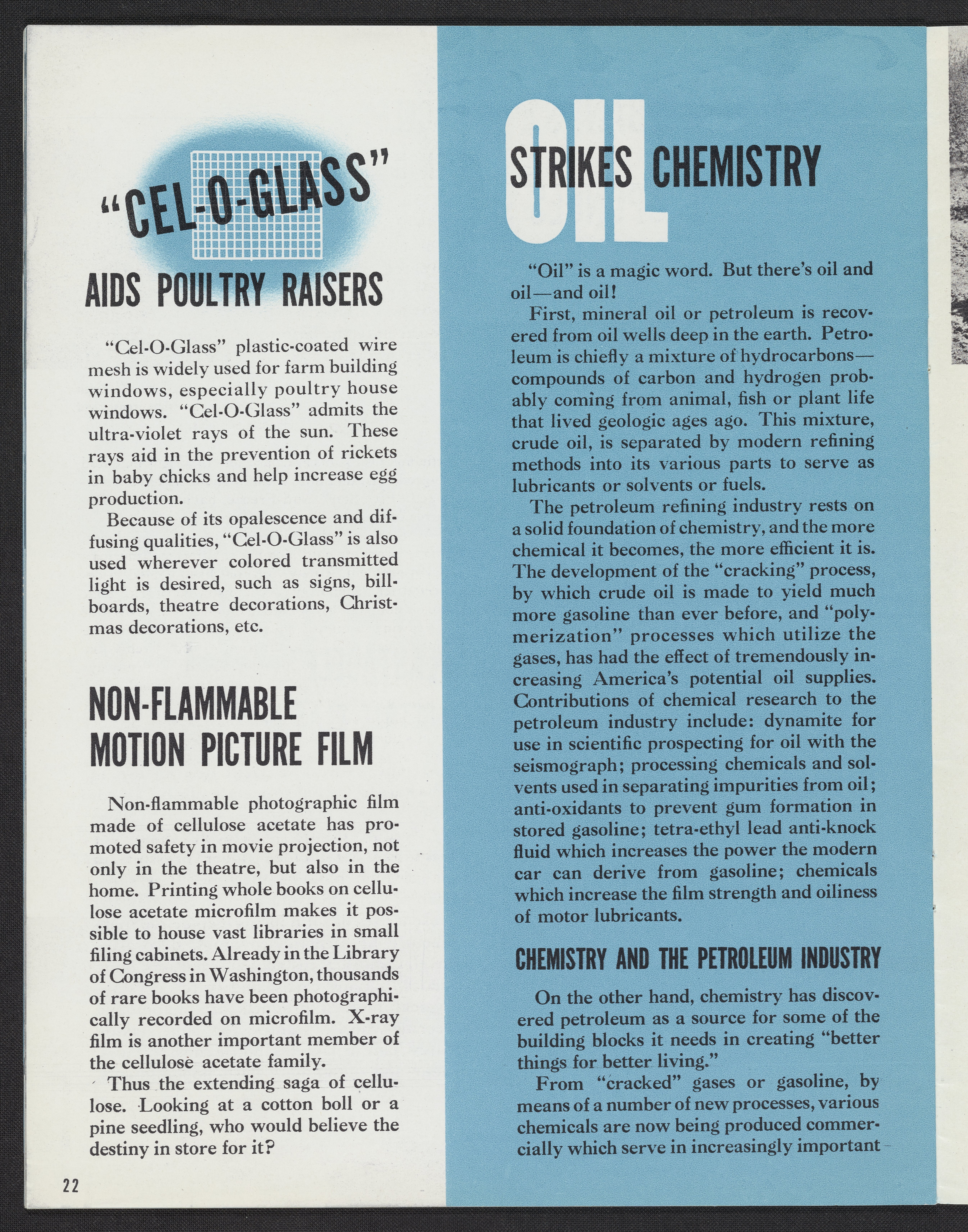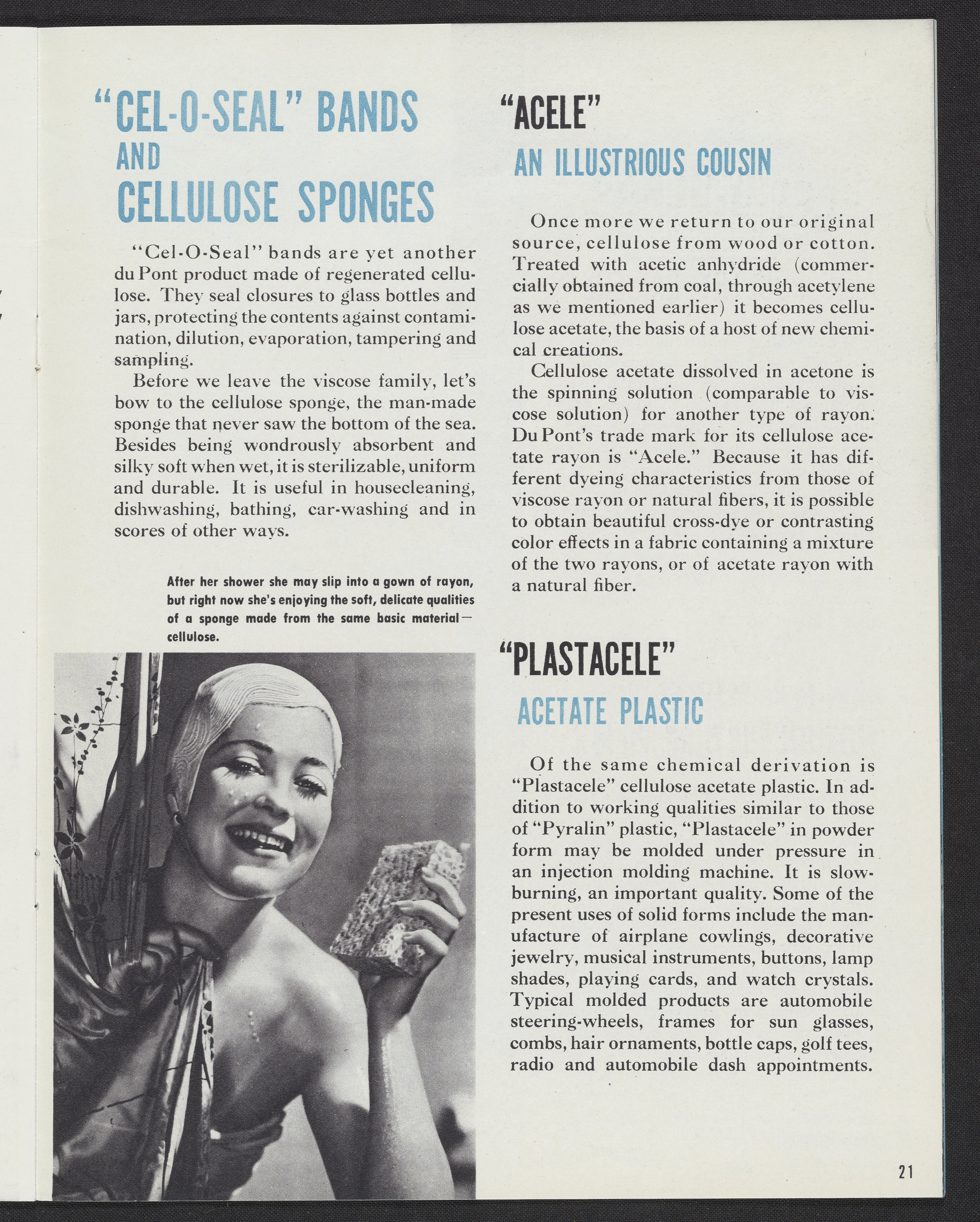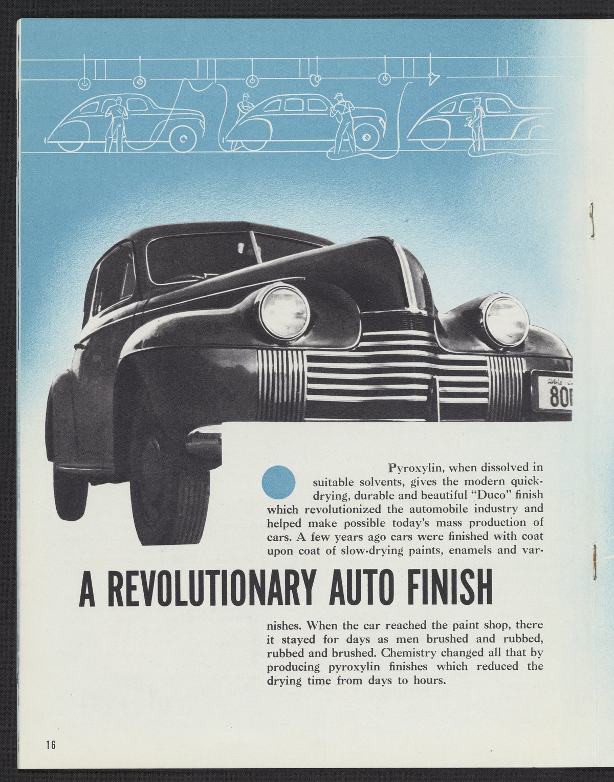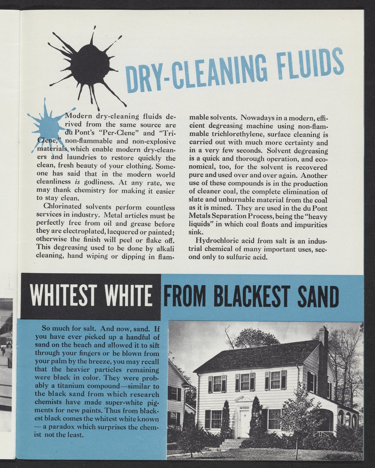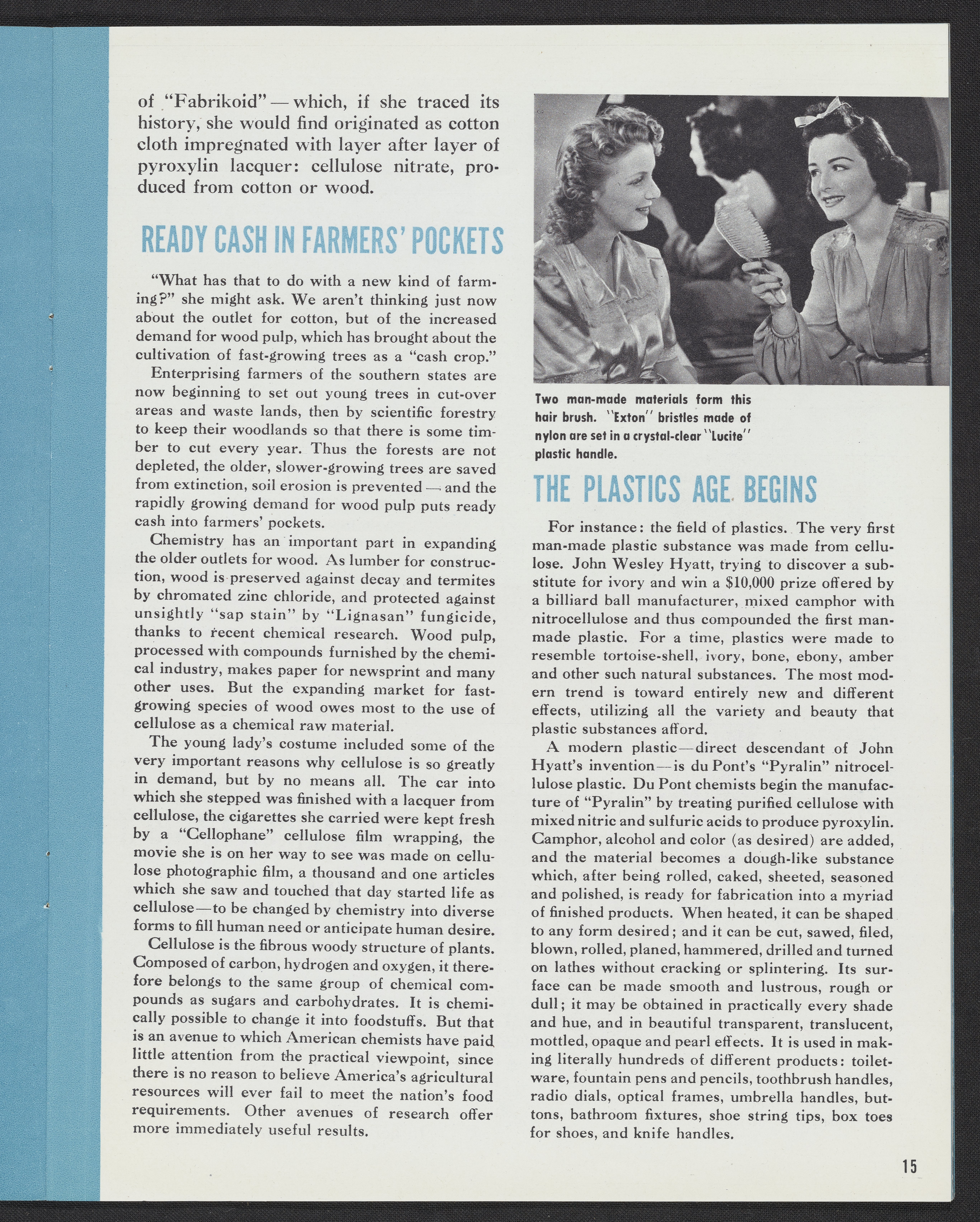 Small JPG1200 x 1548px — 424 KBLarge JPG2880 x 3715px — 3.6 MBFull-sized JPG5217 x 6730px — 10.7 MBOriginal fileTIFF — 5217 x 6730px — 101 MBPromotional booklet advertising various products manufactured and sold by the E. I. Du Pont De Nemours & Company. Includes neoprene; dyes; fragrances; safety glass; seed disinfectants, fertilizers and sprays; "Cellophane;" explosives; "Lucite;" nylon; auto finishes; coated fabrics like "Fabrikoid;" viscose; "Acele;" "Plastacele;" "Cel-O-Glass;" non-flammable photographic film; electroplating; bleaching agents; and dry-cleaning fluids. Also includes how salt, chlorine, coal, sand and oil aid in chemical processes. Last pages include a history of Du Pont. Included with booklet is an informational pamphlet about the Du Pont photographic contest in cooperation with the Photographic Society of America for the best photograph taken during the 1940 World's Fair suggesting this promotional booklet could have been distributed at the 1939-1940 World's Fair in New York City, where Du Pont debuted nylon stockings.