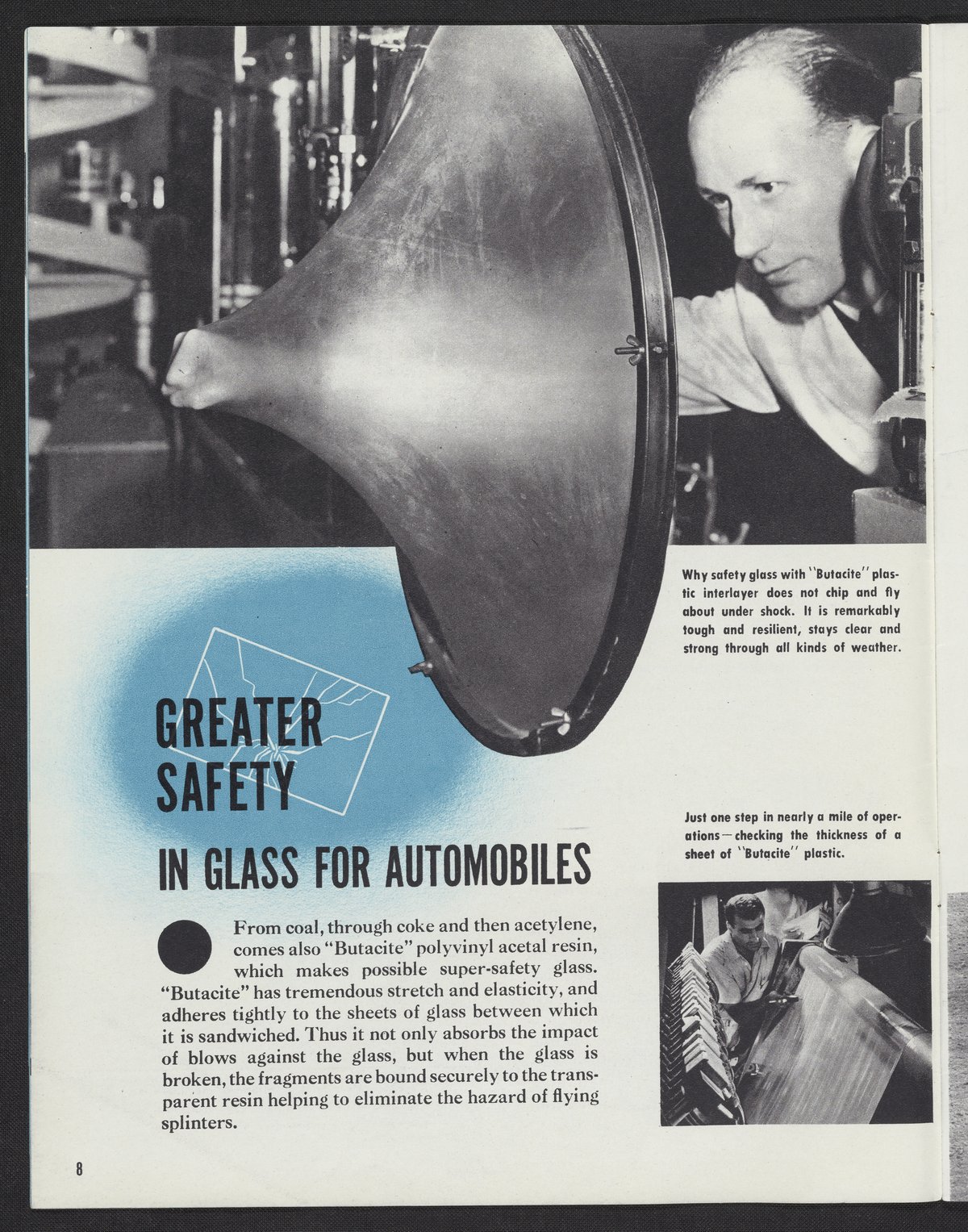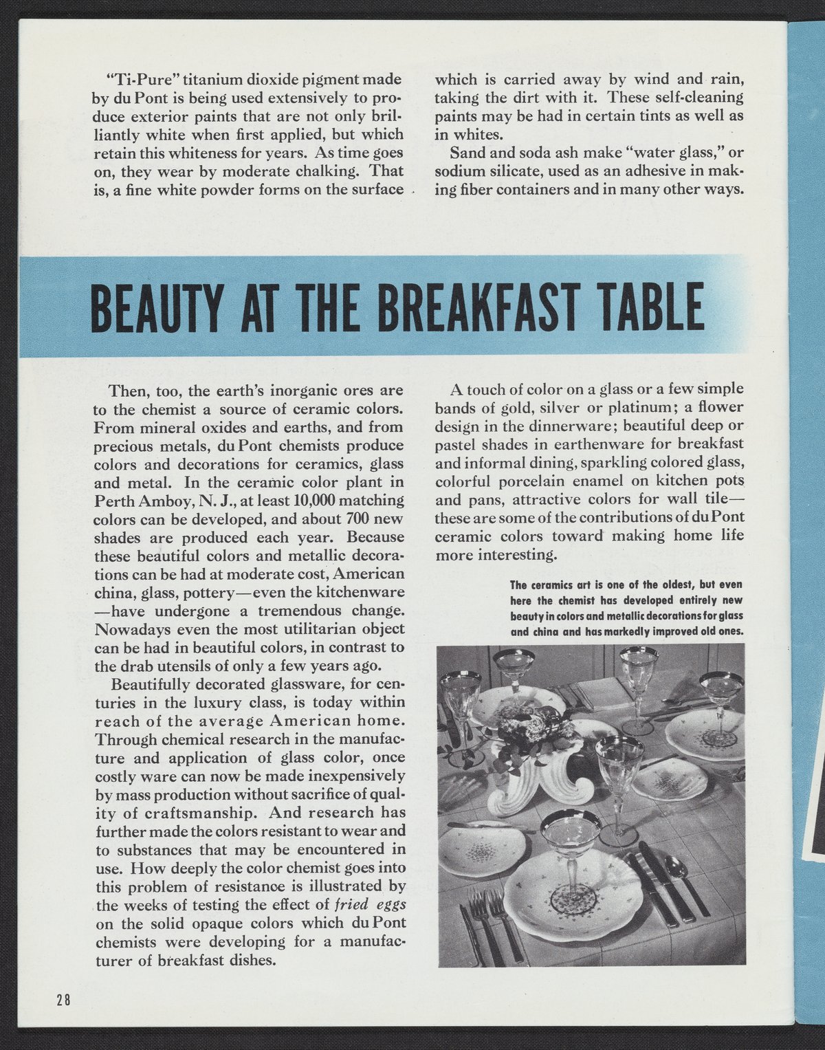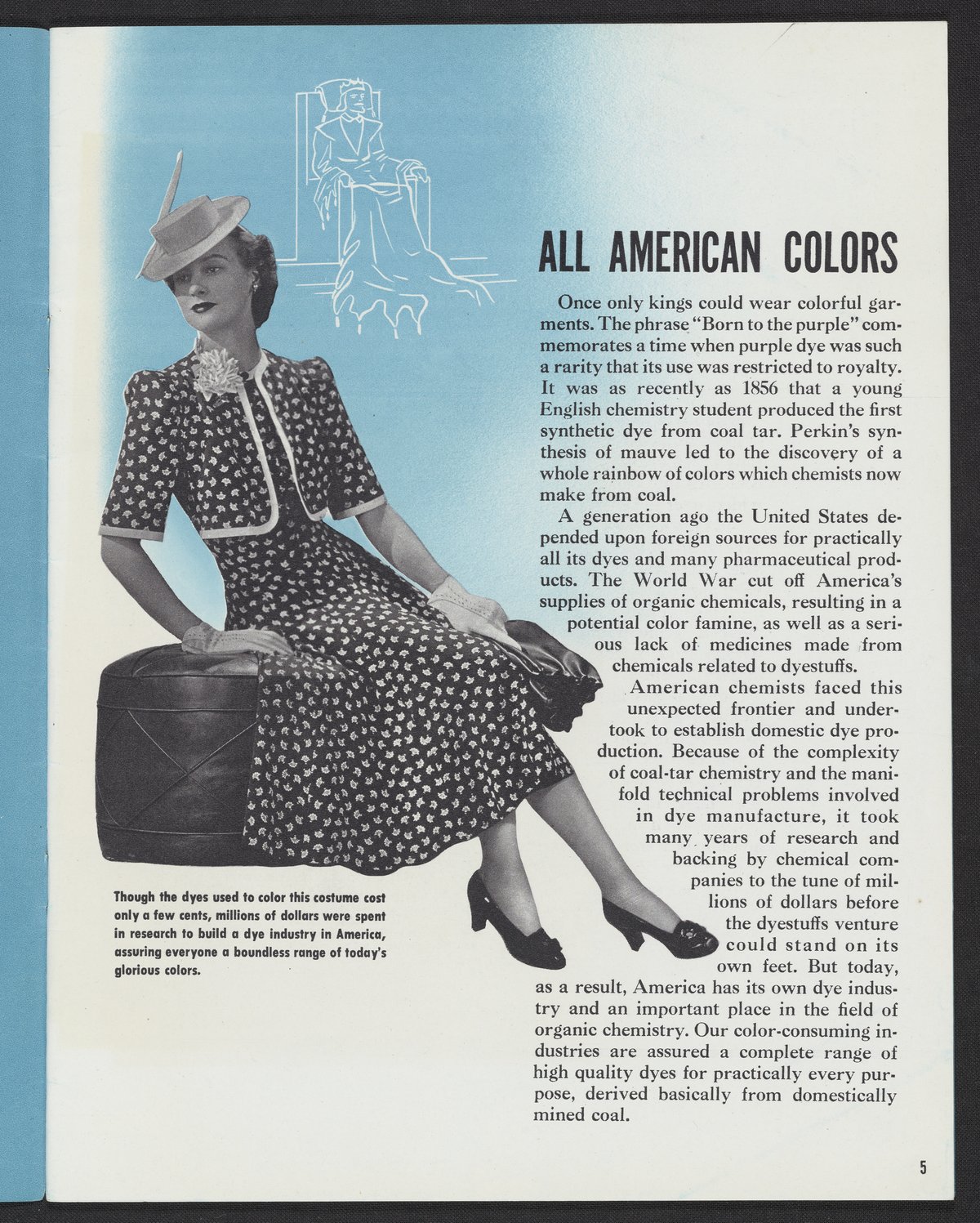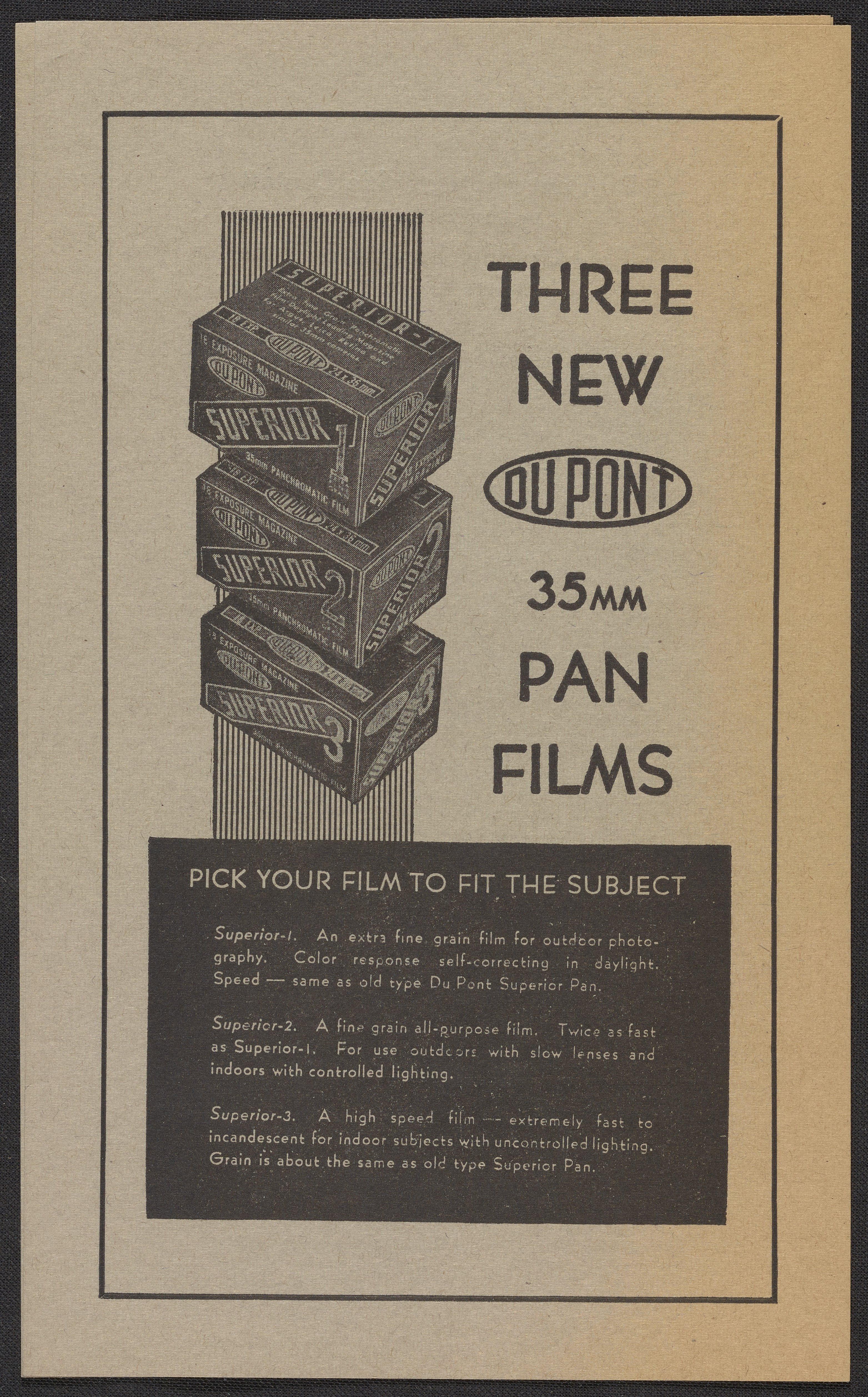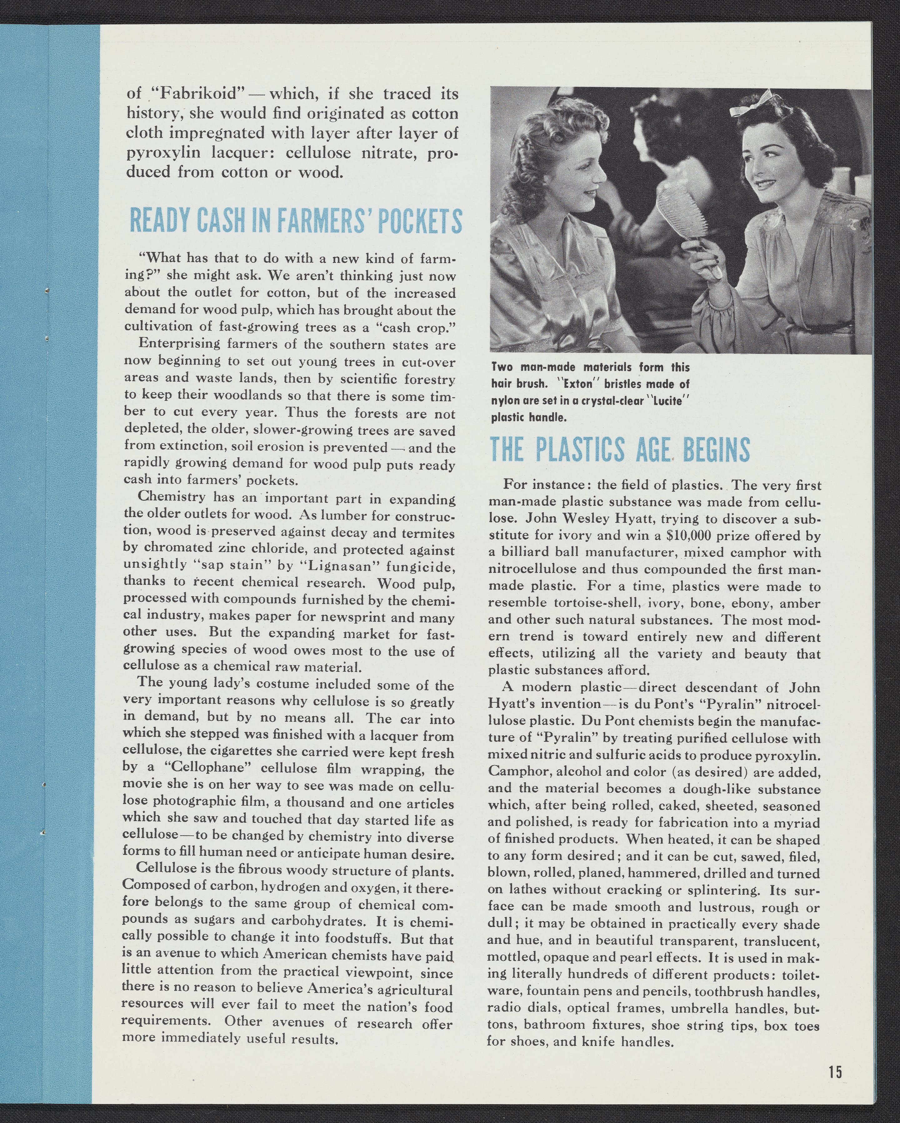 Small JPG1200 x 1548px — 424 KBLarge JPG2880 x 3715px — 3.6 MBFull-sized JPG5217 x 6730px — 10.7 MBOriginal fileTIFF — 5217 x 6730px — 101 MBPromotional booklet advertising various products manufactured and sold by the E. I. Du Pont De Nemours & Company. Includes neoprene; dyes; fragrances; safety glass; seed disinfectants, fertilizers and sprays; "Cellophane;" explosives; "Lucite;" nylon; auto finishes; coated fabrics like "Fabrikoid;" viscose; "Acele;" "Plastacele;" "Cel-O-Glass;" non-flammable photographic film; electroplating; bleaching agents; and dry-cleaning fluids. Also includes how salt, chlorine, coal, sand and oil aid in chemical processes. Last pages include a history of Du Pont. Included with booklet is an informational pamphlet about the Du Pont photographic contest in cooperation with the Photographic Society of America for the best photograph taken during the 1940 World's Fair suggesting this promotional booklet could have been distributed at the 1939-1940 World's Fair in New York City, where Du Pont debuted nylon stockings.