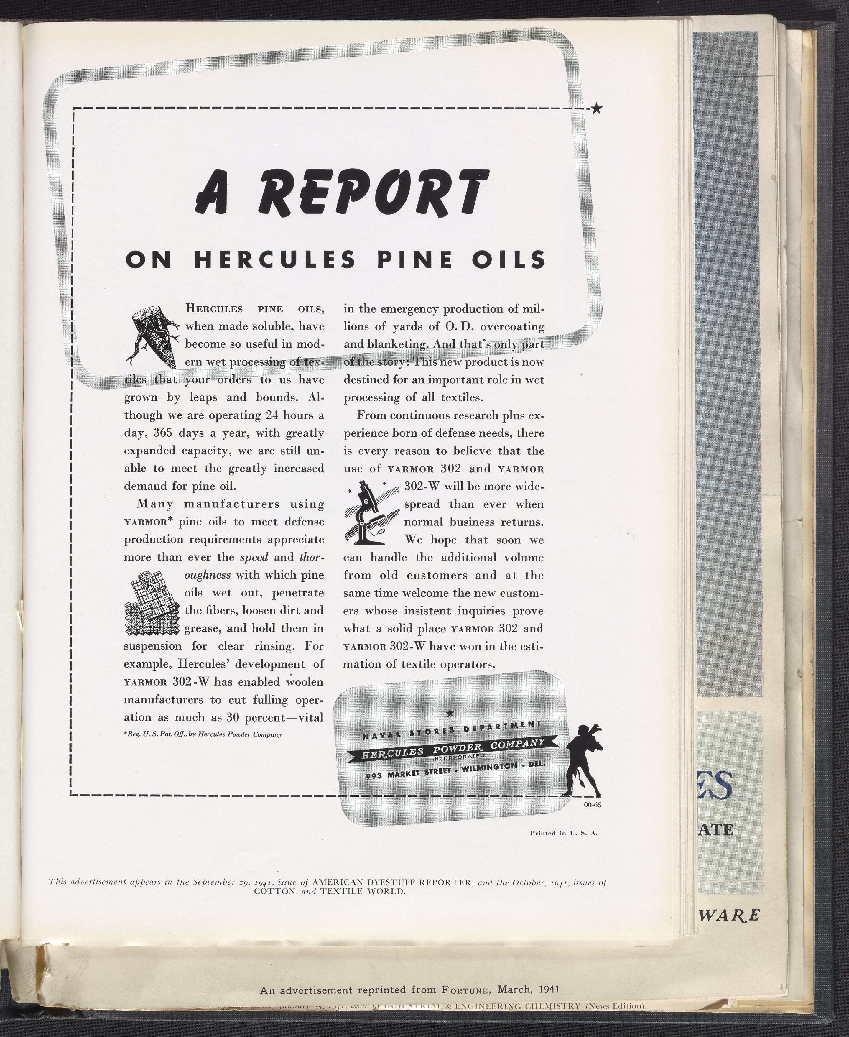 Hercules Incorporated. “A Report on Hercules Pine Oils.” 1941 Hercules Advertisements, 1941. Records of Hercules Incorporated, Volume 1941. Science History Institute. Philadelphia. https://digital.sciencehistory.org/works/9z903075r.