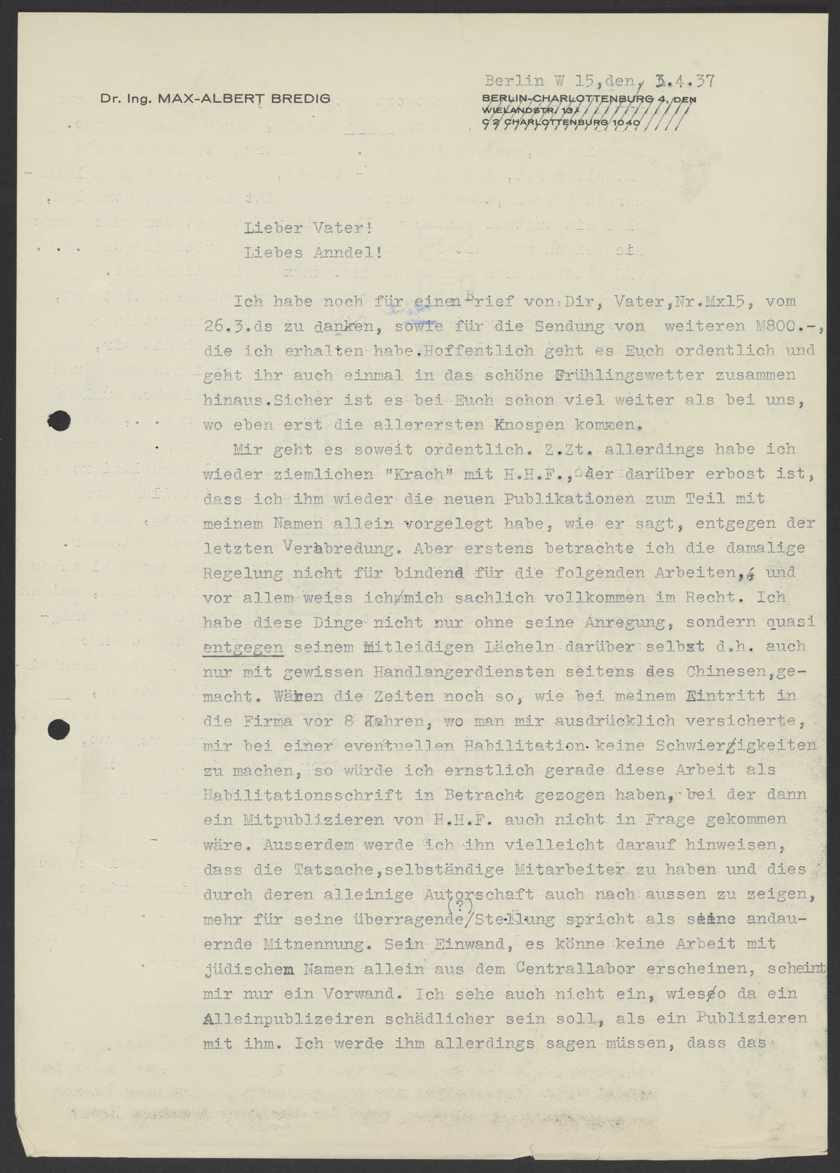 I am doing well but am having some difficulties with H.H.F. He is angry that I submitted more publications to him with my name as the sole author. He claims this contradicts our previous agreement. However, I don’t perceive this regulation as binding and know that I am right. Not only did I do this work without his suggestions, but I did it despite his sympathy for me and with the help of a Chinese colleague. If times were as they were when I started with company eight years ago, when I was assured that I could undertake a habilitation thesis without difficulties, I would have done the habilitation thesis and not insisted on co-publishing with H.H.F. In addition, I would perhaps point out to him that having independent minded employees with sole authorship is more beneficial for his outstanding reputation than constant references. His objection that no publication from the central laboratory with the name of a Jewish author can appear, seems to be a pretext. I also don’t understand how publishing independently would be more harmful than publishing with him.
