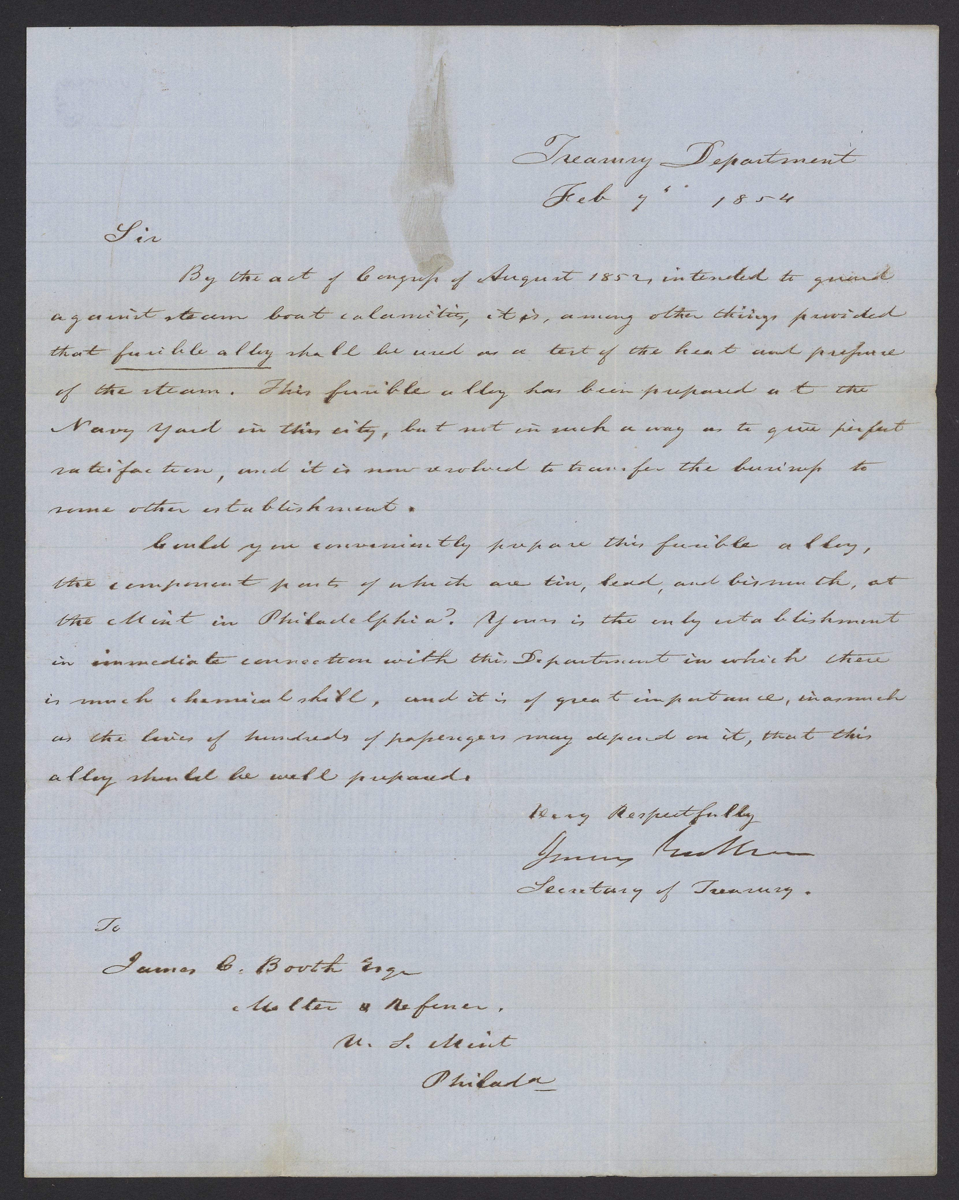 Small JPG1200 x 1501px — 249 KBLarge JPG2880 x 3601px — 1.3 MBFull-sized JPG3322 x 4154px — 1.7 MBOriginal fileTIFF — 3322 x 4154px — 39.5 MBJames B. Guthrie (1792 - 1869), United States Secretary of the Treasury from 1853-1857, requests James Curtis Booth (1810-1888) prepare fusible alloys for use in steamboat safety tests.