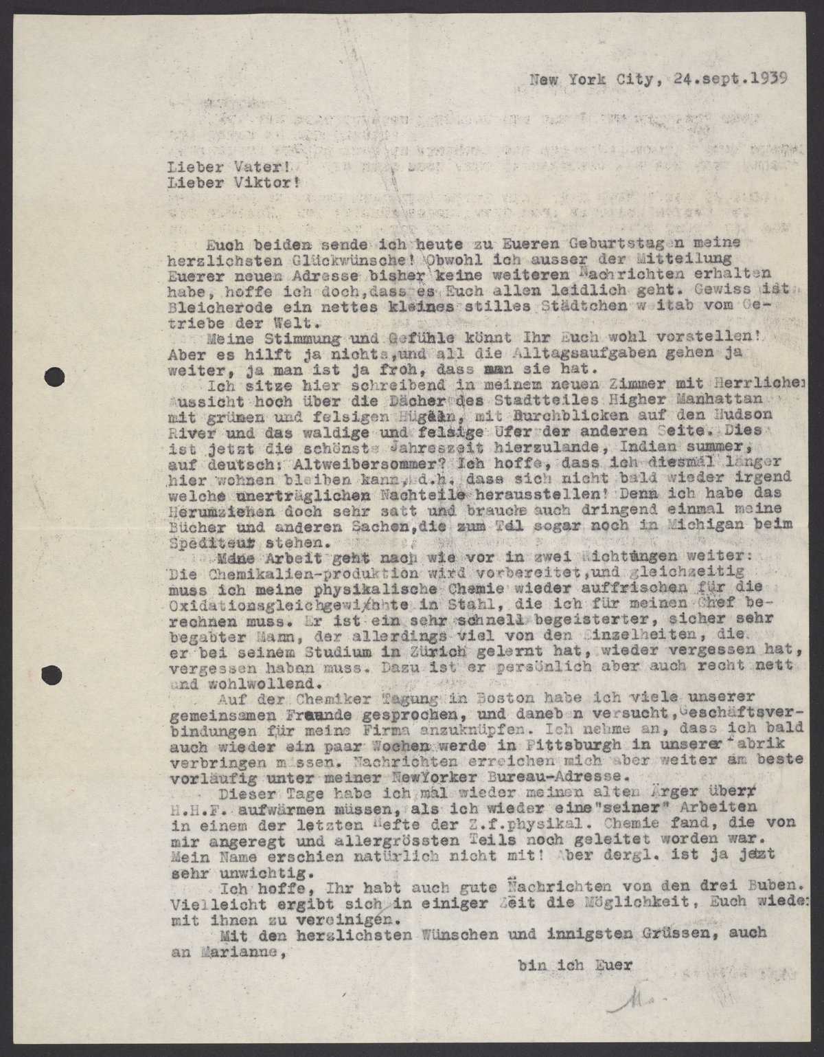 Max Albert Bredig (1902-1977) writes to his father, Georg Bredig (1868-1944), and brother-in-law, Viktor Homburger (1888-1968) about his life in New York City. Max describes where he lives and tells of his work. Max expresses his frustration with his former supervisor, Hans Heinrich Franck (1888-1961), from the Bavarian Nitrogen Works, for not crediting him for his work in one of his latest articles.