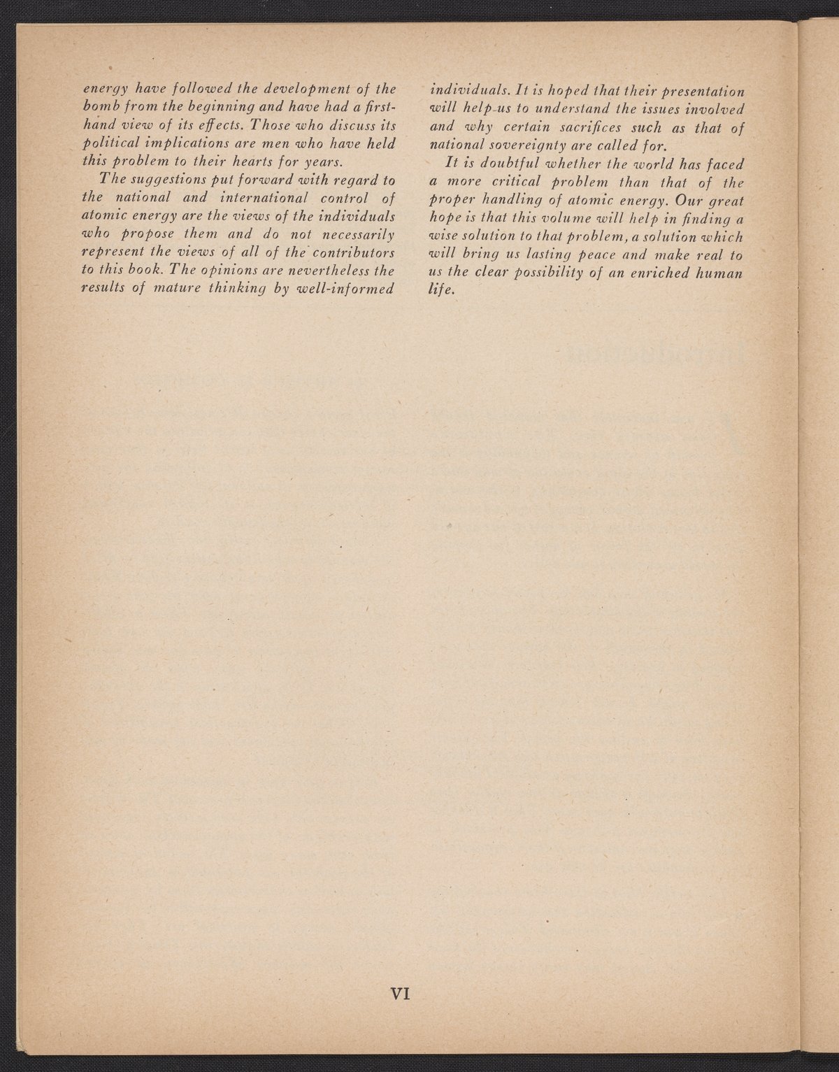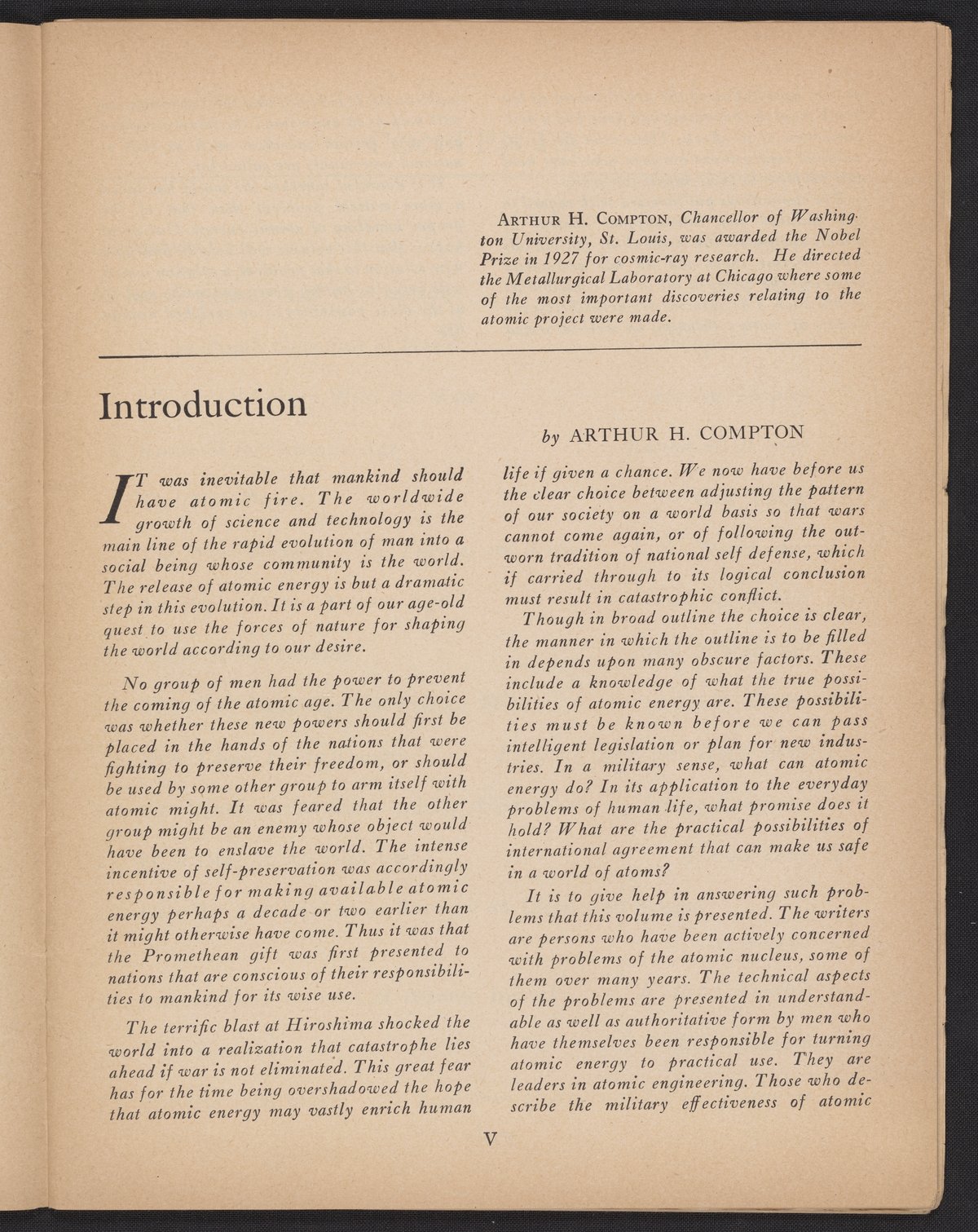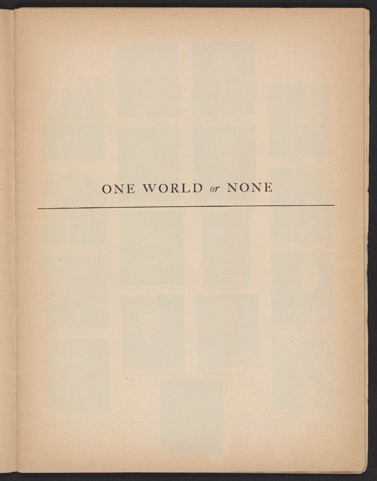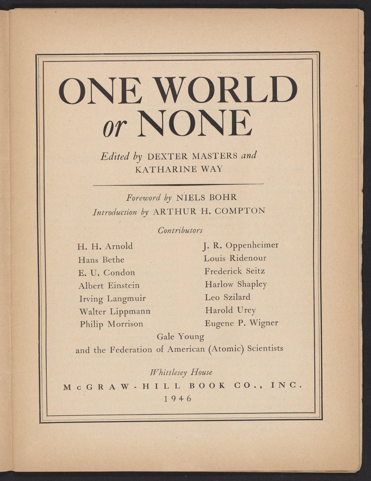 Small JPG1200 x 1554px — 335 KBLarge JPG2880 x 3729px — 1.7 MBFull-sized JPG5421 x 7019px — 5.0 MBOriginal fileTIFF — 5421 x 7019px — 109 MBOne World or None: A Report to the Public on the Full Meaning of the Atomic Bomb, edited by Dexter Masters and Katherine Way. Forward written by Niels Bohr and introduction by Arthur H. Compton. The cover and introduction have been digitized.
