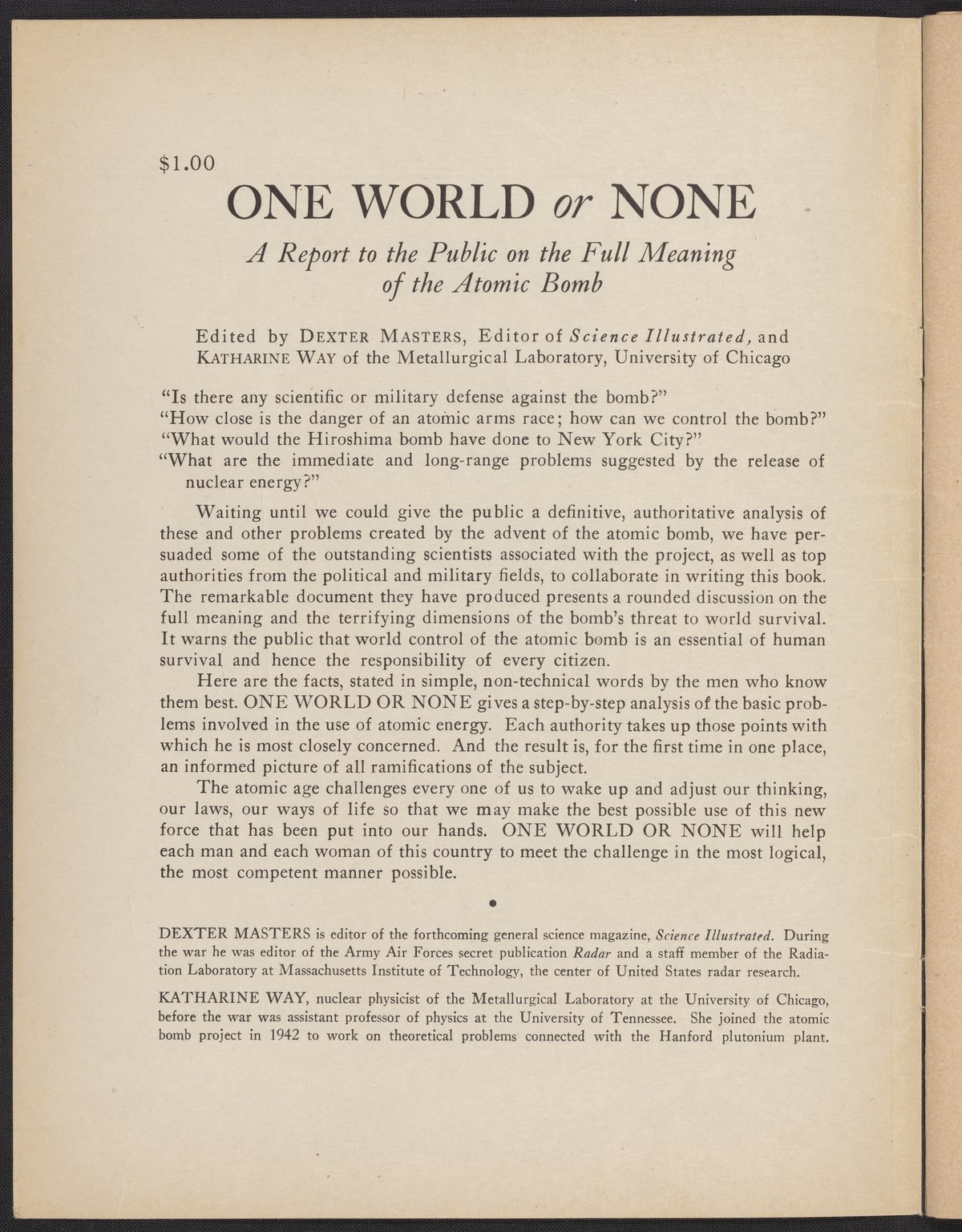 “One World or None: A Report to the Public on the Full Meaning of the Atomic Bomb.” New York, New York: McGraw-Hill Book Company, 1946. Papers of Spofford Grady English, Box 1, Folder 35, 40. Science History Institute. Philadelphia. https://digital.sciencehistory.org/works/a6p49un.