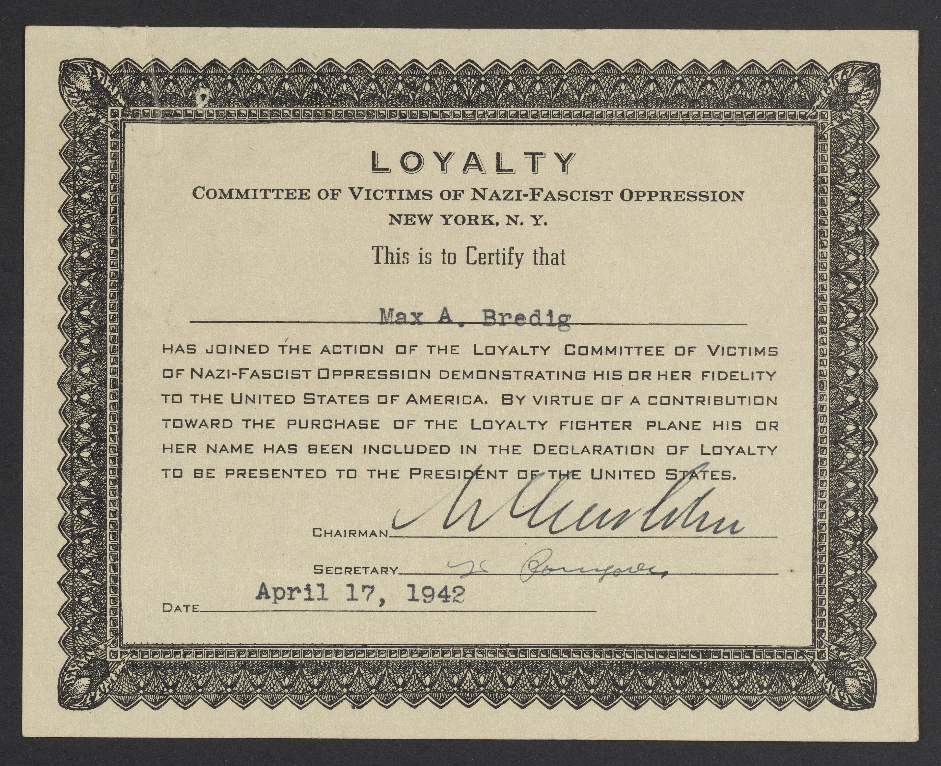 Membership certificate for the Loyalty Committee of Victims of Nazi and Fascist Oppression