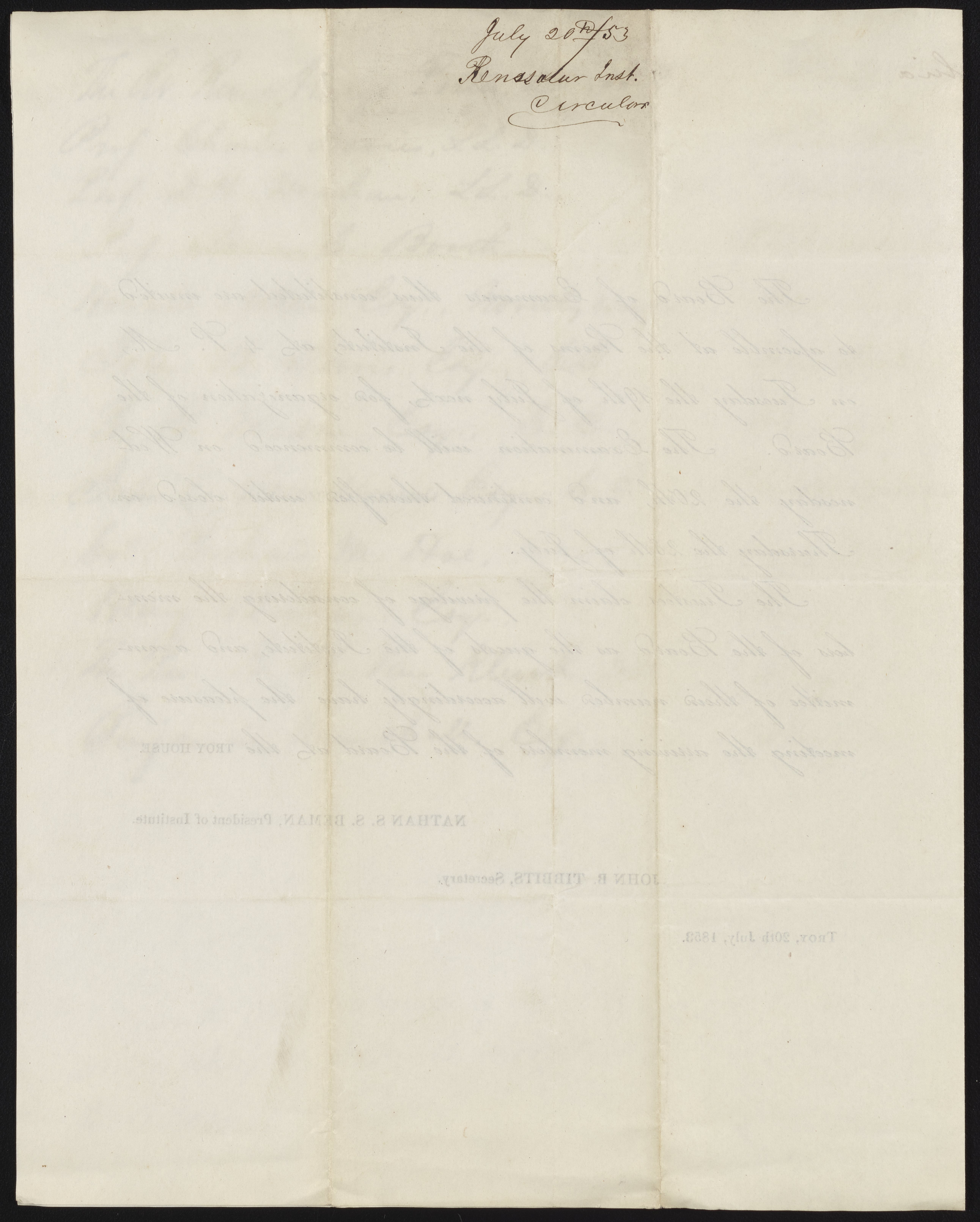 Rensselaer Polytechnic Institute. “Letter from the Rensselaer Polytechnic Institute to James Curtis Booth,” July 20, 1853. Papers of James Curtis Booth, Box 8, Folder 10. Science History Institute. Philadelphia. https://digital.sciencehistory.org/works/a8ofe3d.