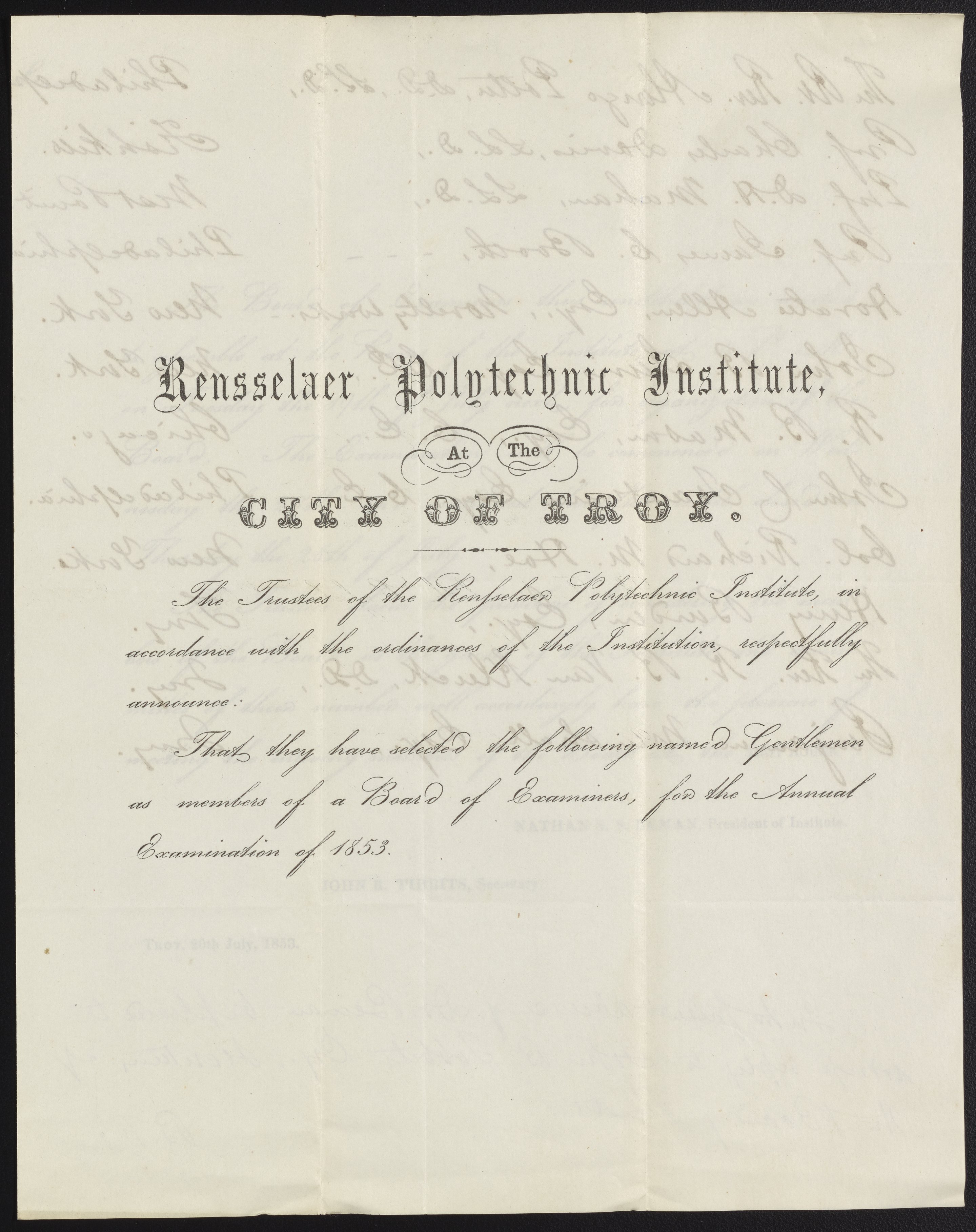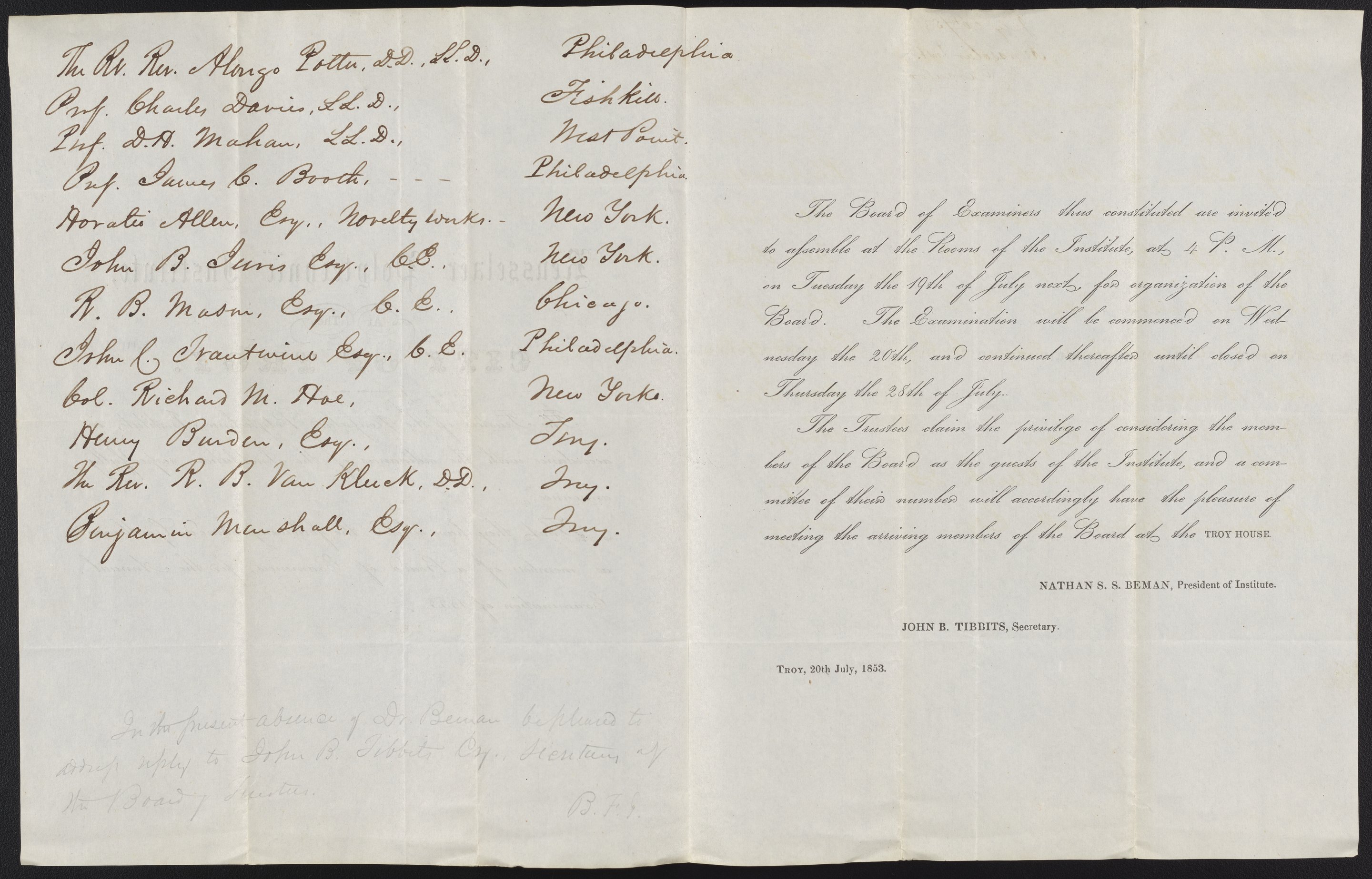Small JPG1200 x 1514px — 201 KBLarge JPG2880 x 3633px — 1.1 MBFull-sized JPG5140 x 6484px — 3.3 MBOriginal fileTIFF — 5140 x 6484px — 95.4 MBAn announcement that James Curtis Booth (1810-1888) and others have been elected to the Board of Examiners for the Rensselaer Polytechnic Institute Annual Examination of 1853.