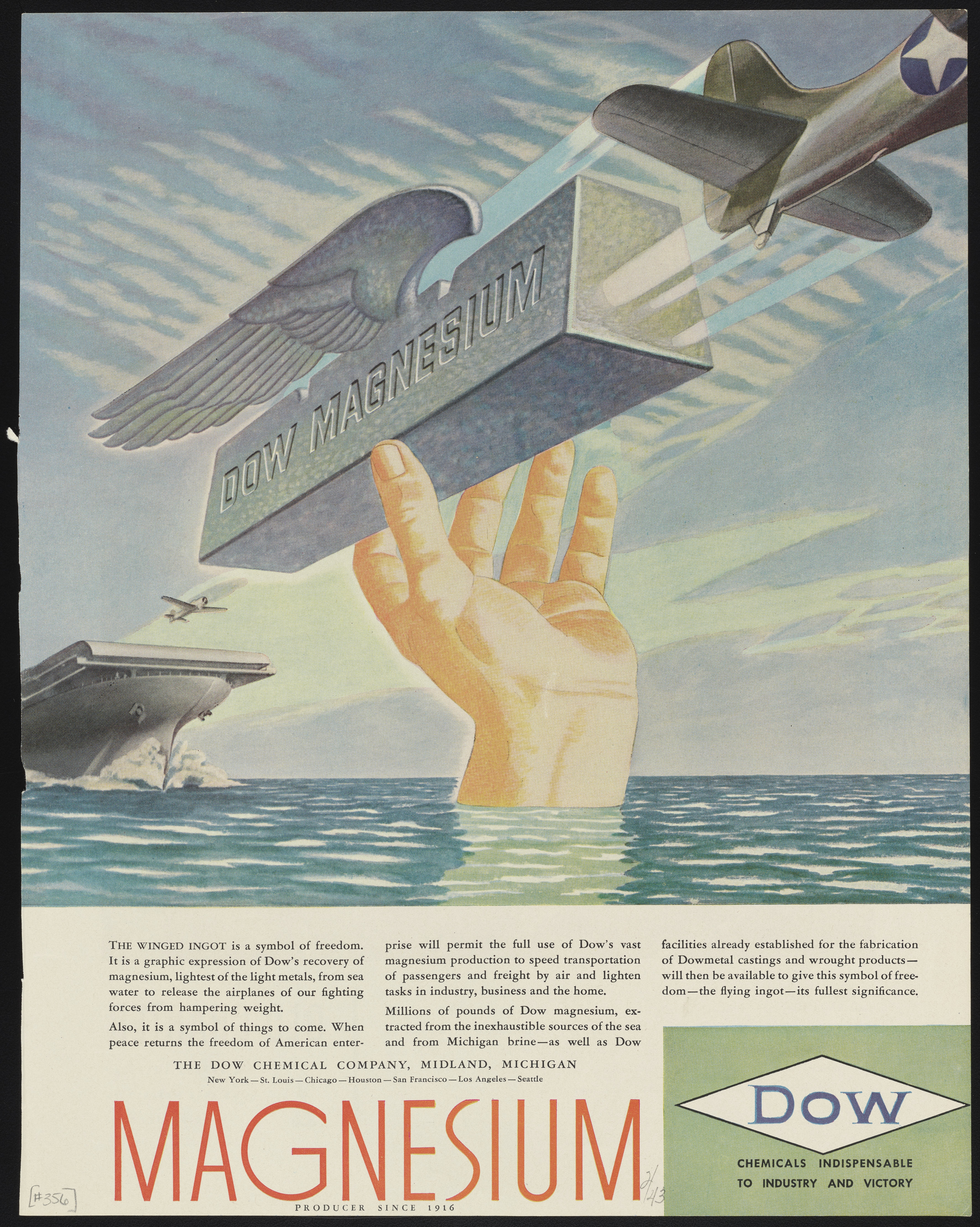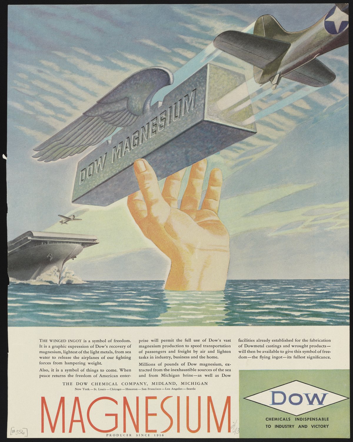 Dow Chemical Company. “Advertisement for Dow Magnesium,” 1943. Advertisements from the Dow Chemical Historical Collection, Box 8. Science History Institute. Philadelphia. https://digital.sciencehistory.org/works/aaaq7mm.