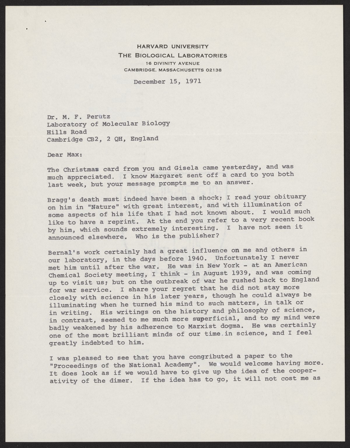 Letter from John T. Edsall to Max Perutz, December 15, 1971