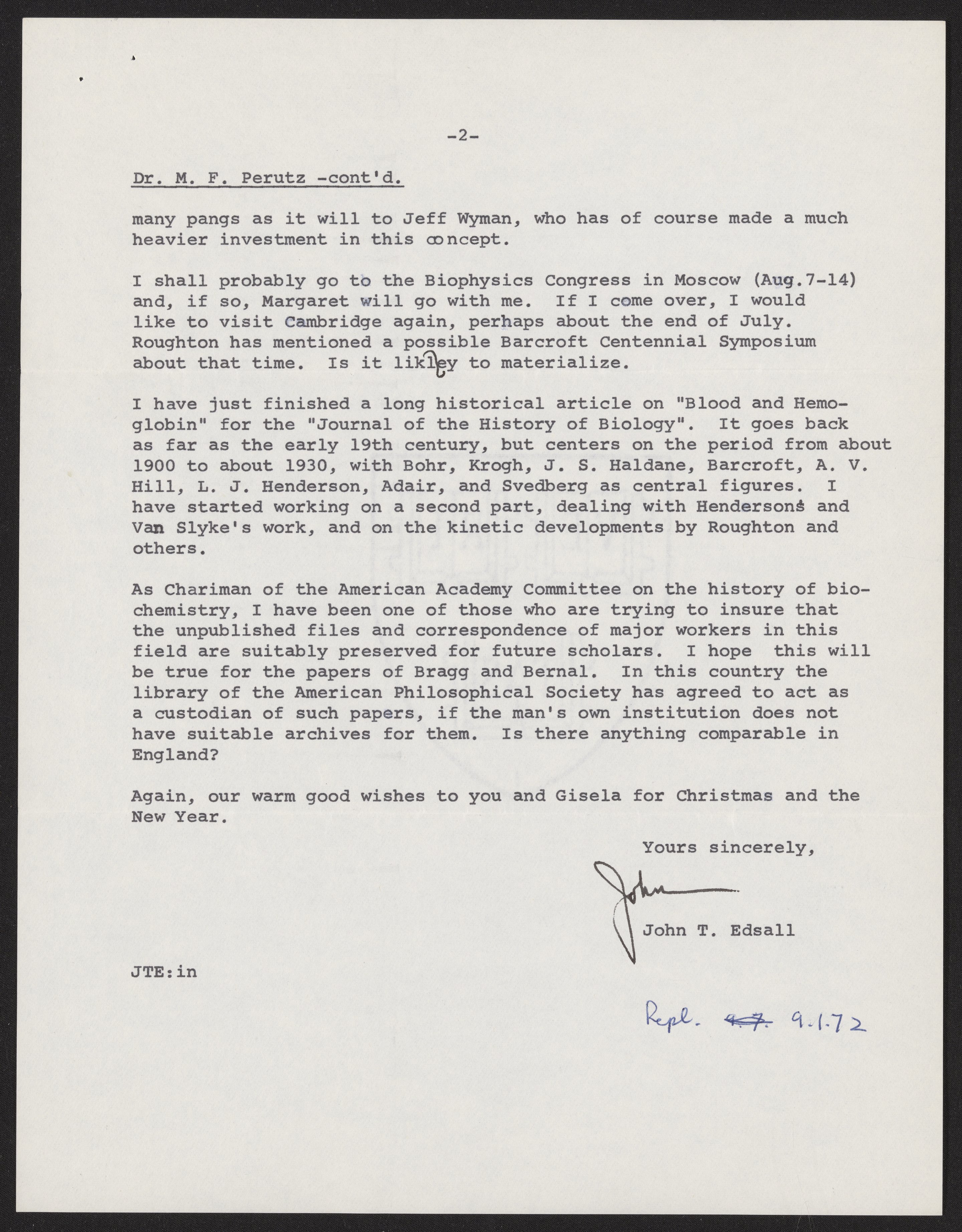 Edsall, John T. (John Tileston). “Letter from John T. Edsall to Max Perutz, December 15, 1971,” December 15, 1971. History of Molecular Biology Collection, Box 74, Folder 12. Science History Institute. Philadelphia. https://digital.sciencehistory.org/works/ab06wht.