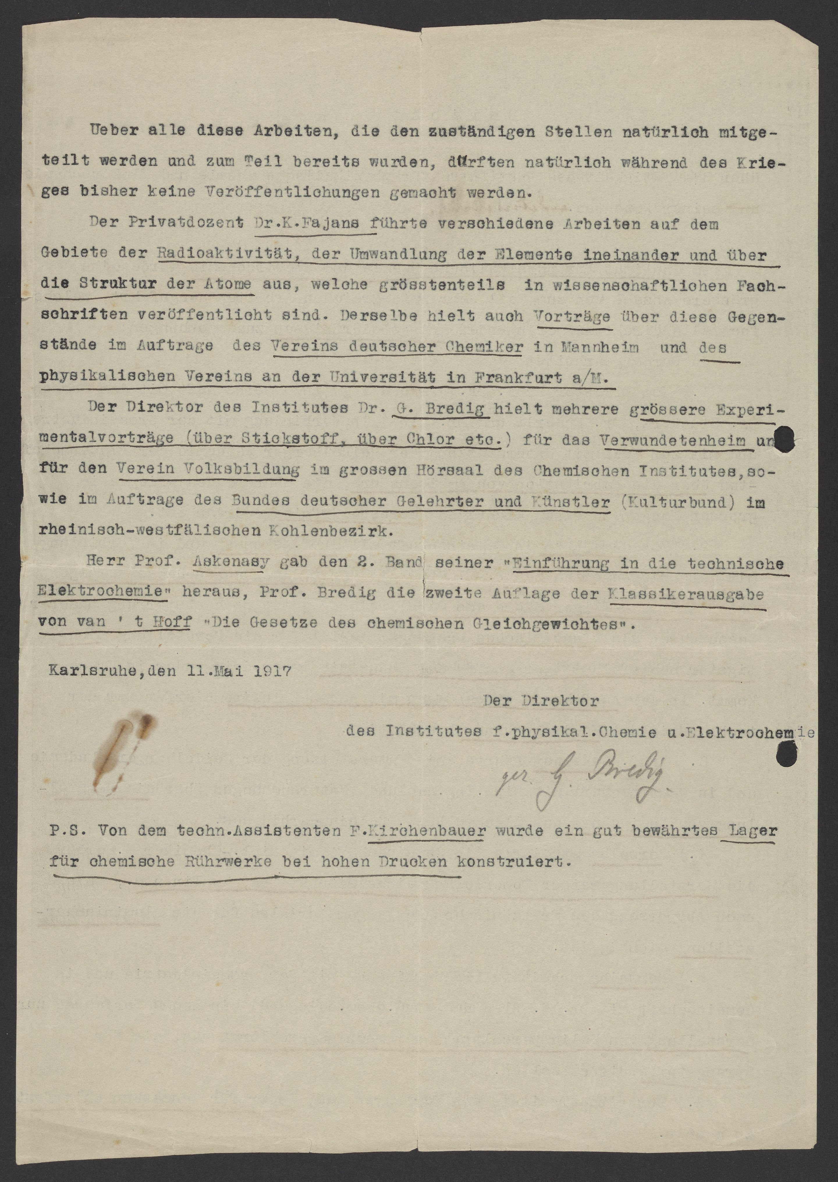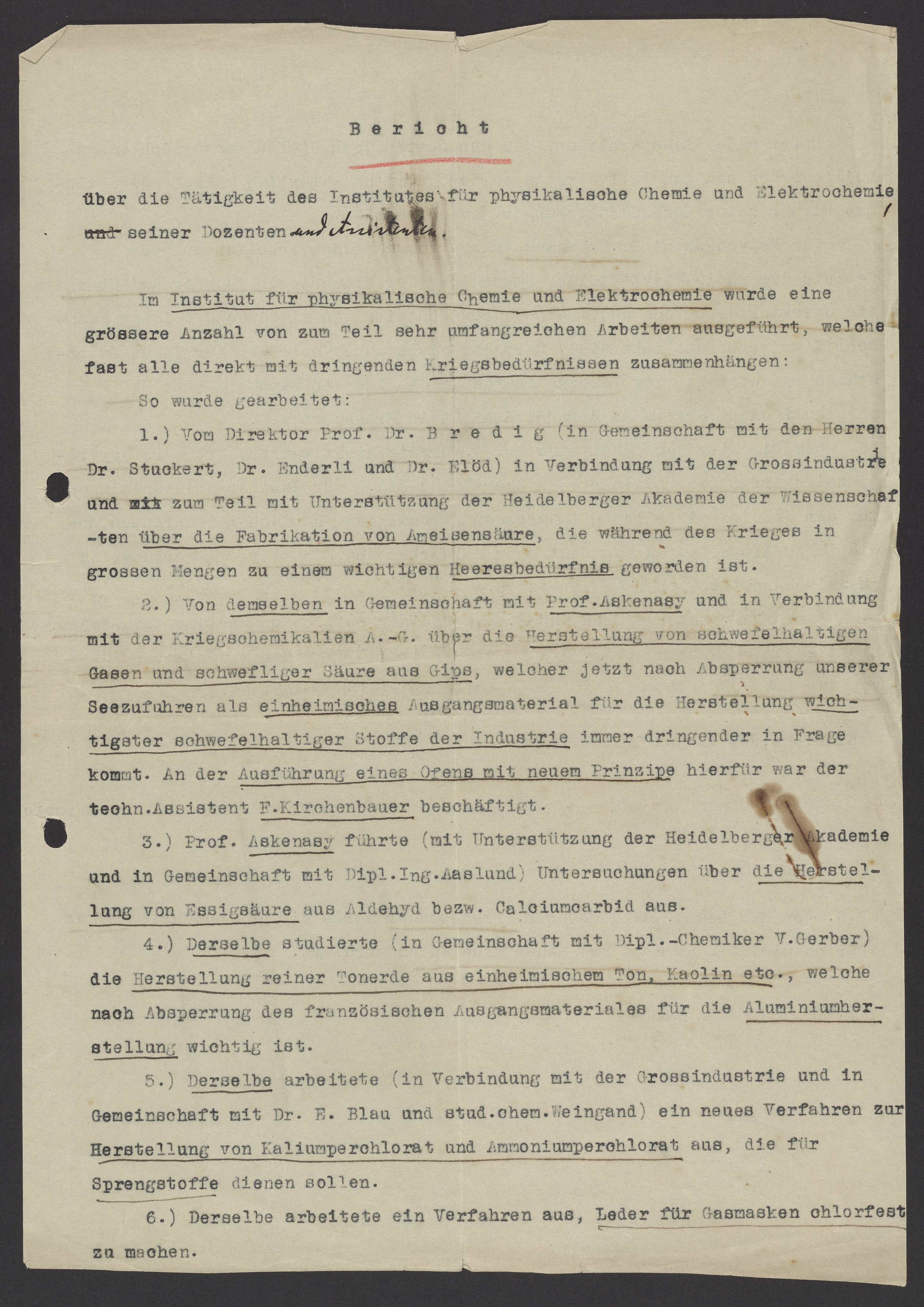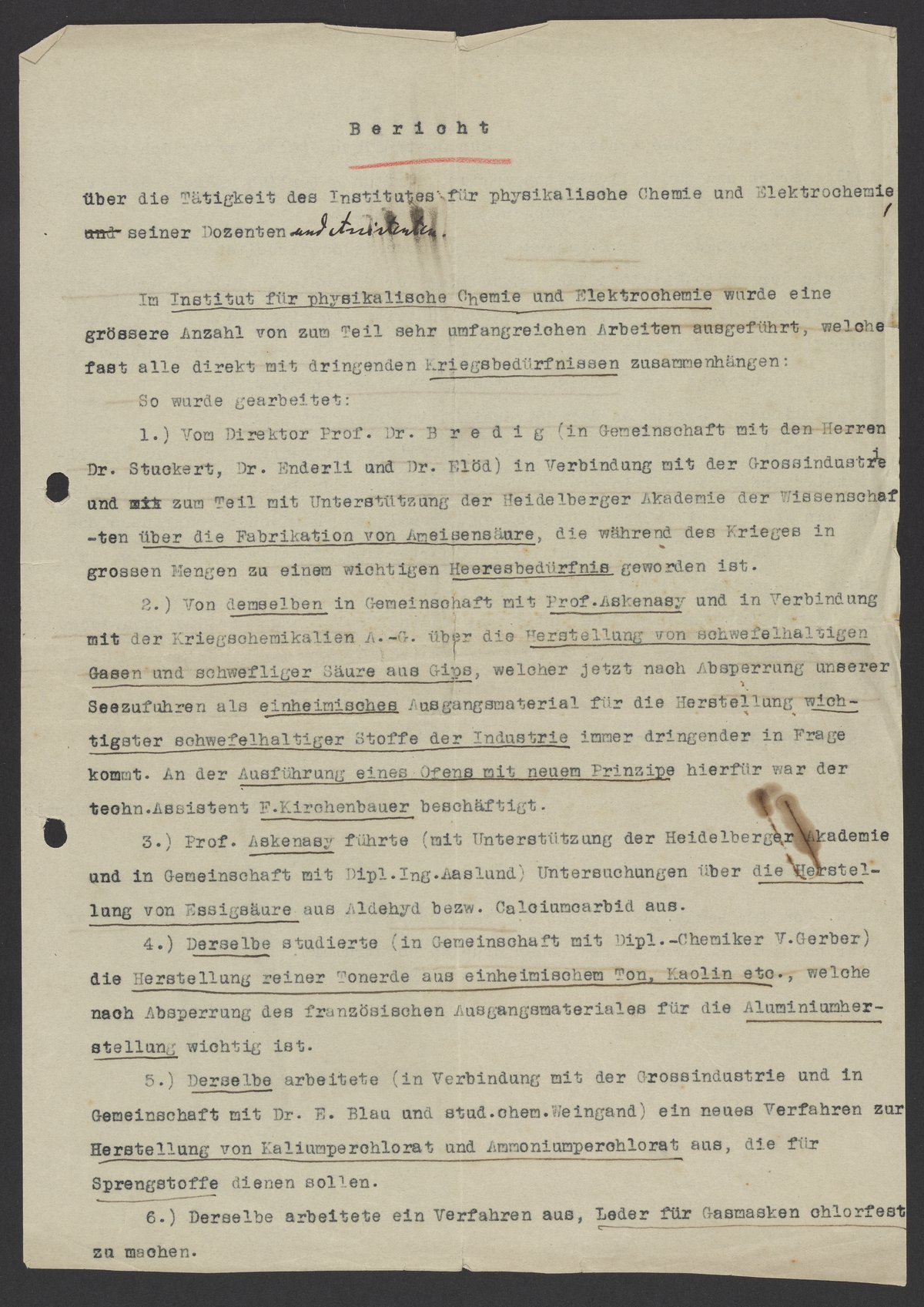 Bredig, Georg. “Über Die Tätigkeit Des Institutes Für Physikalische Chemie Und Elektrochemie Seiner Dozenten Und Tuirtenten,” 1917. Papers of Georg and Max Bredig, Box 5, Folder 1. Science History Institute. Philadelphia. https://digital.sciencehistory.org/works/actytlk.