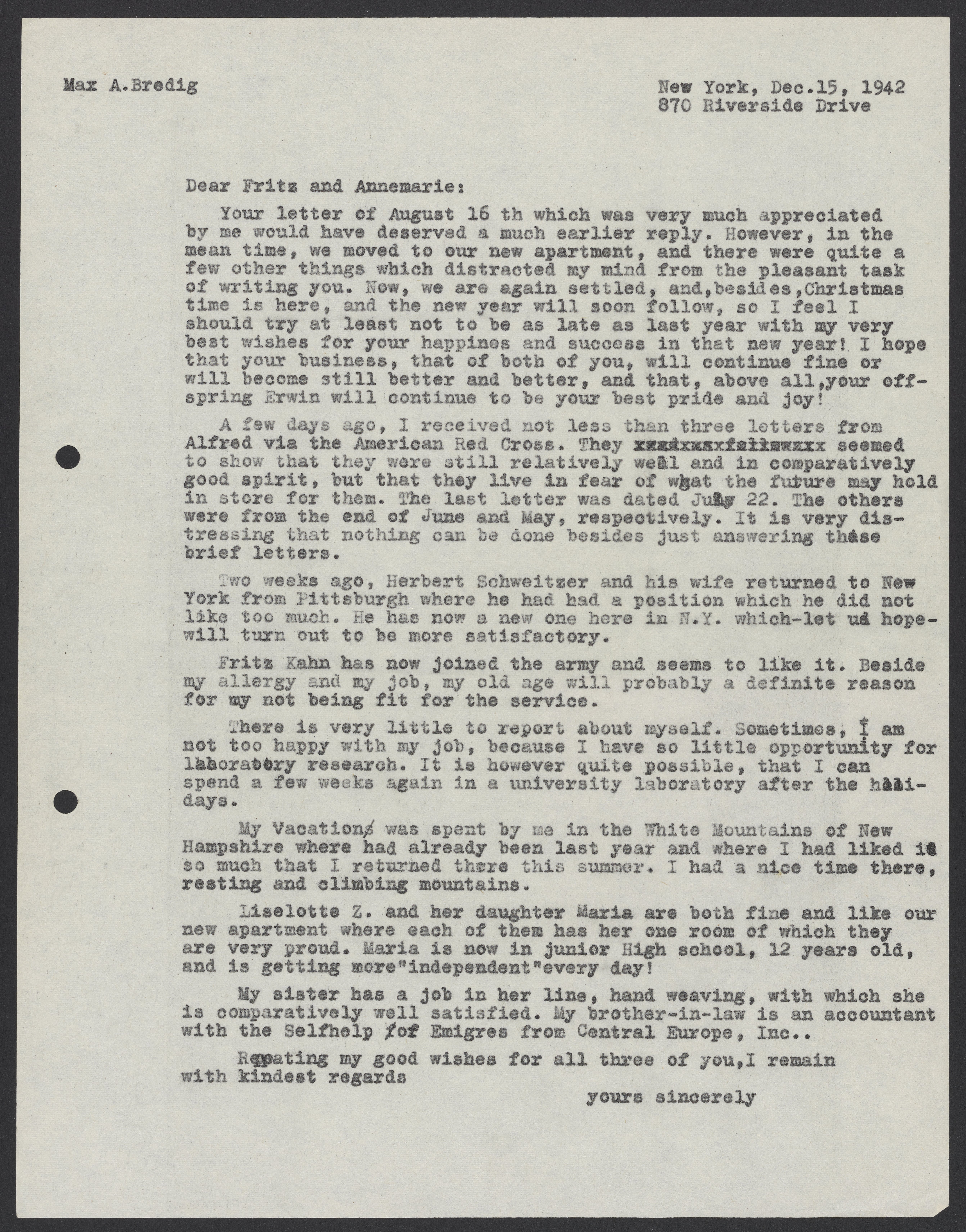 Letter from Max Bredig to Federico and Annemarie Schnell, December 15, 1942