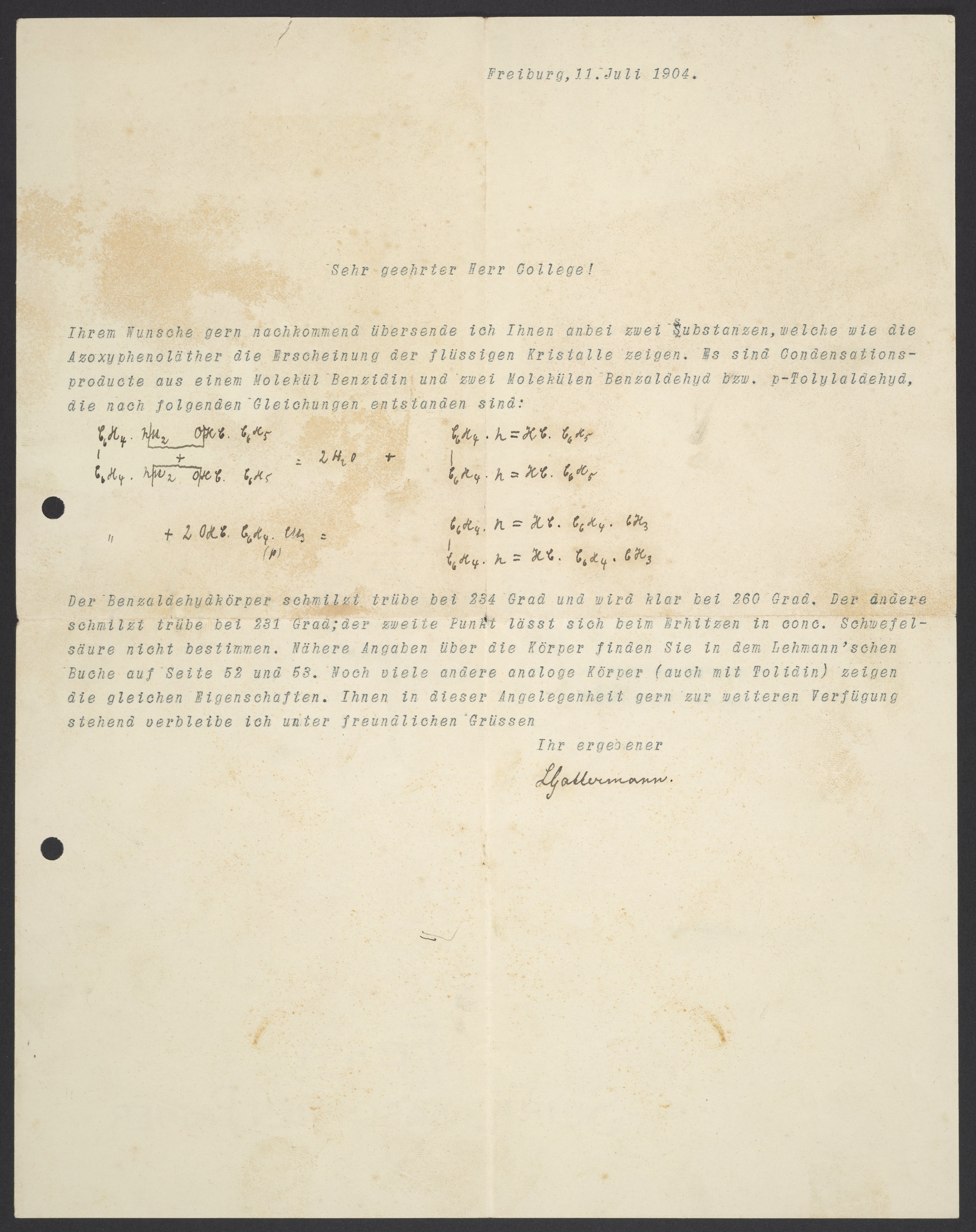 Ludwig Gattermann (1860-1920) writes to Georg Bredig (1868-1944) about substances that show the appearance of liquid crystals, along with chemical equations and a suggestion to look at a book by Otto Lehmann (1855–1922).