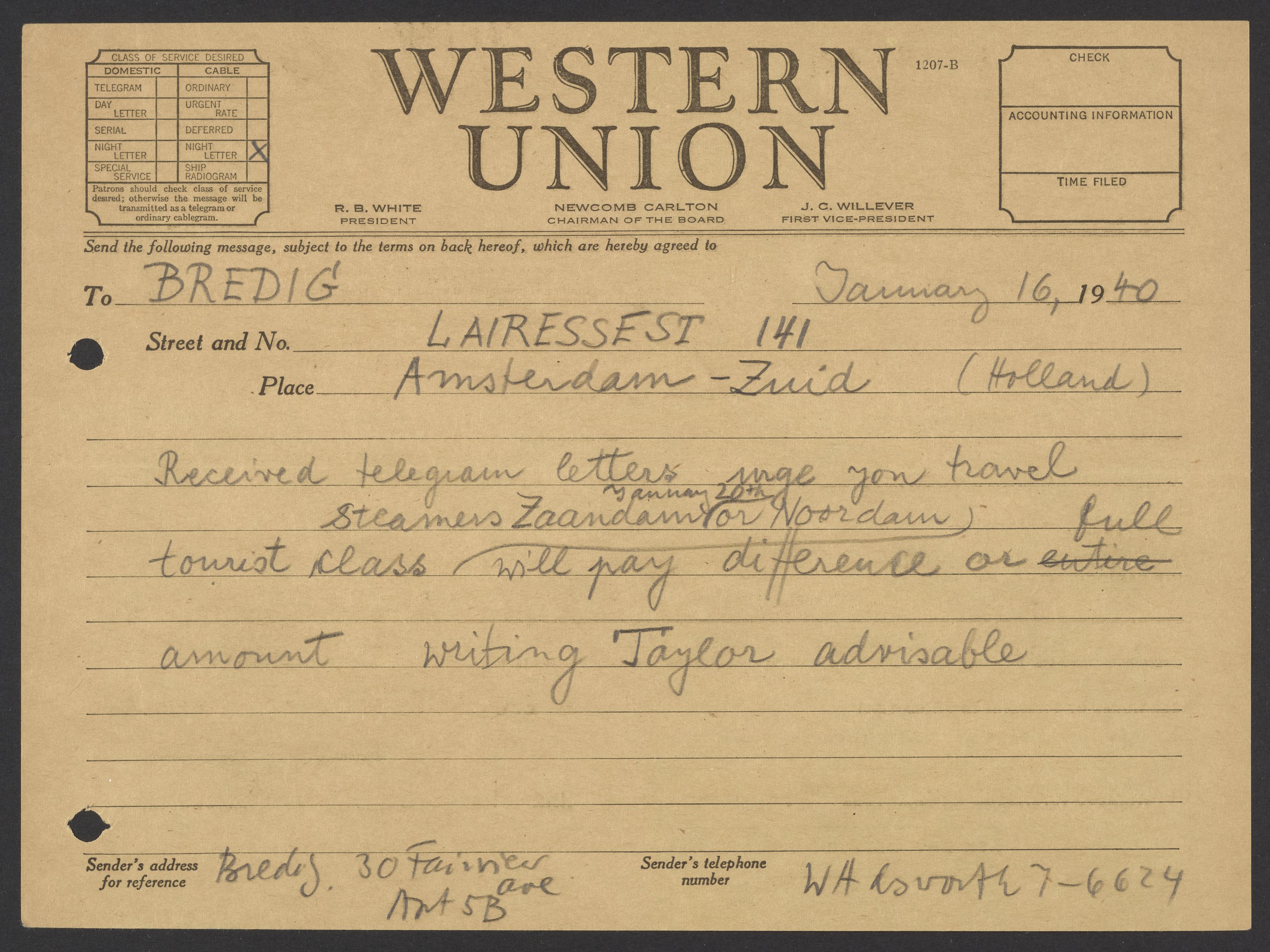 Small JPG1200 x 900px — 191 KBLarge JPG2880 x 2160px — 1.1 MBFull-sized JPG5200 x 3900px — 3.4 MBOriginal fileTIFF — 5200 x 3900px — 58.1 MBTelegram from Max Albert Bredig (1902-1977) to his father Georg Bredig (1868-1944). Max tells his father that he should buy a ticket for January 20th, 1940 from either Zaandam or Noordam.