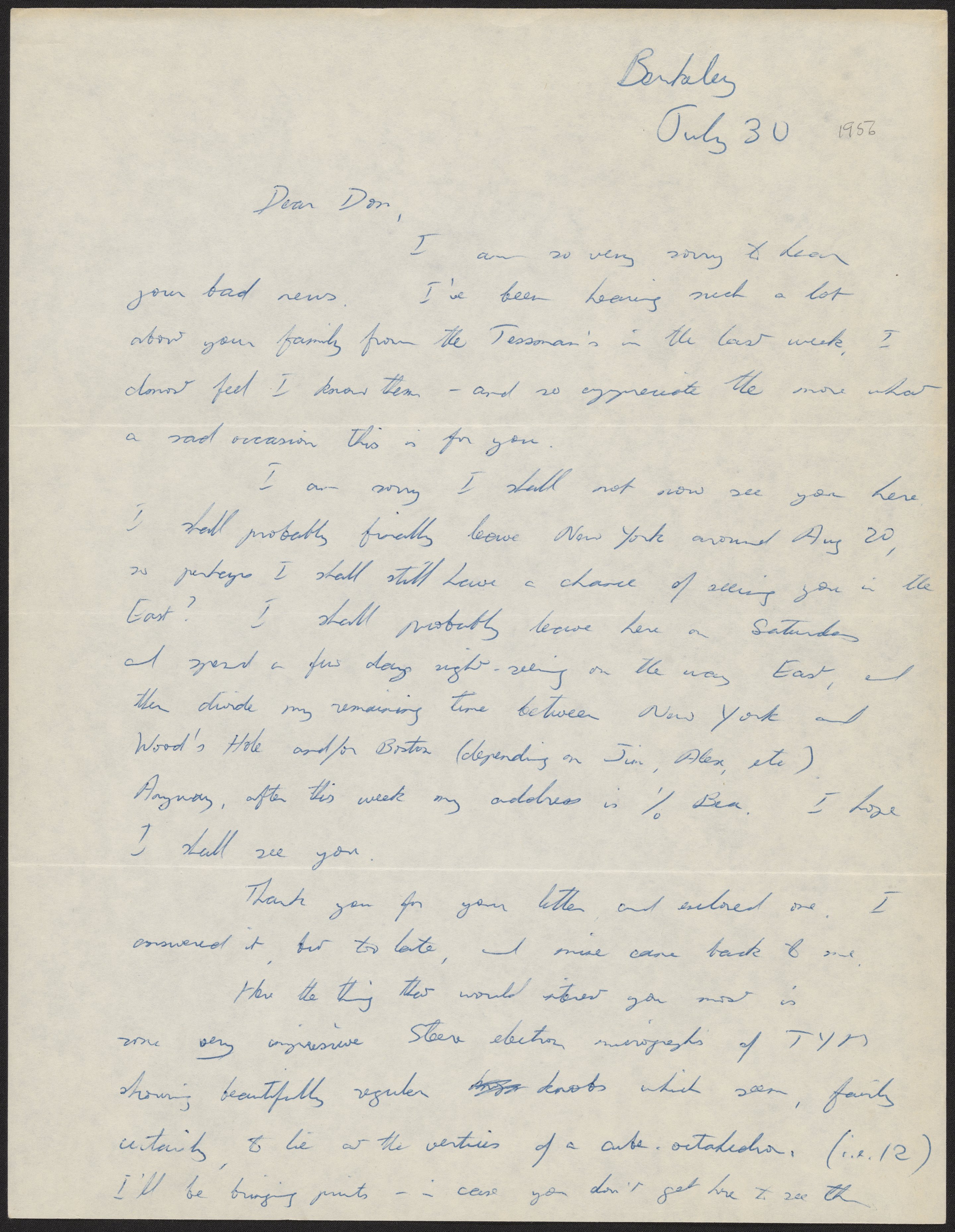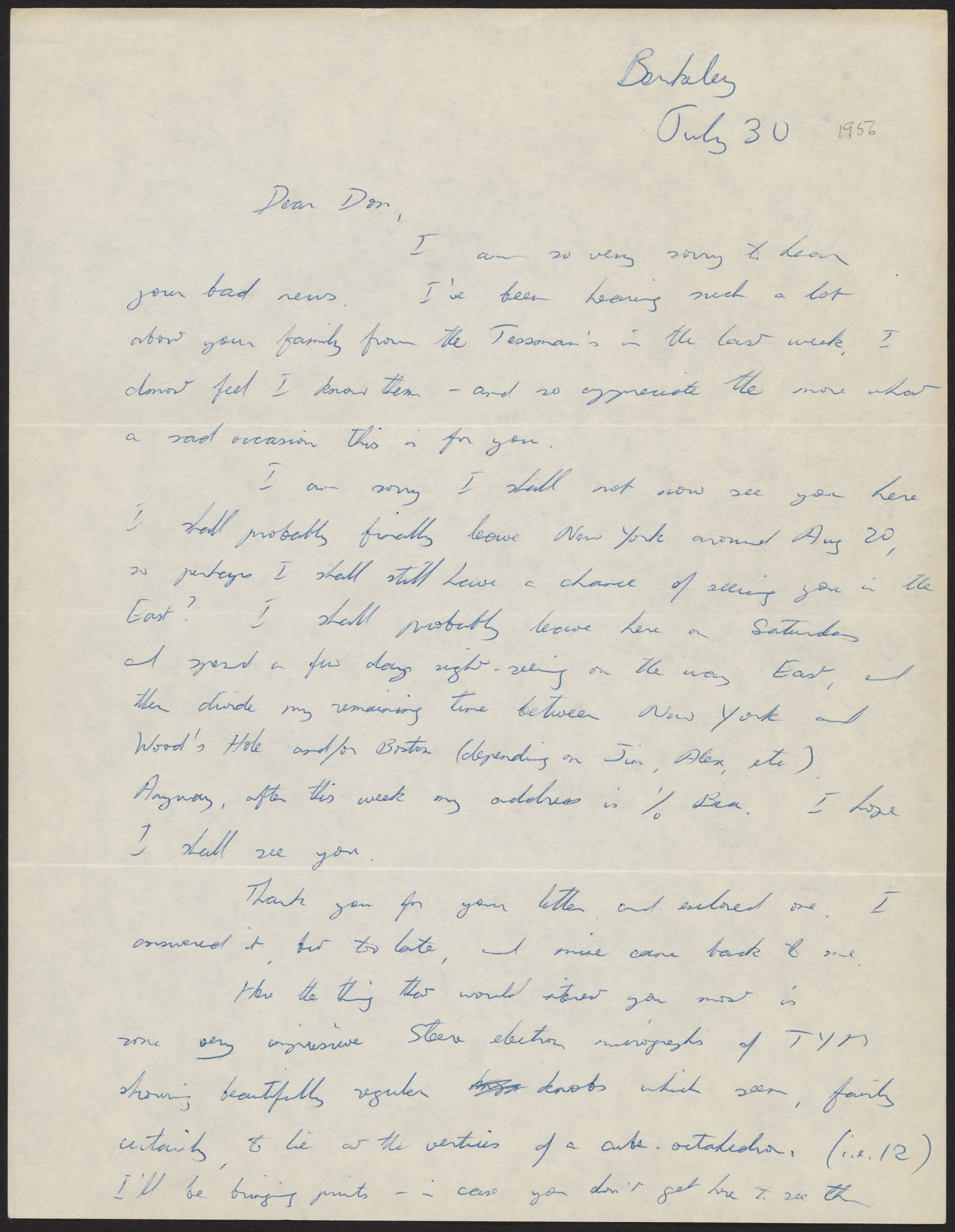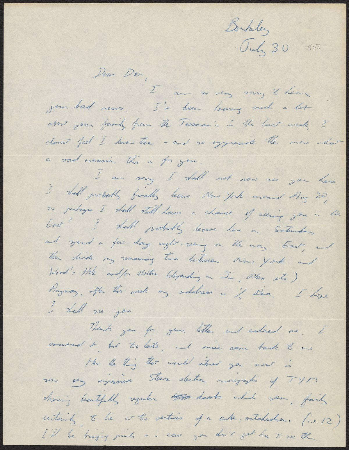 Letter from Rosalind Franklin to Donald Caspar, July 30, 1956
