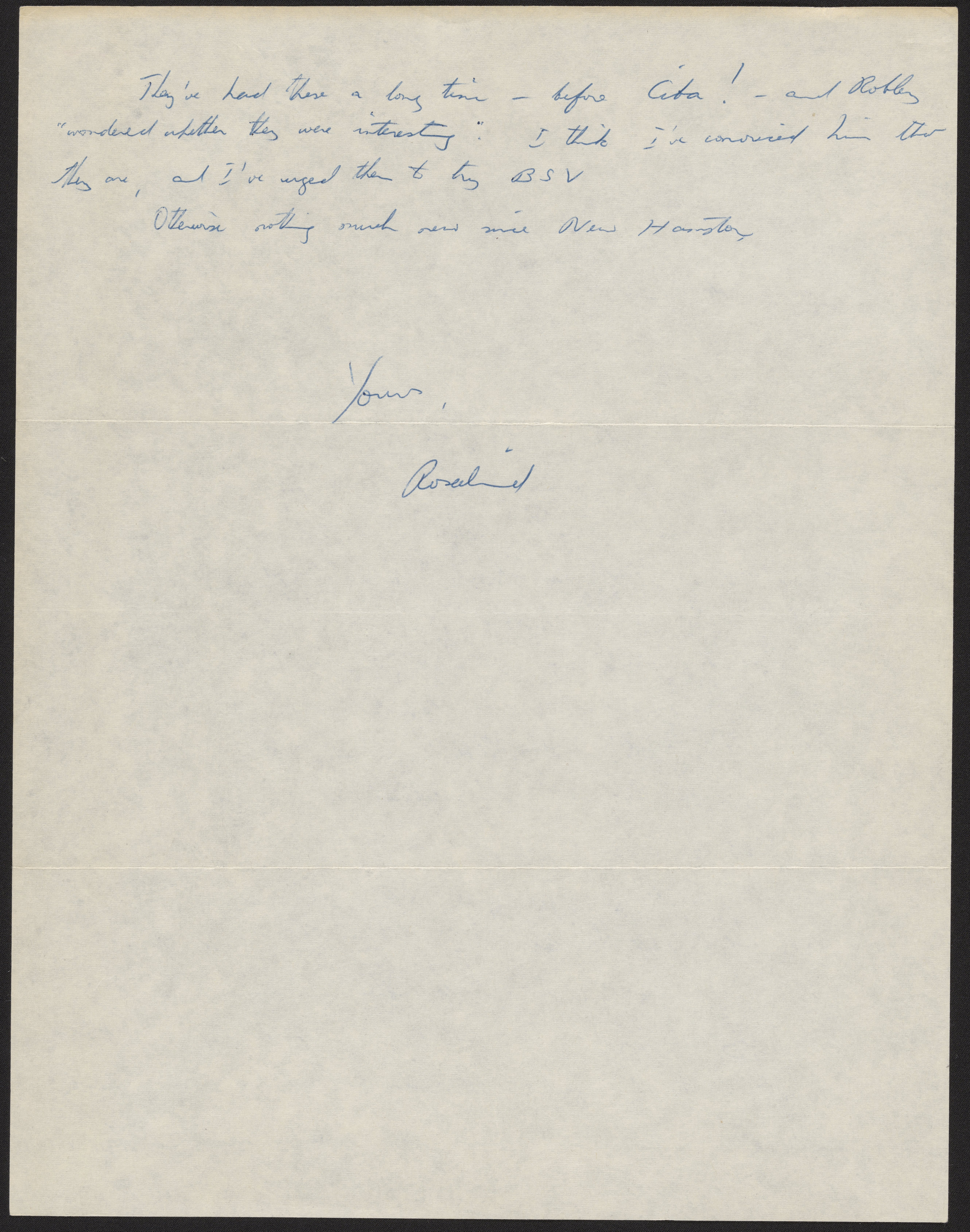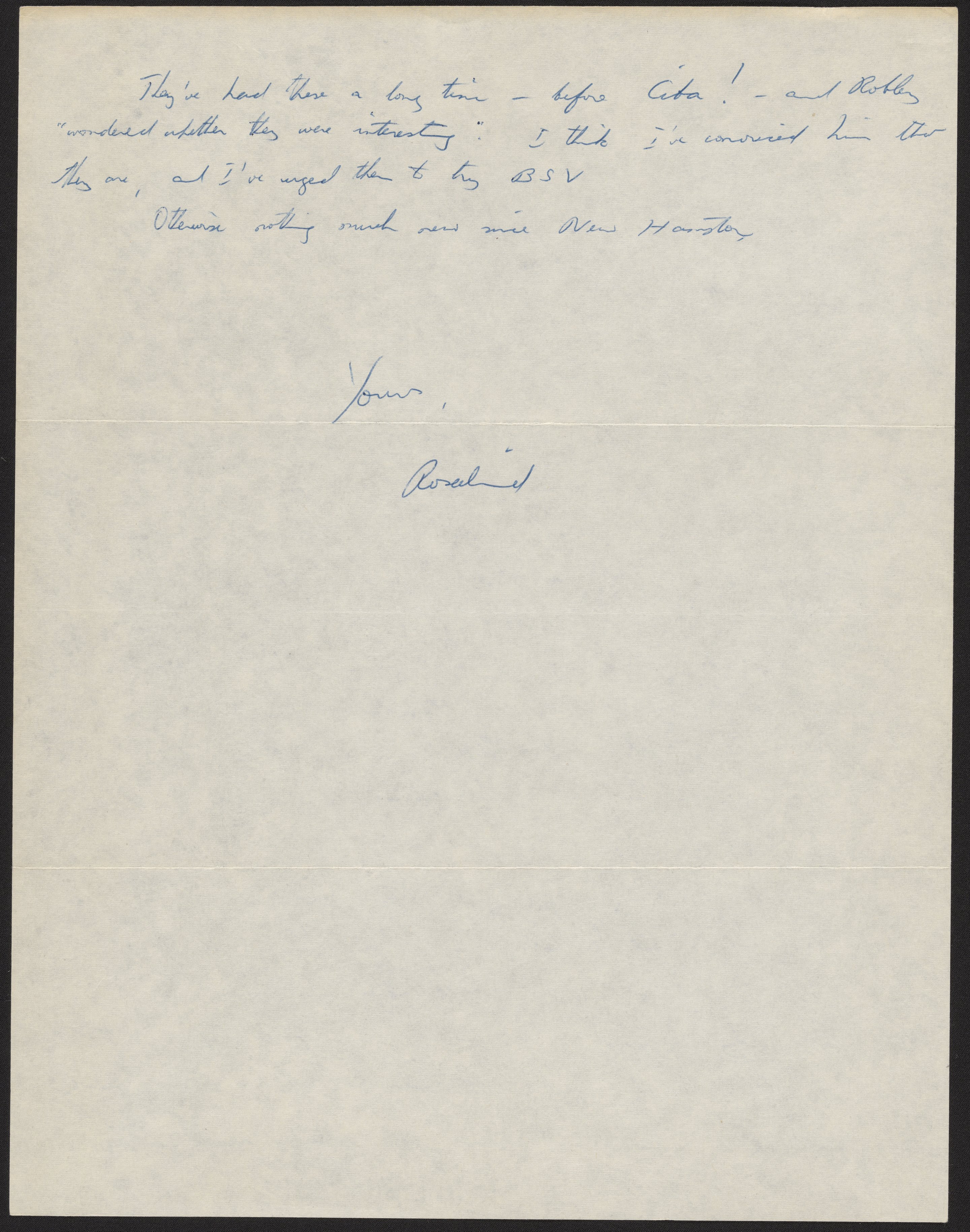 Franklin, Rosalind. “Letter from Rosalind Franklin to Donald Caspar, July 30, 1956,” July 30, 1956. History of Molecular Biology Collection, Box 7, Folder 10. Science History Institute. Philadelphia. https://digital.sciencehistory.org/works/aj9bbwd.