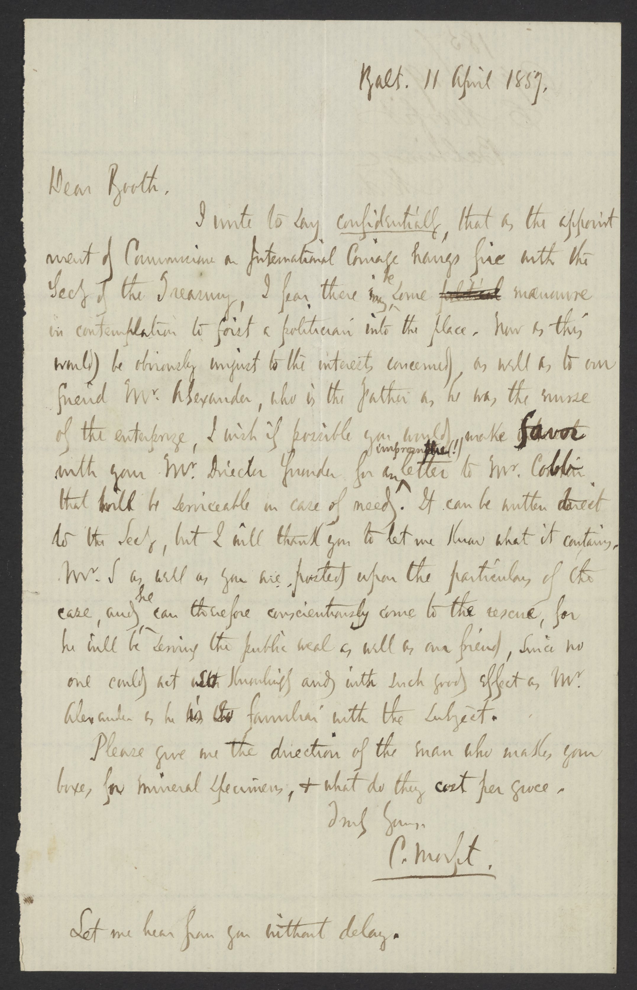 Small JPG1200 x 1866px — 296 KBFull-sized JPG2154 x 3350px — 767 KBOriginal fileTIFF — 2154 x 3350px — 20.7 MBCampbell Morfit (1820-1897), a distinguished chemist from the United States, co-editor with James Curtis Booth (1810-1888) of the Encyclopedia of Chemistry (1850), writes to express a misgiving as to how the new post of Commissioner on International Coinage will be filled.